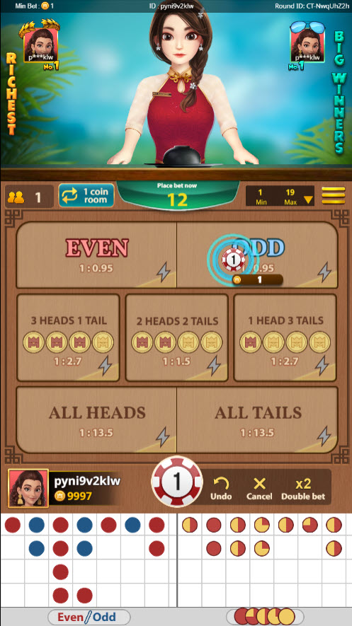 يمكن للاعب المراهنة على أي انقسام بين الوجه والكتابة، بالإضافة إلى احتمال ٥٠/٥٠ على ما إذا كان العدد الإجمالي لكل جانب فرديًا أم زوجيًا. إليك الرهانات المحددة.