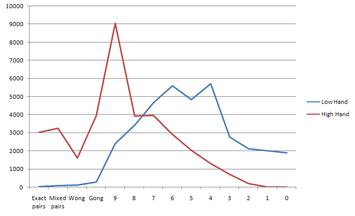 - إذا كان لدى كل من اللاعب والموزع Wong أو Gong أو 1 إلى 9 نقاط، فسيتم كسر التعادل وفقًا لليد التي تحتوي على البلاطة الأعلى مرتبة.