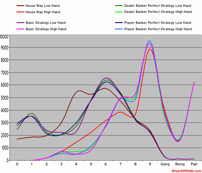 يوضح الرسم البياني التالي عدد مرات تكوين كل نوع من أنواع الأيدي بطريقة منزل Foxwoods، بالإضافة إلى الاستراتيجية المثالية والاستراتيجية الأساسية (بما في ذلك الاستثناءات) عندما يقوم الموزع بالمراهنة وعندما يقوم اللاعب بالمراهنة: