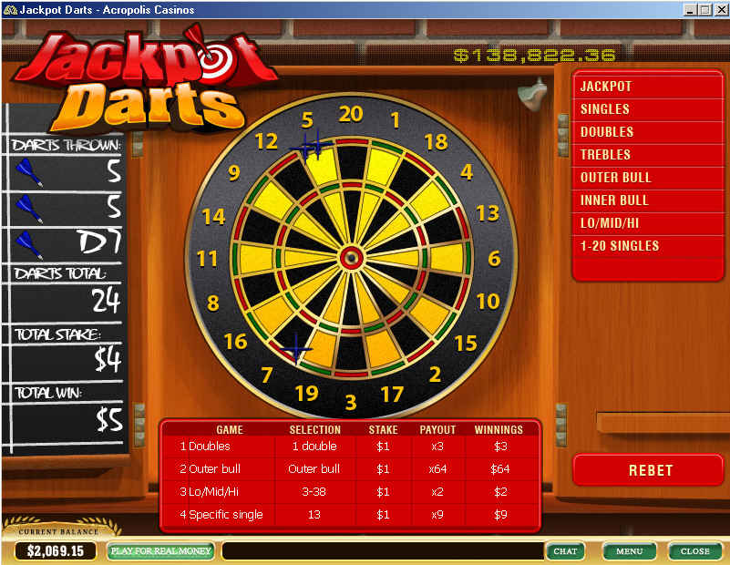 في لقطة الشاشة أعلاه، راهنت بمبلغ 1 دولار على أن سهمًا واحدًا فقط سيسقط في الدائرة المزدوجة (والذي ربح 3 دولارات)، و1 دولار على أن سهمًا واحدًا على الأقل سيصيب عين الثور الخارجية (والذي خسرت)، و1 دولار على إجمالي 3 إلى 38 (والذي ربحت 2 دولار)، و1 دولار على الرقم 13 (والذي خسر).