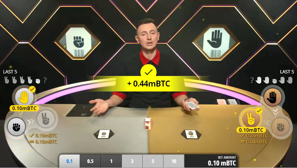 في الصورة أعلاه، راهنتُ بمبلغ 0.1 ملي بيتكوين (ملي بيتكوين يساوي 1/1000 من بيتكوين) على الورق لليد الفضية، وعلى المقص لليد الذهبية. سحب الموزع حجرًا على اليد الفضية، وورقة على اليد الذهبية. نتج عن ذلك ربحٌ في كلتا اليدين. يُدفع ربحٌ على اليد الفضية 1.9 للواحدة، وربحٌ على اليد الذهبية 2.5 للواحدة. بلغ إجمالي ربحي 4.4 وحدة رهان. وبما أن وحدة رهاني كانت 0.1 ملي بيتكوين، فقد استرددت 0.44 ملي بيتكوين. من هذه الـ 0.2، استرددت رهاناتي الأصلية وربحتُ 0.24.