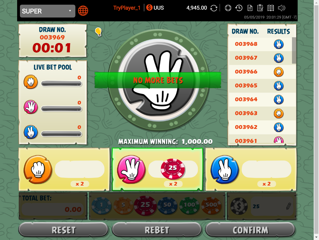 يختار اللاعب حجرة، ورقة، أو مقص، ويقوم الحاسوب بالمثل. الحجر يتغلب على المقص، والمقص يتغلب على الورقة، والورق يتغلب على الحجرة. إذا تعادلت كلتاهما في النتيجة، يكون الرهان تعادلاً في رهانات الرمية الواحدة. يمكن للاعب أيضاً المراهنة على سلسلة من مباراتين أو ثلاث أو أربع مباريات، حيث يجب عليه الفوز في كل رمية (في حال التعادل يخسر) للفوز بالرهان.