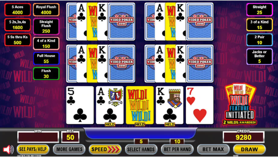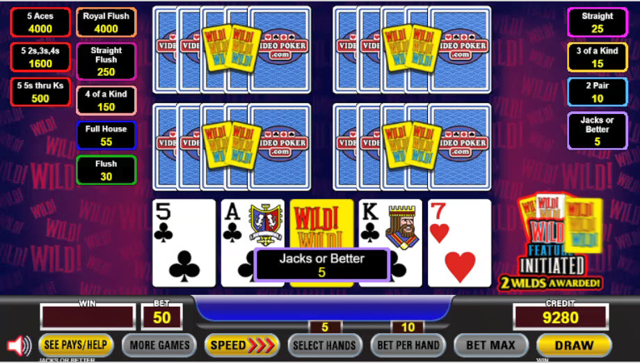Wild! Wild! Wild! هي نسخة من لعبة فيديو بوكر مرتبطة بلعبة فيديو بوكر متعددة اللاعبين. إذا راهن اللاعب بعشرة أرصدة في كل لعبة، ستضيف اللعبة عشوائيًا من بطاقة إلى ثلاث بطاقات جامحة إلى مجموعة أوراقه باحتمالات محددة. تكلفة تفعيل هذه الميزة هي خمسة أرصدة لكل لعبة.