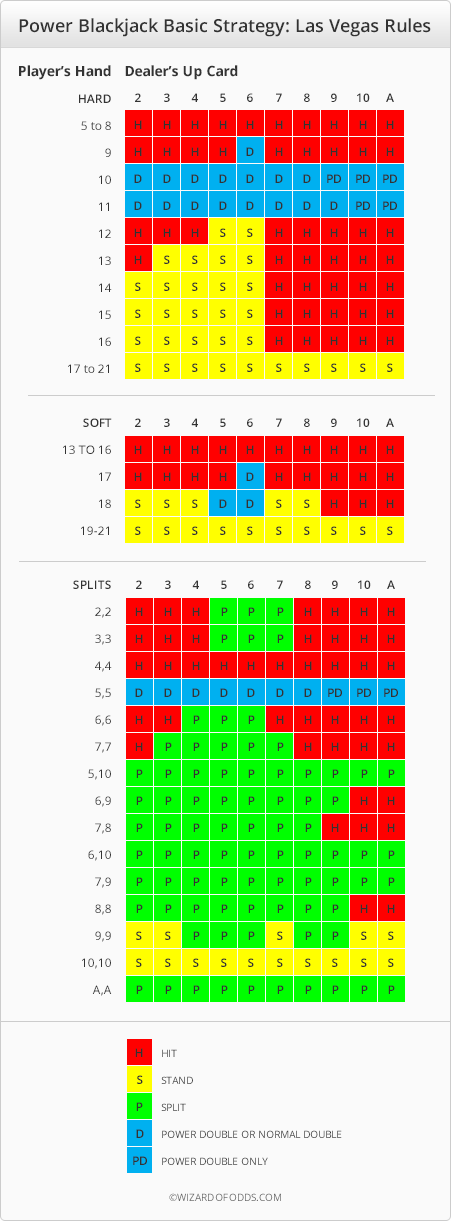 إذا كان لدى اللاعب ثلاث بطاقات أو أكثر، وتقول الاستراتيجية بمضاعفة أو مضاعفة القوة، فاضرب، باستثناء الوقوف على 18 ناعمة إلى 20 ناعمة.