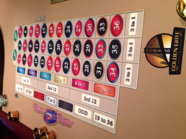 لون رقم أبيض 8 أخضر 2 أحمر 2 أسود 2 أصفر 3 أزرق مخضر 3 لون القرنفل 4 أرجواني 4 أزرق 5 البرتقالي 5 المجموع 38 - في مخطط الرهان، توجد حقول للمراهنة على الألوان التالية: الأصفر، والأزرق المخضر، والوردي، والبنفسجي، والأزرق، والبرتقالي. يفوز الرهان على أحد هذه الألوان إذا سقطت الكرة باللون المختار قبل أن تسقط باللون الأبيض. أي نتيجة أخرى تُحتسب. يوضح الجدول التالي قيمة كل رهان.