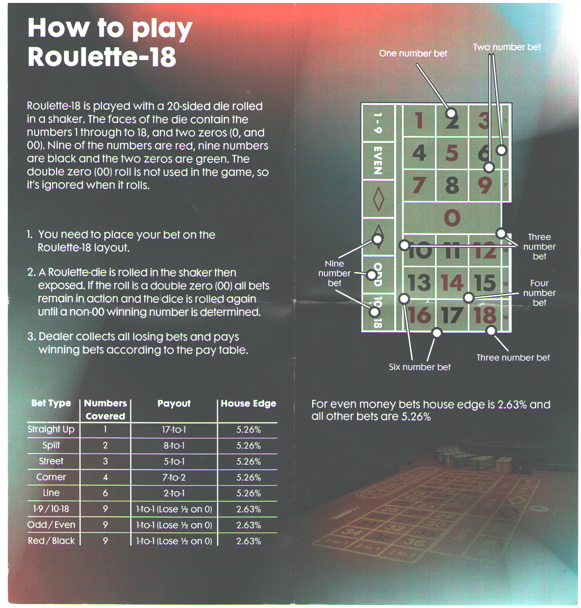 سمعتُ لأول مرة عن لعبة روليت-١٨ في معرض الألعاب العالمي ٢٠١٤. وهي تشبه الروليت، إلا أنها تحتوي على ١٩ نتيجة مختلفة، وتُلعب بمجسم عشروني الوجوه ذي ٢٠ وجهًا بدلًا من العجلة. يمكنك العثور عليها في بعض كازينوهات جروفنور في المملكة المتحدة.