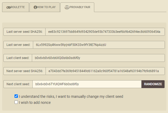 الأمر متروك لك لإضافة رمز Nonce، وهو عبارة عن رموز آلية إضافية تُضاف إلى نهاية بذرة العميل. أعتقد أنه لو كان الكازينو ينوي الغش، فإن إضافة رمز Nonce لن توفر أي حماية.