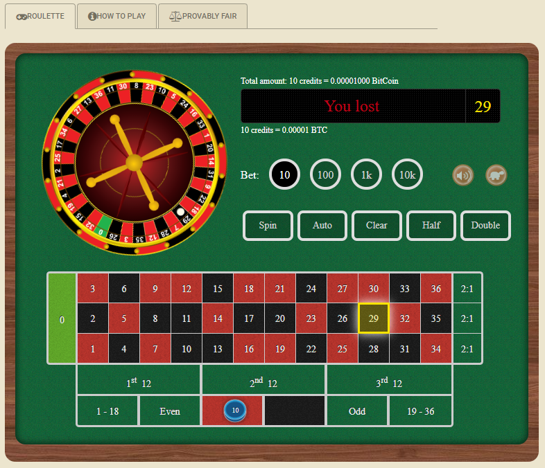 بعد ذلك، راهنتُ، كما هو موضح أعلاه. هنا، راهنتُ بعشرة فيشات، قيمة كل منها 0.000001 بيتكوين (بيتكوين)، ليصبح إجمالي الرهان 0.00001 بيتكوين (ما يعادل حوالي 10 سنتات) على اللون الأحمر.