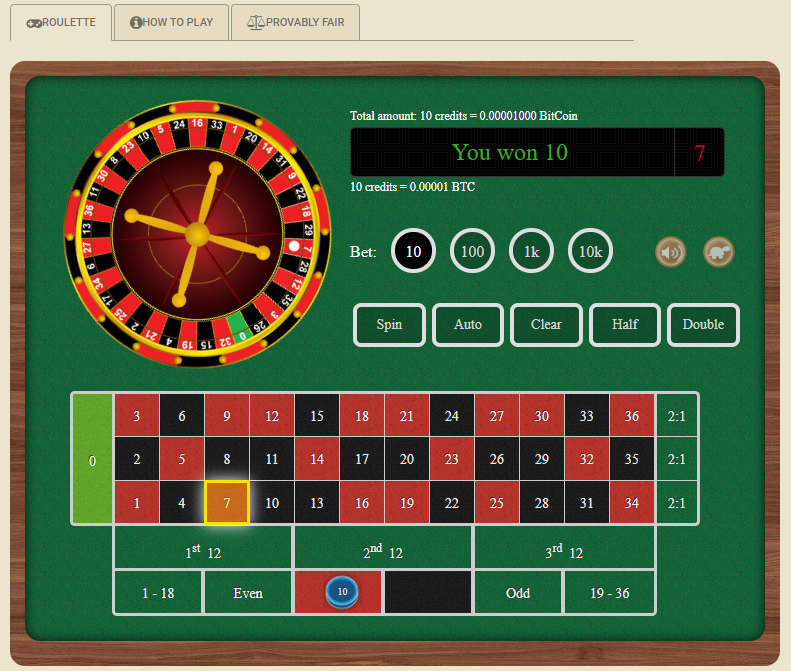 في لعبة Crypto.Games، تُلعب الروليت على عجلة ذات صفر واحد، كما هو الحال عادةً في الكازينوهات الإلكترونية. هامش الكازينو هو ١/٣٧ = ٢.٧٠٪ على كل رهان.اللعب العادل