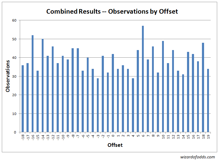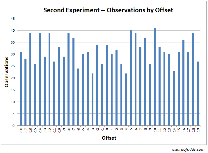 بعد أن تلقيتُ عرضًا تقديميًا من السيد س، انتابني فضولٌ كبيرٌ لمعرفة ما يجري. كخطوةٍ أولى، جمعتُ بيانات 299 دورةً مع شخصٍ آخر مهتمٍّ سأشير إليه بالسيد س. كانت طريقتنا في المراهنة هي المراهنة بدولارين لكلٍّ من خمسة أرقام متتالية. لم يكن السيد س متأكدًا مما إذا كانت 10 دولاراتٍ إجماليةً كافيةً لإثارة القلق في اللعبة، لكنه رأى أنها تُمثّل توازنًا جيدًا بين إثارة غضب اللعبة وعدم خسارة الكثير من المال أثناء إجراء التجربة.