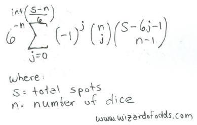 فيما يلي صيغة لعدد s من النقاط على عدد n من النرد، مأخوذة من كتاب نظرية المقامرة والمنطق الإحصائي لريتشارد أ. إبستاين، الصيغة 5-14.