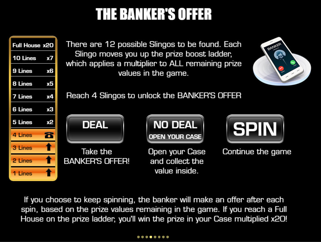 - بعد كل دورة في المرحلة الثانية، إذا قام اللاعب بتغطية أربعة خطوط على الأقل، فإن البدائل لدفع ثمن دورة إضافية هي قبول عرض المصرفي لبيع حالته والخروج أو فتح حالته والاحتفاظ بالمبلغ بالداخل.