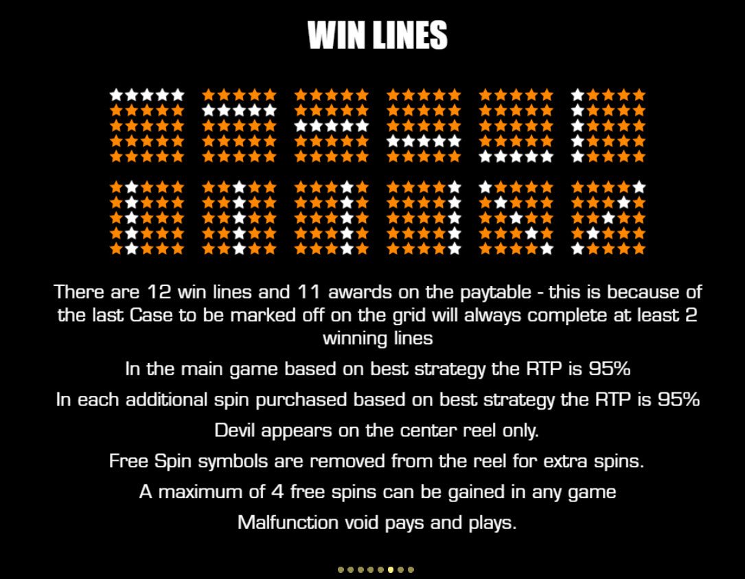تشير شاشات المساعدة إلى أن نسبة العائد للاعب (RTP) تبلغ 95% على جميع الرهانات. يشمل ذلك الرهان الأولي، وقبول عروض الموزع، ورسوم الدورات الإضافية. أعتقد أن هذا صحيح. لولا معرفة احتمالات فوز الجوكر والديفلز والدورات المجانية، لما تمكنت من تحليل اللعبة بنفسي.