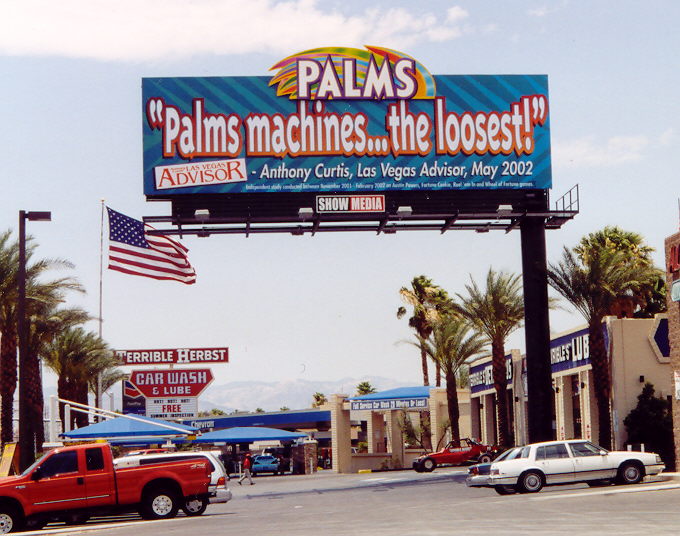 يمكن العثور على اللافتة أعلاه مقابل فندق بالمز. على الرغم من أنني أجريتُ الدراسة التي نشرها أنتوني كورتيس في مجلة لاس فيغاس أدفايزر ، وهو ما جعلها مشهورة. تتضمن علامة "..." في اللافتة معلوماتٍ كثيرة، والتي تم حذفها عن قصد. في الواقع، تشير الدراسة فقط إلى أن فندق بالمز لديه أقل كازينوهات ماكينات القمار بخمسة سنتات من بين الكازينوهات التي شملها الاستطلاع في لاس فيغاس. يقول النص الصغير في الأسفل: "دراسة مستقلة أُجريت بين نوفمبر 2001 وفبراير 2002 على ألعاب أوستن باورز، وفورتشن كوكيز، وريلم إن، وويل أوف فورتشن. لم يُذكر فيها لعبة ليوبارد سبوتس، وبدأت الدراسة في أكتوبر".