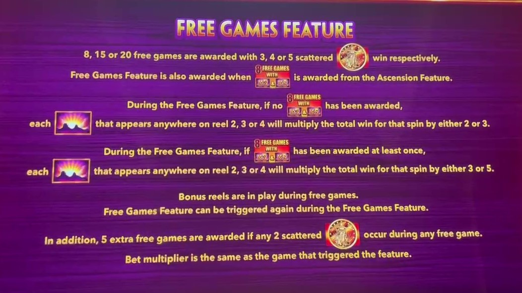 - إذا حصل اللاعب على عملتين ذهبيتين في دورة مجانية، فسيفوز بخمس دورات مجانية أخرى. ويمكنه إعادة تفعيل المكافأة بـ 3 إلى 5 عملات ذهبية مع 8 أو 15 أو 20 دورة مجانية إضافية.