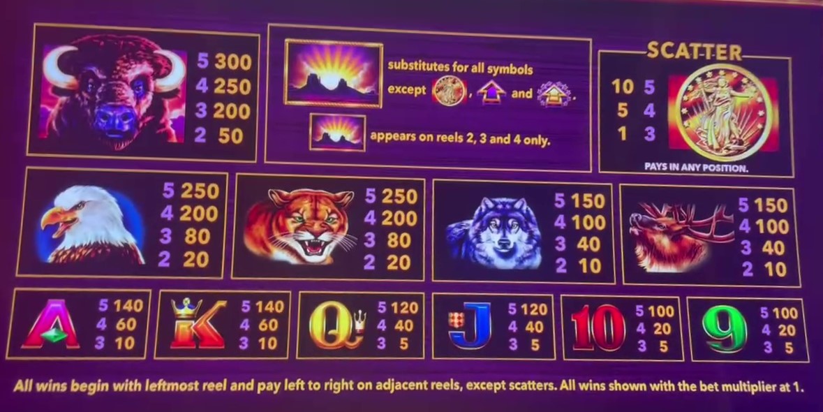 - رموز خط الدفع هي الجاموس، النسر، الكوجر، الذئب، الغزال، A، K، Q، J، 10، و9.