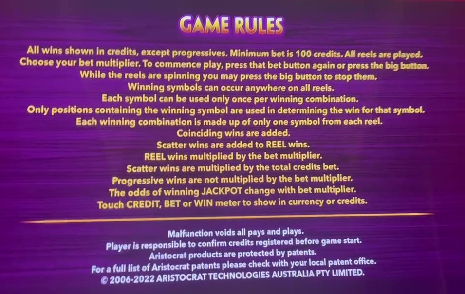 - يمكن للاعب المراهنة بـ ١٠٠، ٢٠٠، ٣٠٠، ٤٠٠، أو ٥٠٠ رصيد. أتصور أن الرصيد الواحد يساوي سنتًا واحدًا في معظم الألعاب.