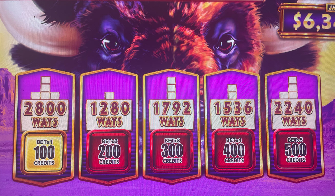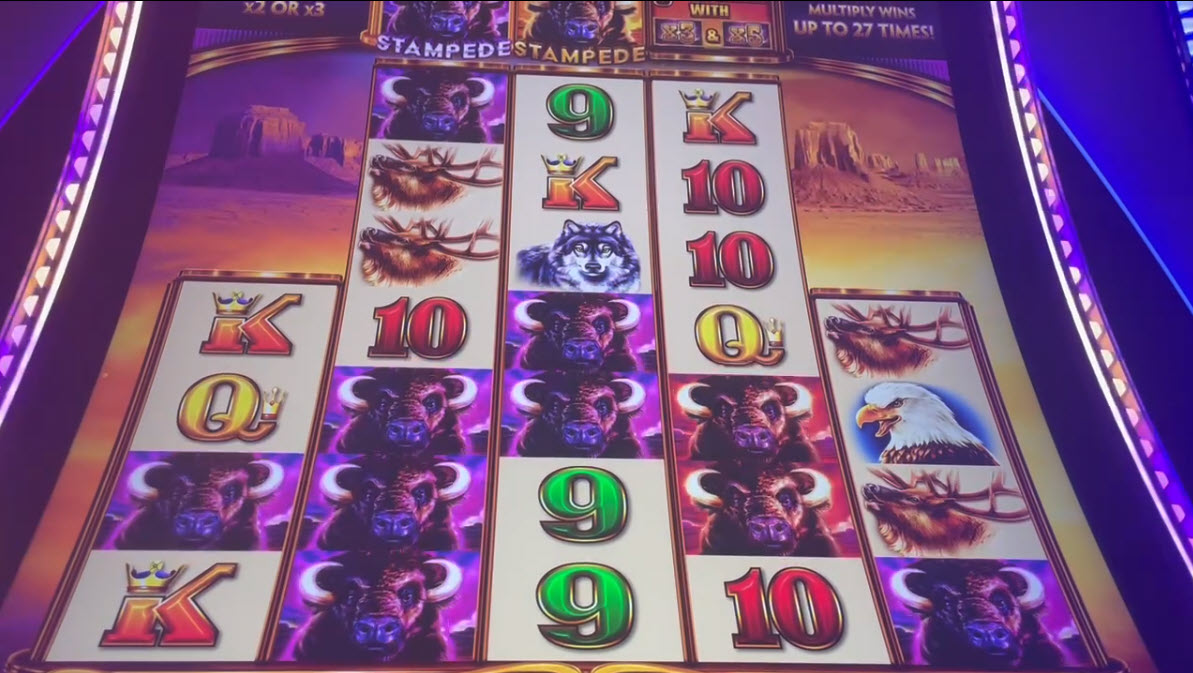 إليكم مثالاً على قاعدة "طرق الفوز". في الصور أدناه (بعد لعبة Stampede)، يوجد جاموس واحد، وأربعة، واثنان، واثنان، وواحد على البكرات من 1 إلى 5 على التوالي. هذا يعني أن 1×4×2×2×1 = 16 طريقة للفوز. خمسة جواميس تدفع 300 رصيد، لذا كان إجمالي الربح 16 × 300 = 4800 رصيد، أو 48 دولارًا.