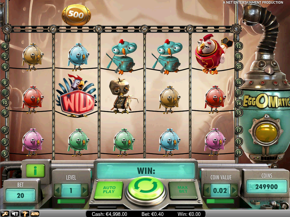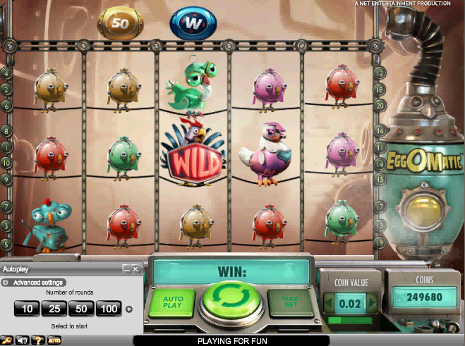 لعبة EggOMatic مستوحاة من دجاجات آلية تبيض بيضًا ذهبيًا. أسلوبها مُتقن بطابع ستيم بانك. أما الميزة الأبرز في التصميم فهي حزام ناقل فوق البكرات ينقل بيض الجوائز عشوائيًا. إذا ظهر رمز بديل أسفل بيضة مباشرةً، فسيسقط ليُفتح ويكشف عن رصيد (من ٥٠ إلى ٢٥٠٠)، أو مكافأة دورات مجانية، أو توسيع الرمز البديل في جميع الاتجاهات.