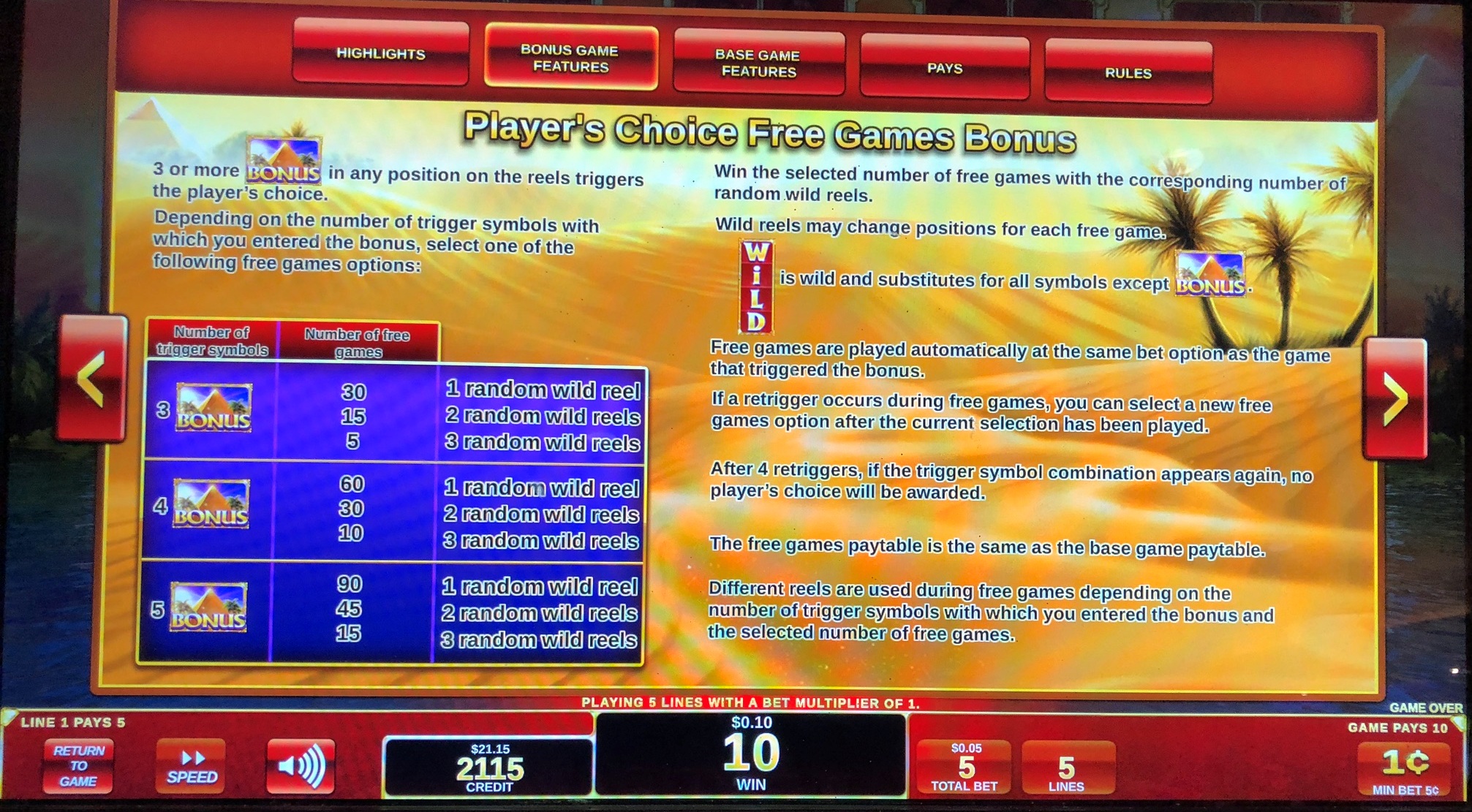 - إذا ظهرت ثلاثة رموز هرمية متناثرة أو أكثر على الشاشة، فسوف يلعب اللاعب لعبة مكافأة الدوران المجاني مع بكرات برية عشوائية.