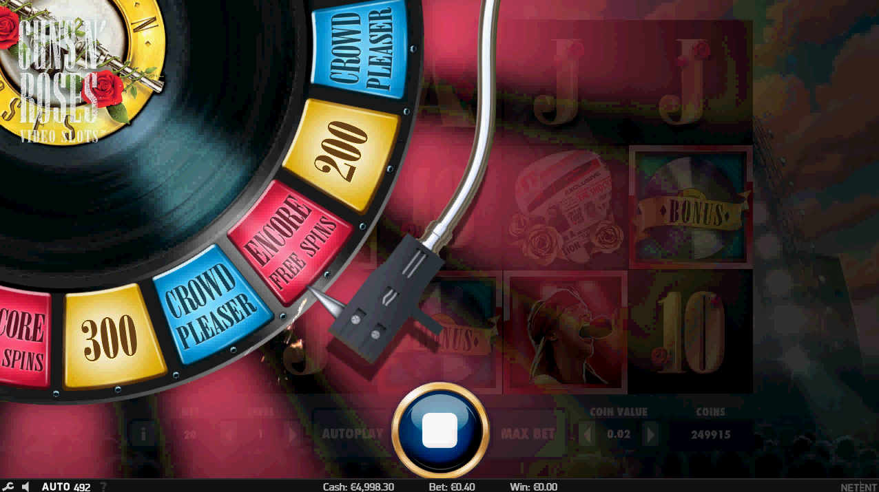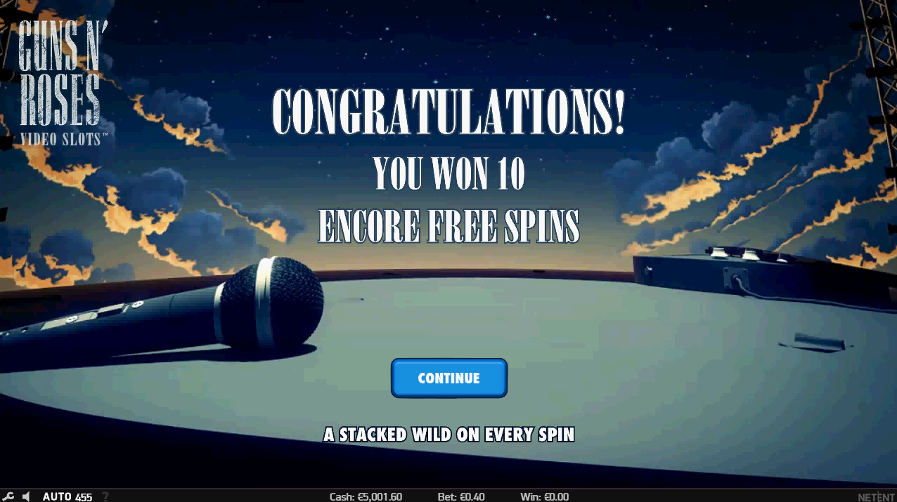 في مكافأة Encore Free Spins، يحصل اللاعب على عشر دورات مجانية. أي مكافأة دورات مجانية تُقدّر قيمتها تُضفي على الدورات المجانية طابعًا مميزًا، وGNR ليس استثناءً. في كل دورة مجانية، تختار اللعبة بكرة عشوائية لتكون رمزًا بريًا بالكامل، كما هو مُمثل بثلاثة مواقع مُتراصة لأعضاء الفرقة. يتم اختيار كلٍّ من البكرة وعضو الفرقة قبل أن تتوقف البكرات الأخرى عن الدوران وتُغطيها. علاوةً على ذلك، سيصبح عضو الفرقة رمزًا بريًا على البكرات الأربع الأخرى.