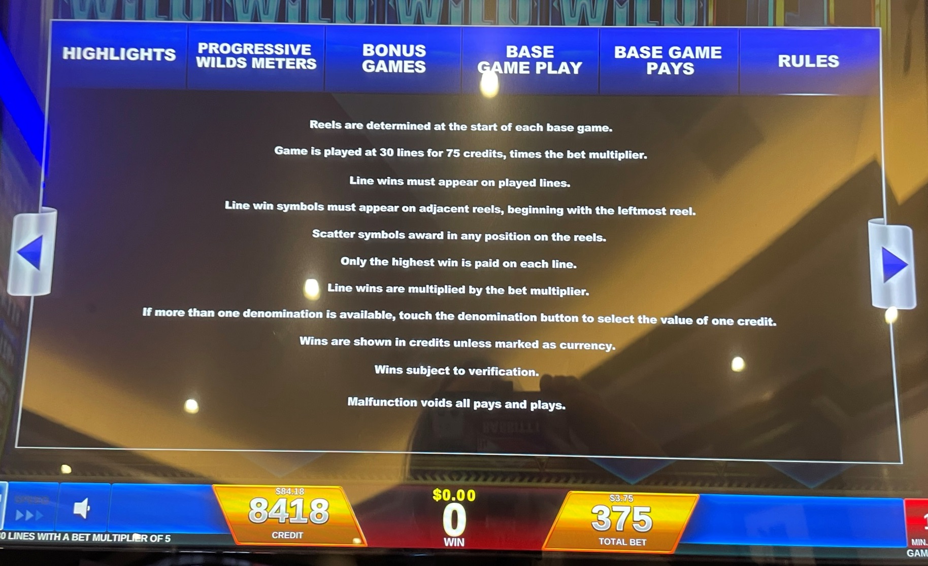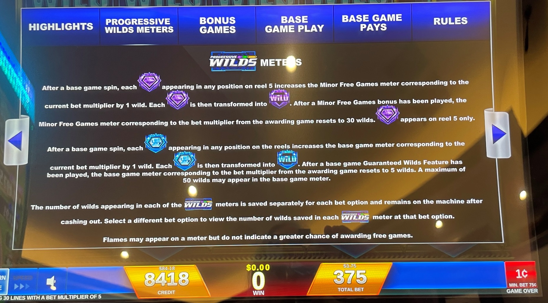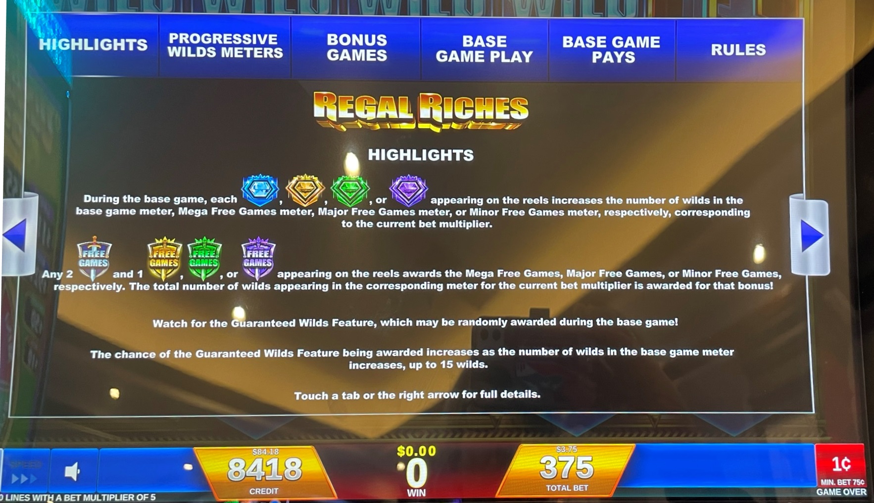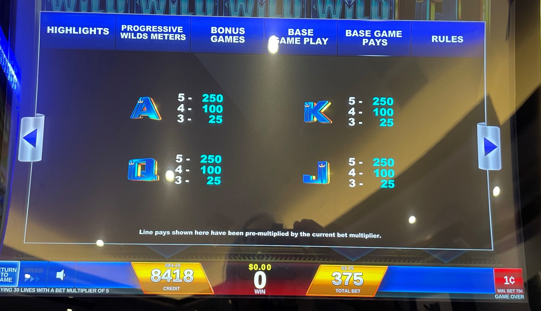- يجب على اللاعب المراهنة بـ 75 رصيدًا لكل دورة. يمكن للاعب اختيار قيمة الرصيد. في أغلب الأحيان، يتراوح الرصيد بين 1 و5 سنتات، بإجمالي رهان 0.75 دولار أمريكي، أو 1.50 دولار أمريكي، أو 2.25 دولار أمريكي، أو 3.00 دولار أمريكي، أو 3.75 دولار أمريكي.
