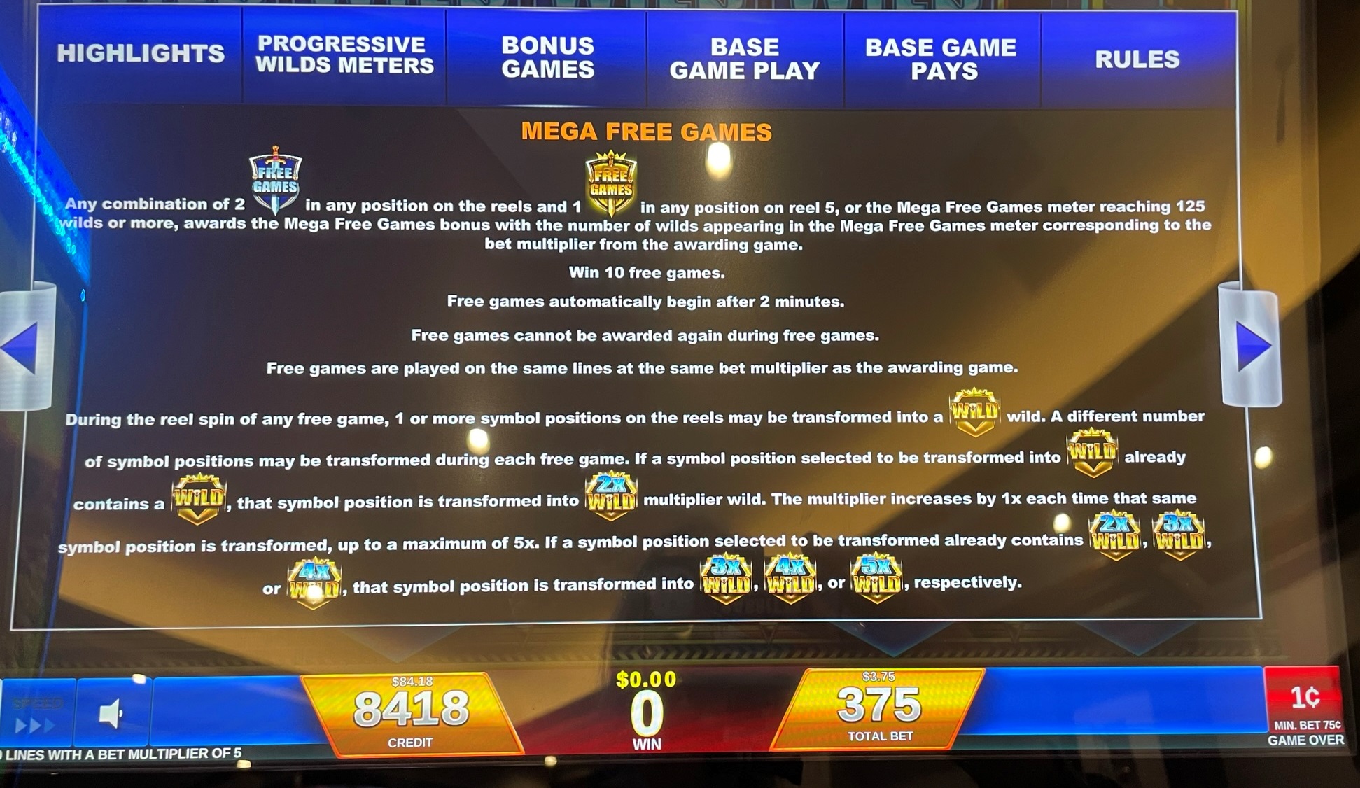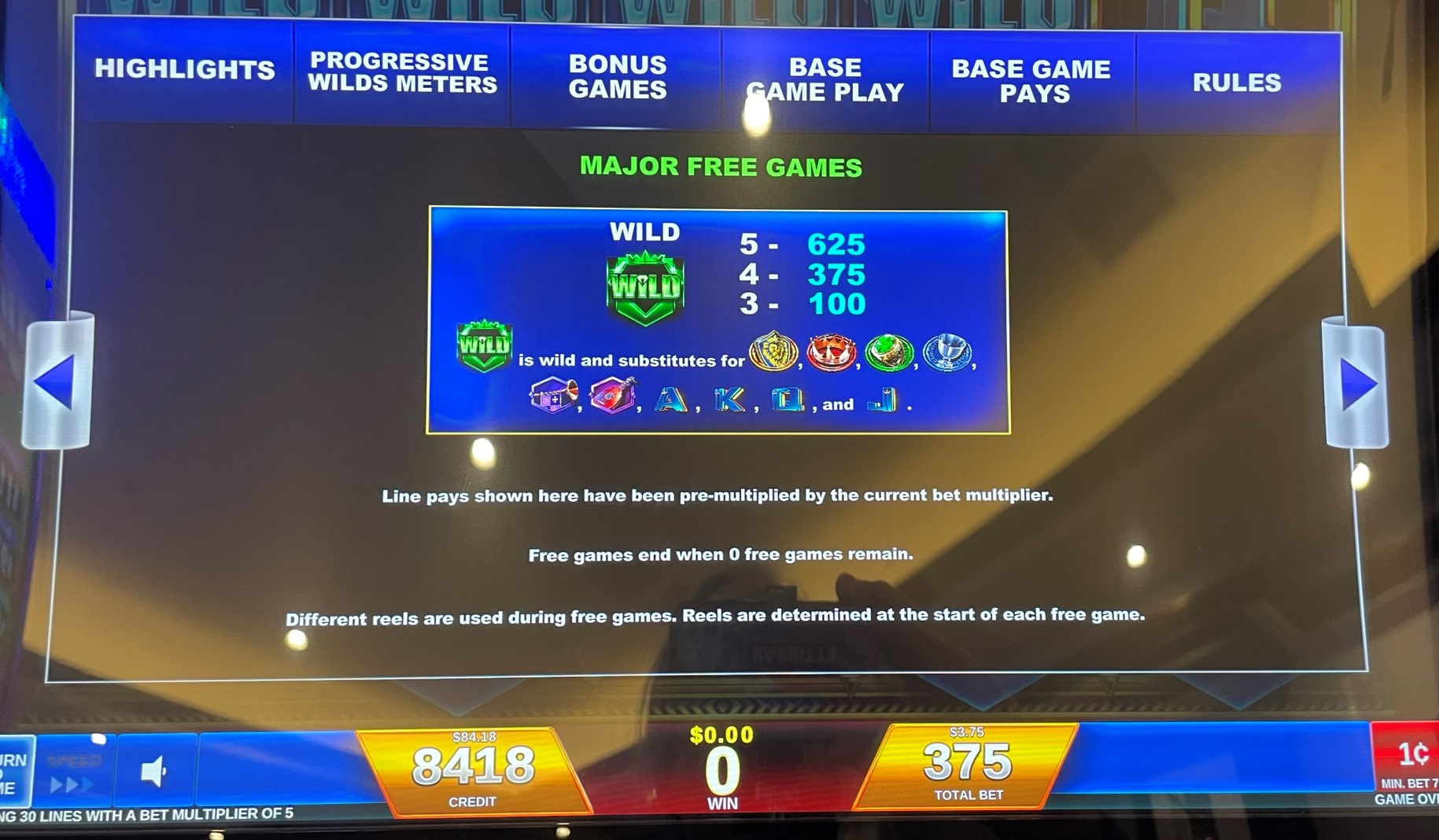 - تظهر رموز "الألعاب المجانية" على البكرات من ١ إلى ٥. إذا حصل اللاعب على رمزين منها بين البكرات من ١ إلى ٤، ورمز آخر على البكرة ٥، فسيلعب لعبة المكافأة. لا توضح شاشات القواعد ما يحدث إذا حصل اللاعب على ثلاثة أو أربعة رموز بديلة بين البكرات الأربع الأولى. من المحتمل أن اللعبة مُضللة مما يجعل هذا الأمر مستحيلاً.