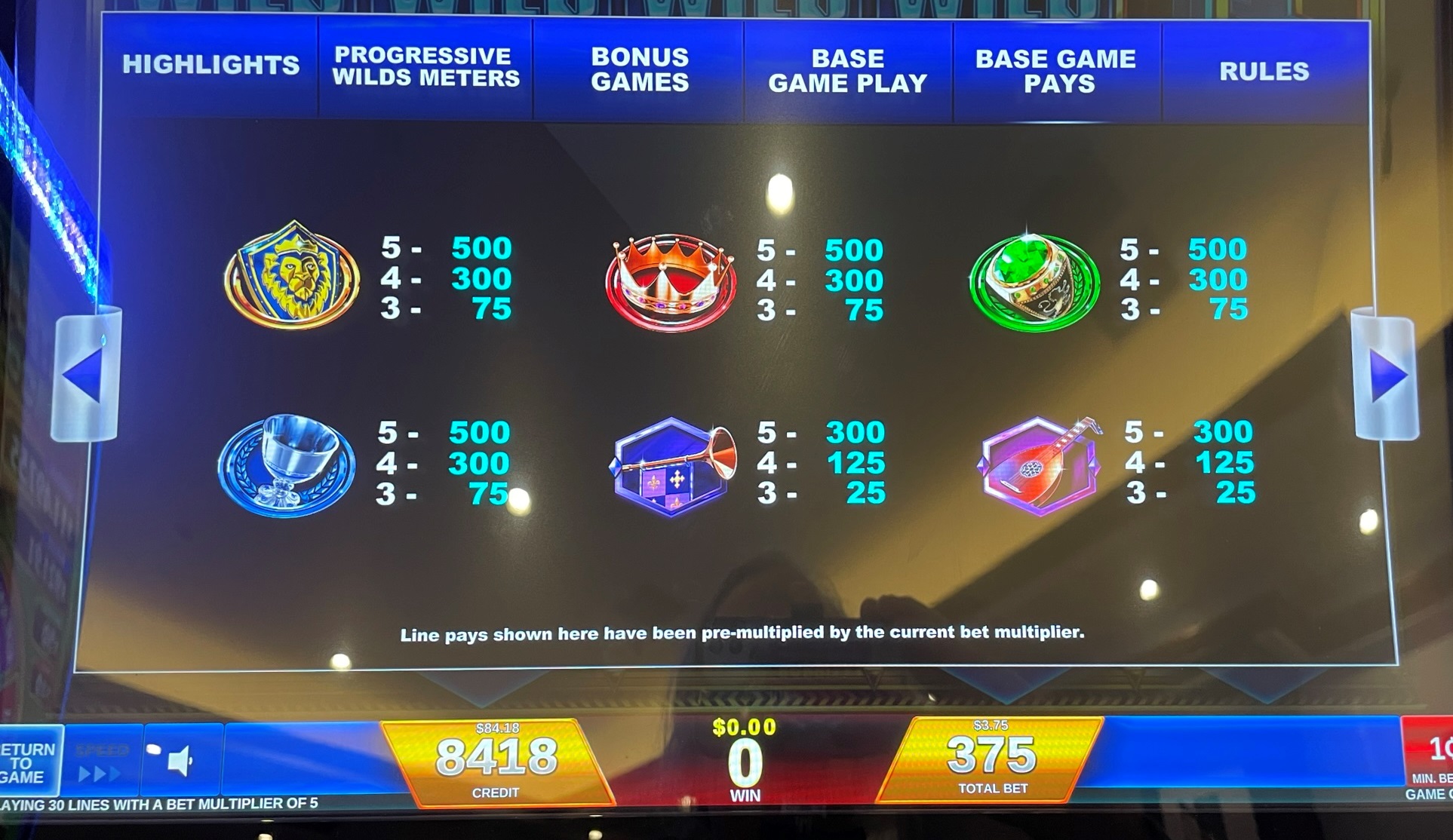 - باستثناء الرموز البرية، هناك تسعة رموز دفع خطية. في لعبة "الثروات الملكية"، هذه الرموز هي: درع، تاج، خاتم، كأس، قرن، قيثارة، A، K، Q، أو J.