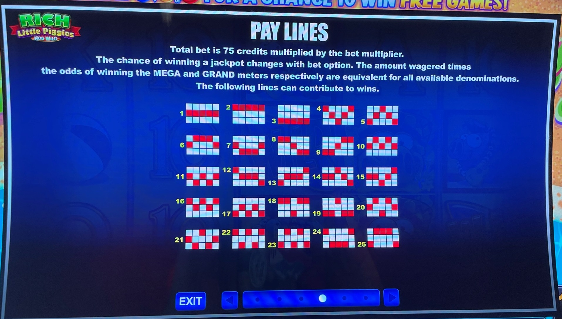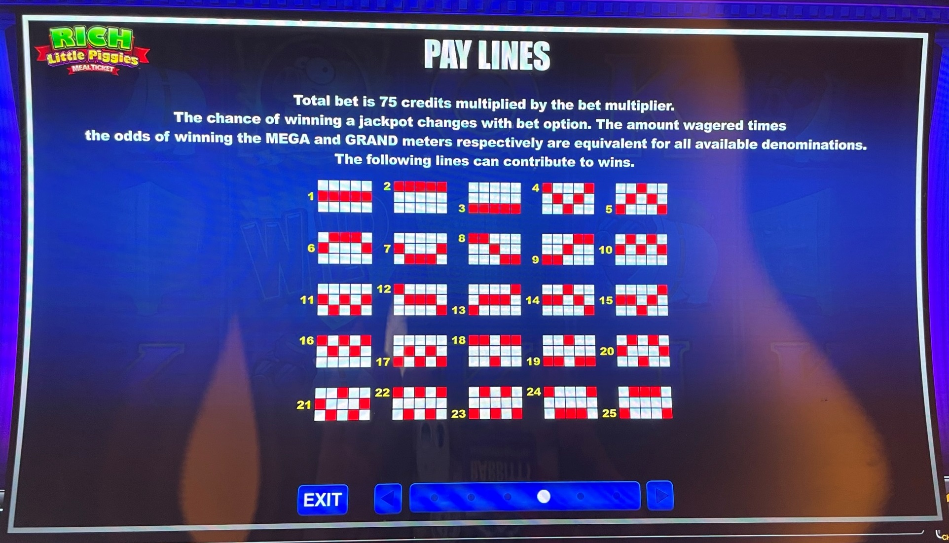- هناك ٢٥ خط دفع. بقسمة إجمالي الرهان على ٢٥ خط دفع، يكون رصيد الرهان لكل خط دفع هو ٣، ٦، ٩، ١٨، أو ٢٤.