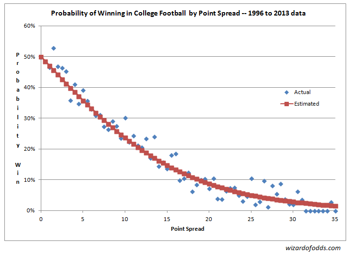 البيانات المستخدمة في هذا التحليل مستقاة من ١٢٢٣١ مباراة كرة قدم جامعية بين عامي ١٩٩٦ و٢٠١٣. يعود سبب بدئي في عام ١٩٩٦ إلى تطبيق قواعد الوقت الإضافي لإلغاء التعادل. كانت البيانات غير دقيقة، فاضطررتُ إلى حذف العديد من المباريات التي احتوت على معلومات غير دقيقة، مثل فارق نقاط -١٠٠، أو خط سلبي لإجمالي النقاط، أو أن مجموع النقاط المسجلة في كل ربع أقل من إجمالي نقاط المباراة، أو انتهاء المباراة بالتعادل. أنا متأكد من وجود بعض البيانات الخاطئة، لكنني أعتقد أن الغالبية العظمى منها سليمة.
