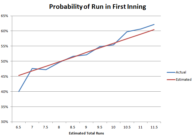 من الرهانات الشائعة في لعبة البيسبول احتمال تسجيل نقطة في الشوط الأول. من البديهي أن احتمال تسجيل نقطة في الشوط الأول يرتبط ارتباطًا وثيقًا بالإجمالي المتوقع. يوضح الجدول التالي عدد المباريات التي شهدت تسجيل نقطة في الشوط الأول، وفقًا للإجمالي. العمود الثاني، المعنون بـ RSFI، يرمز إلى "النقطة المسجلة في الشوط الأول". استند هذا الجدول إلى مواسم 2001 إلى 2011. تُظهر الخلية السفلية اليمنى احتمالًا إجماليًا لتسجيل نقطة واحدة على الأقل في الشوط الأول بنسبة 52.5%.