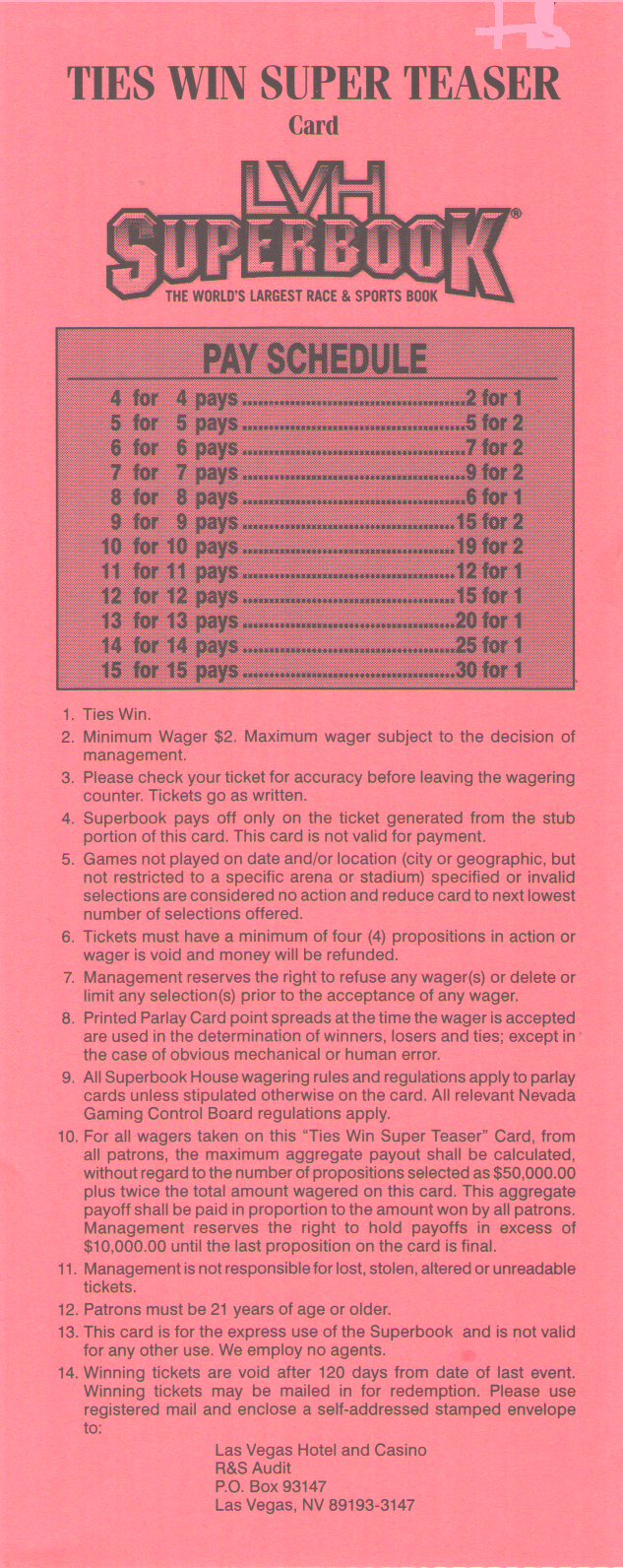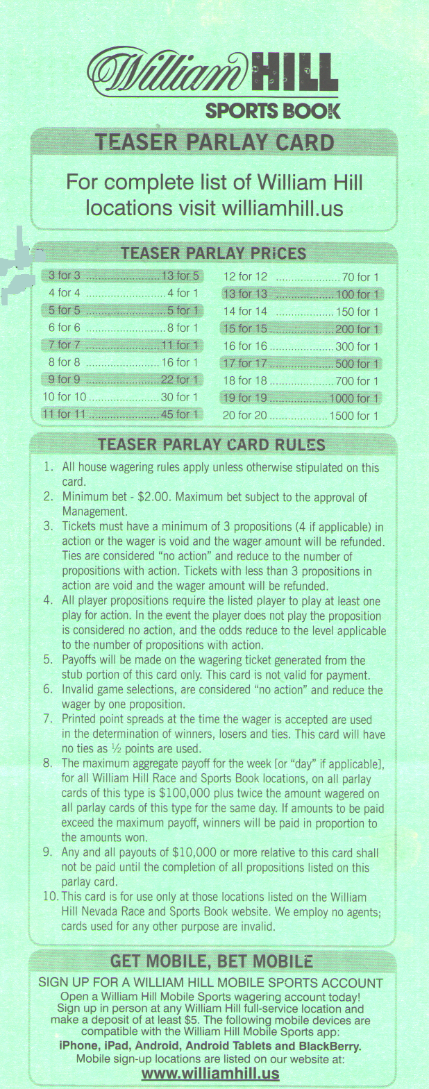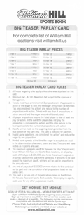 ويليام هيل هو الوحيد الذي يقدم رهانًا تشويقيًا بعشر نقاط. ووفقًا لمعادلة "الرهان التشويقي الساحر"، يتوقع المختار العشوائي الفوز بنسبة 78.25% من الرهانات. يوضح الجدول التالي احتمالية الفوز والعائد المتوقع مقارنةً بتوقعات ويليام هيل للمختار العشوائي. تتراوح نسبة ربح الكازينو بين 18% و29%.
