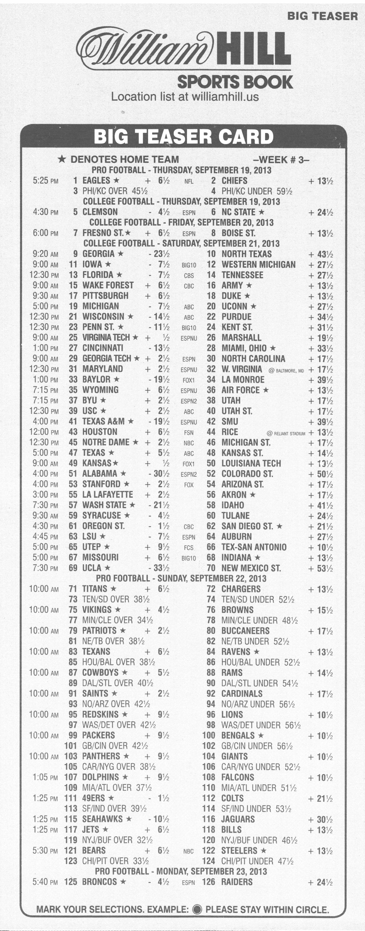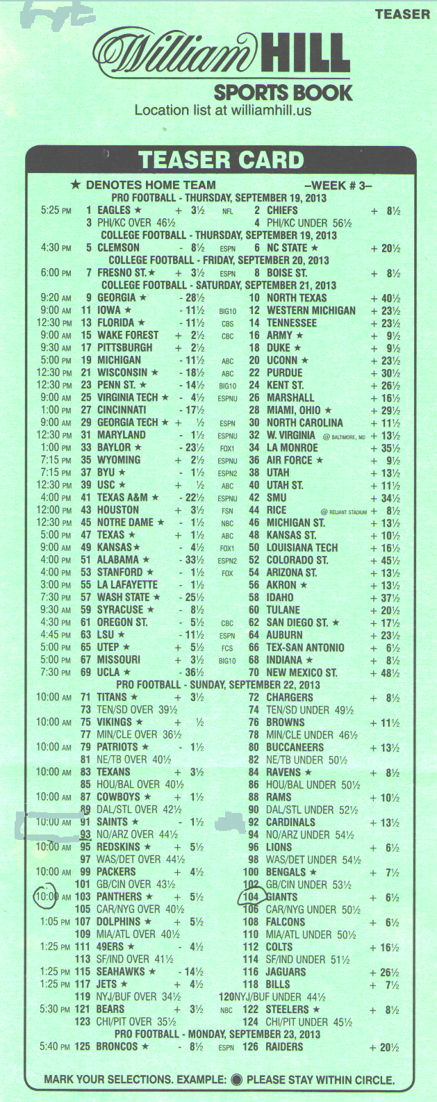 لاحظ كيف تنتهي ٢٥٪ من المباريات بفارق ٣ أو ٧ نقاط. بشراء نقاط تتجاوز هذين الرقمين، يزيد اللاعب من احتمالية فوزه بشكل كبير. الفروق الوحيدة التي تتجاوز كلا الرقمين عند المراهنة بست نقاط هي -٨.٥، -٨، -٧.٥، ١.٥، ٢، و٢.٥. في المتوسط، ٢٠٪ من مباريات دوري كرة القدم الأمريكية (NFL) يكون فيها أحد الفريقين متفوقًا بفارق نقاط واحد. تُعرف الفروقات في هذه الفروقات باسم "Wong Teasers"، لأن كتاب ستانفورد وونغ، "المراهنة الرياضية الحادة "، أظهر كيفية التغلب عليها.