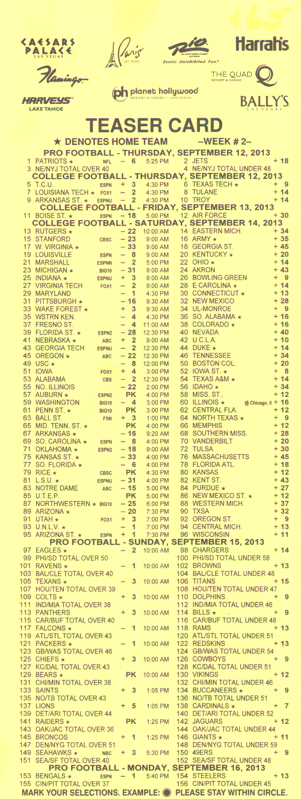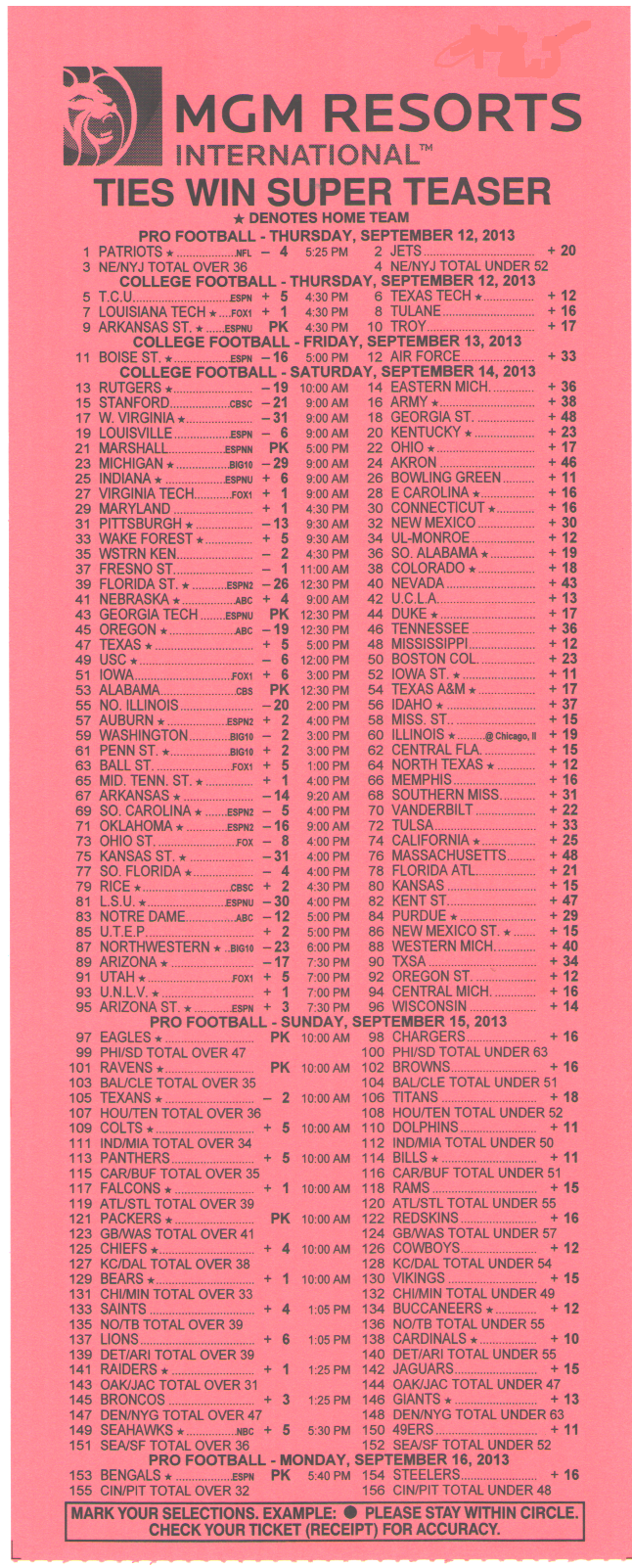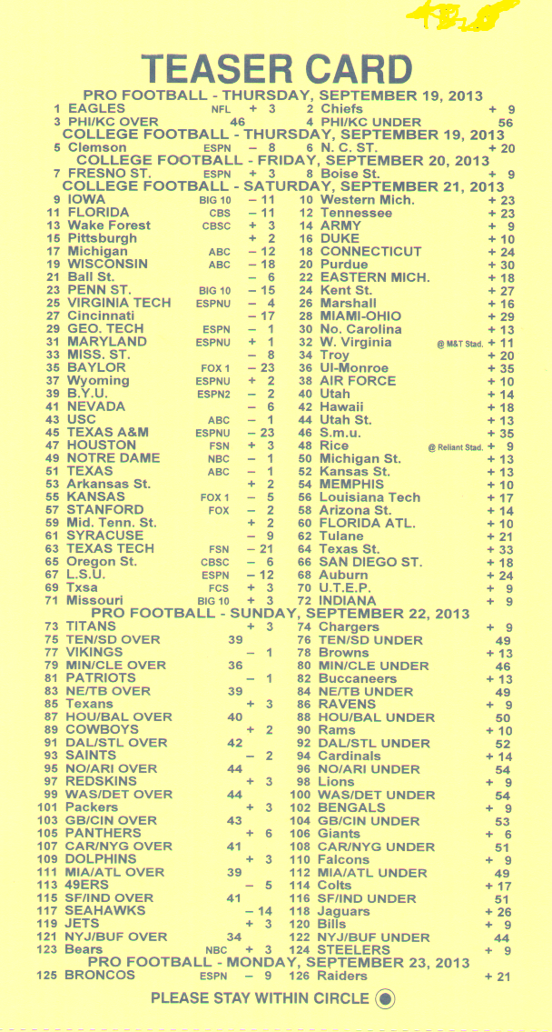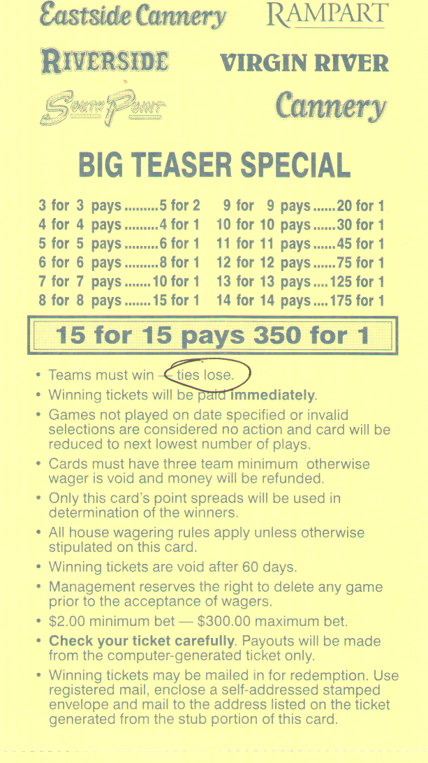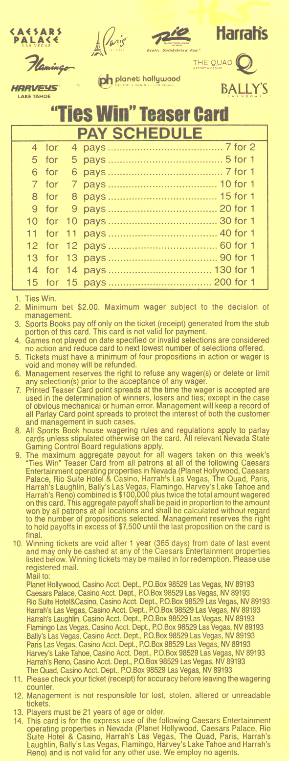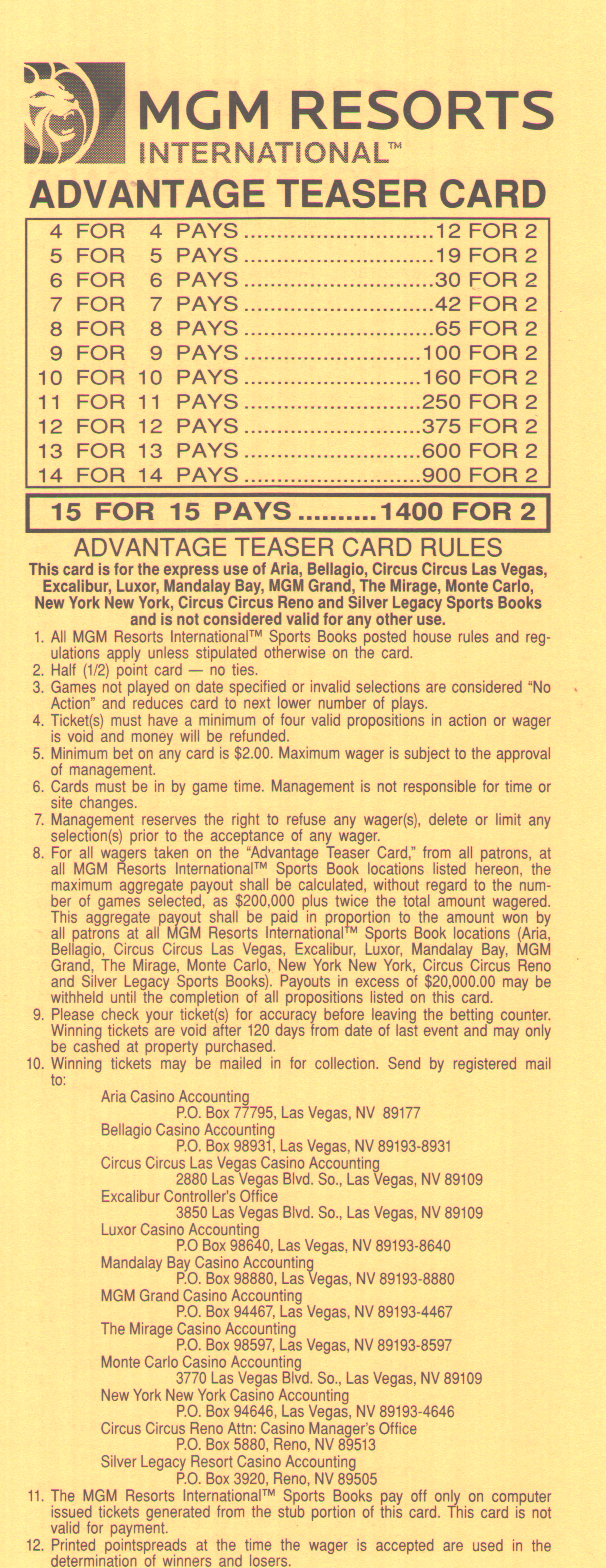 للأسف، يبدو أن احتمالات الفوز السخية -١١٠ لمباراة من مباراتين، و+١٨٠ لمباراة من ثلاث مباريات، و+٣٠٠ لمباراة من أربع مباريات من ست نقاط في دوري كرة القدم الأمريكية قد ذهبت أدراج الرياح مع موسم ٢٠١٤. فقد خفض فريق جيري ناجيت، آخر فريق صامد، احتمالاته في موسم ٢٠١٤.