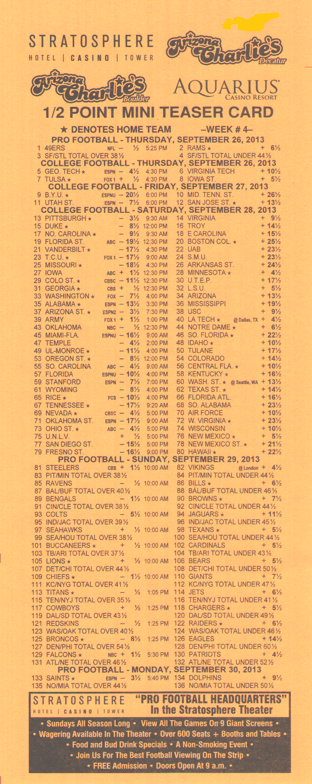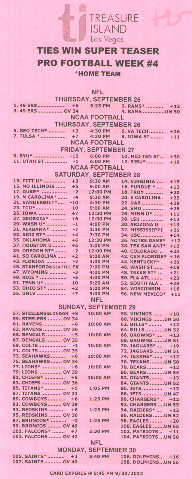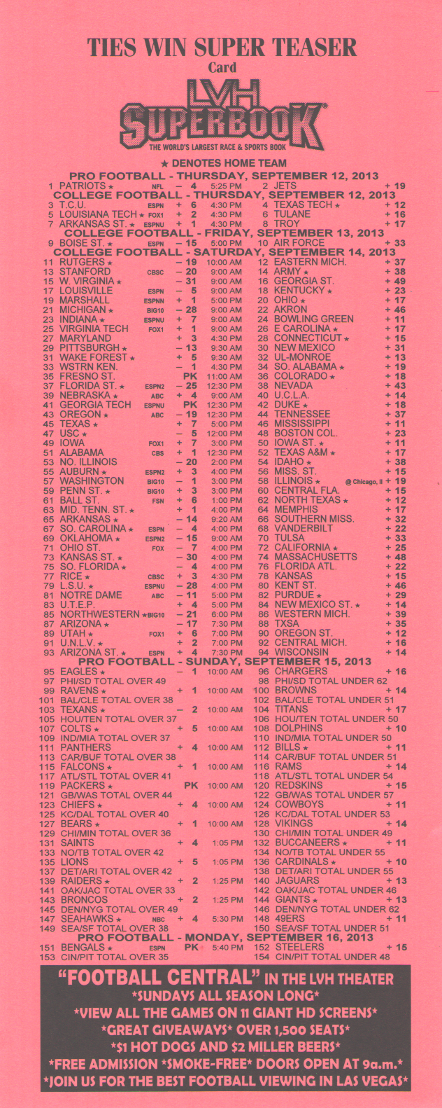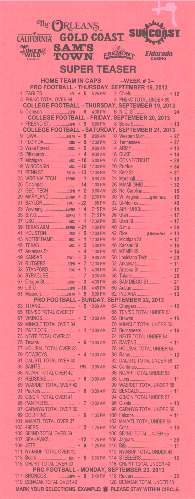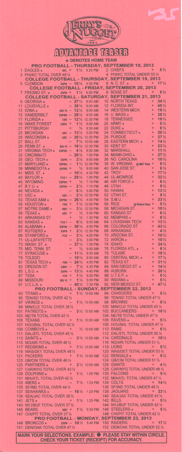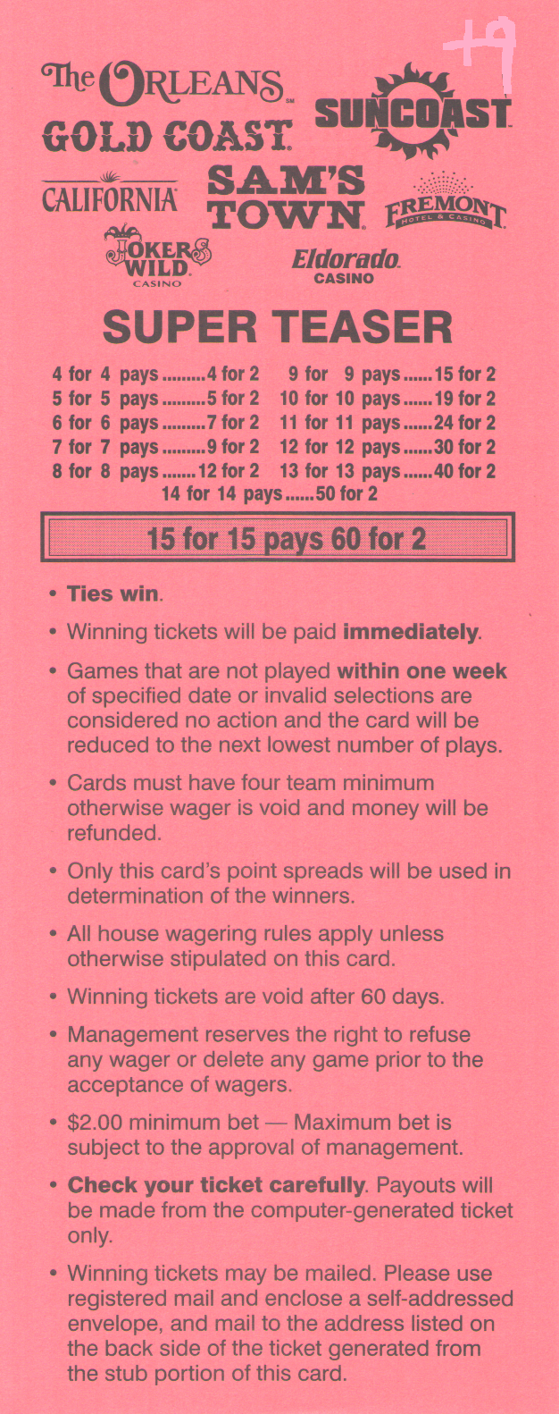 للأسف، يبدو أن احتمالات الفوز السخية -١١٠ لمباراة من مباراتين، و+١٨٠ لمباراة من ثلاث مباريات، و+٣٠٠ لمباراة من أربع مباريات من ست نقاط في دوري كرة القدم الأمريكية قد ذهبت أدراج الرياح مع موسم ٢٠١٤. فقد خفض فريق جيري ناجيت، آخر فريق صامد، احتمالاته في موسم ٢٠١٤.