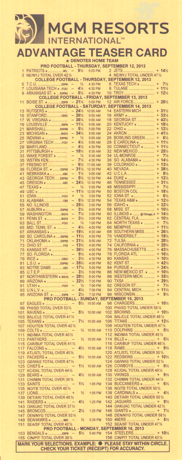 | إم جي إم | من 10 إلى 13 | من 8 إلى 5 | 5 إلى 2 | 4 إلى 1 | 6 إلى 1 | 10 إلى 1 | 15 إلى 1 | ||