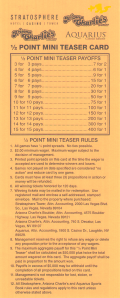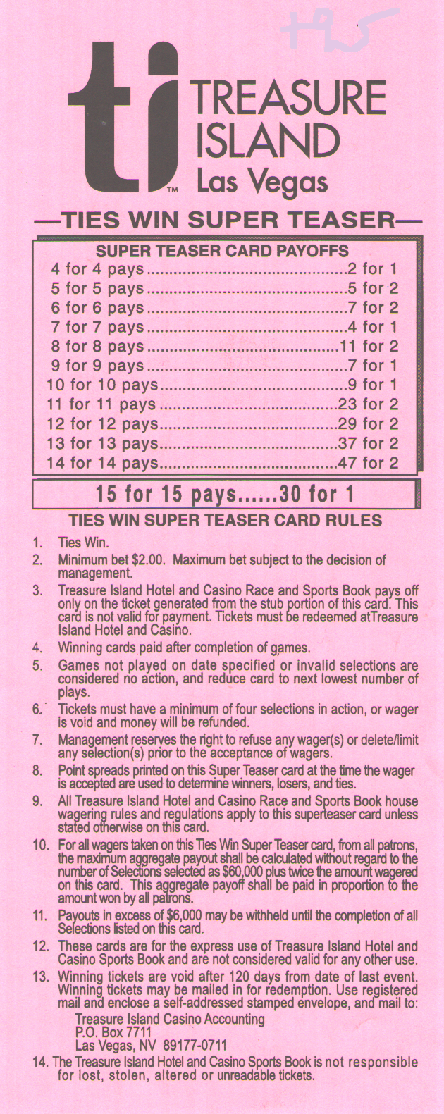 وفقًا لمعادلة Wizard Teaser ، يتوقع اللاعب الذي يختار عشوائيًا الفوز بنسبة 77.14% من الاختيارات. يوضح الجدول التالي احتمالية الفوز والعائد المتوقع مقارنةً بجدول ربح Treasure Island للاعب الذي يختار عشوائيًا. تتراوح نسبة ربح الكازينو بين 26% و38%.