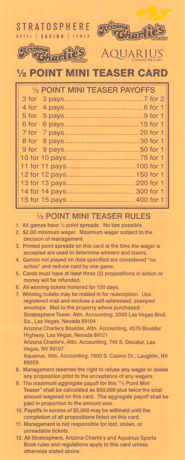 يوضح الجدول التالي احتمالية الفوز والعائد المتوقع للاعب عشوائي مقارنةً بأفضل احتمالات الرهان المُغرية المتاحة (6.5 نقطة). يُرجى العلم أن هامش الكازينو يتراوح بين 10% و54%.