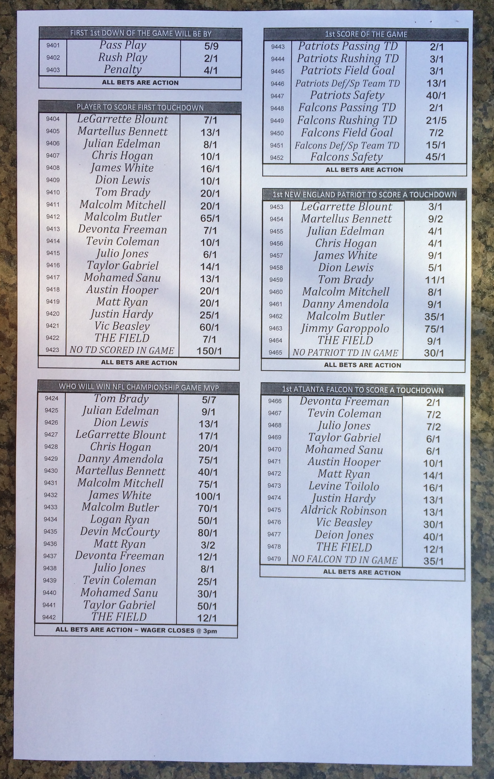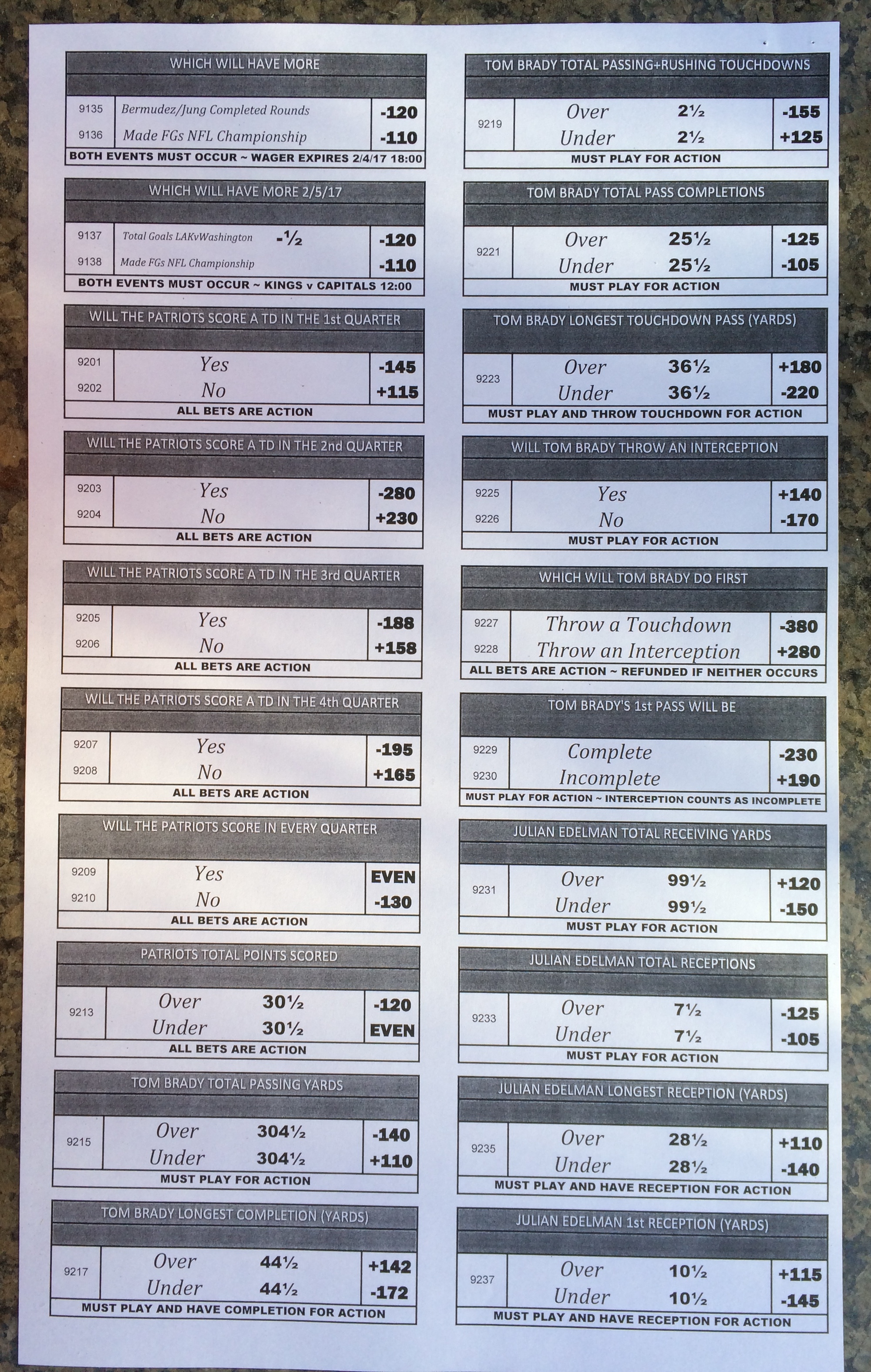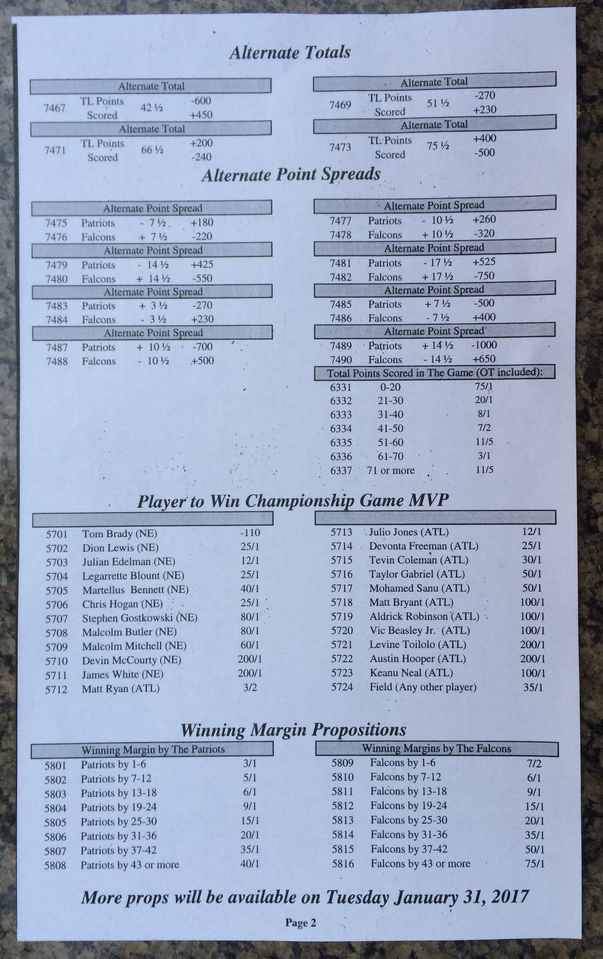 يمكنك العثور على القائمة الكاملة في القائمة الكاملة لرهانات Super Bowl 51 من Westgate Superbook .