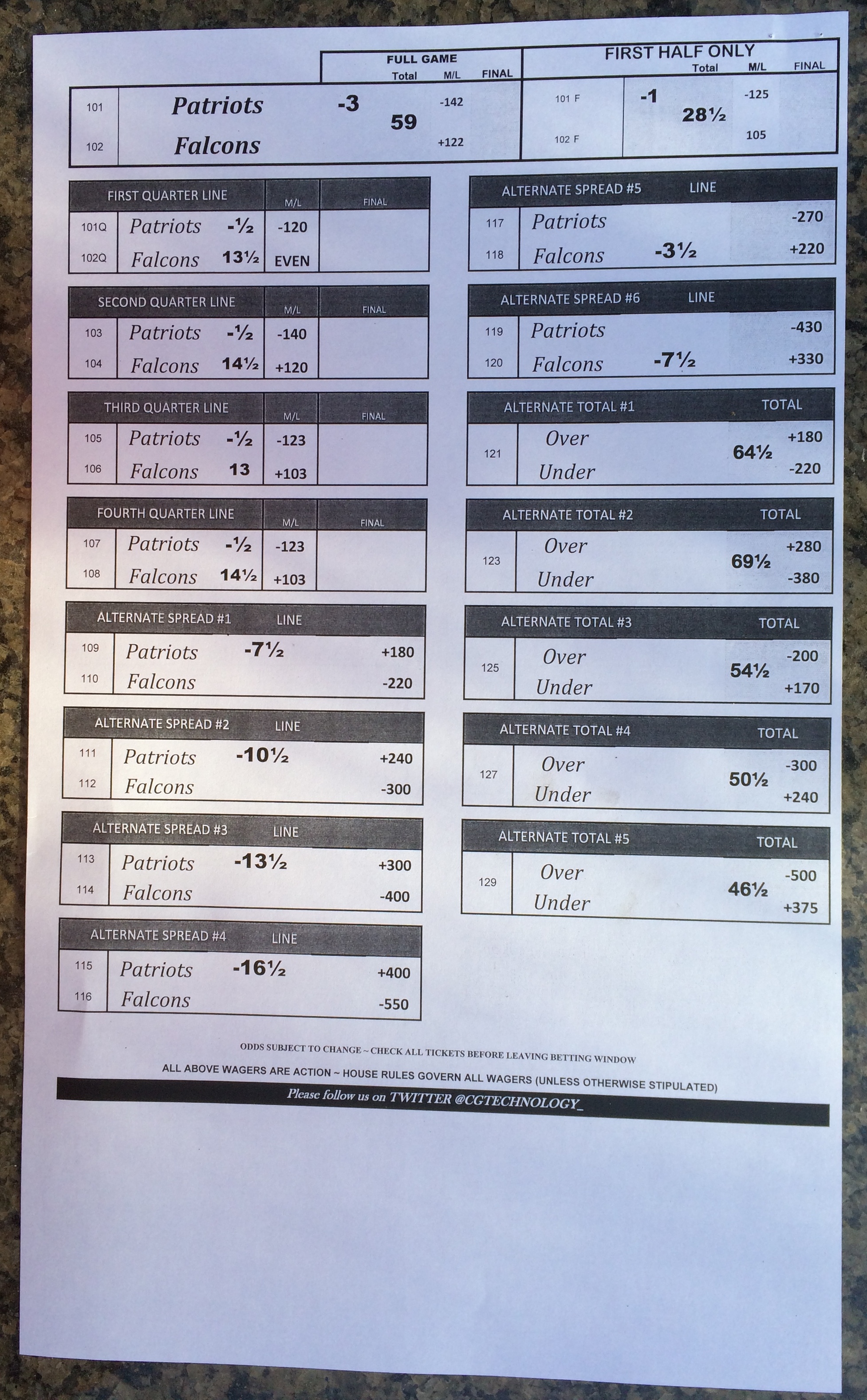 يمكنك أيضًا العثور على القائمة الكاملة في القائمة الكاملة لرهانات Super Bowl 51 من Westgate Superbook .