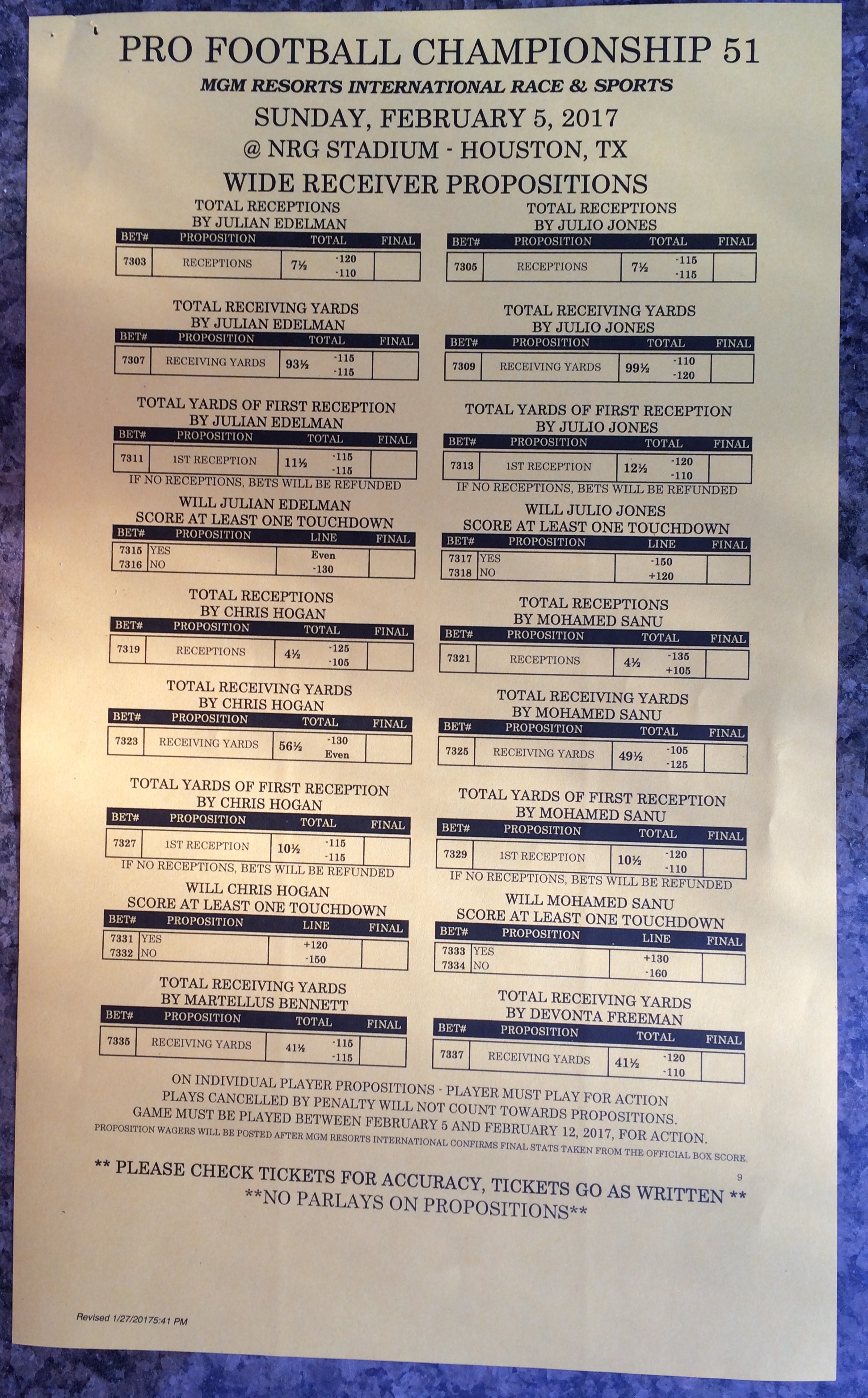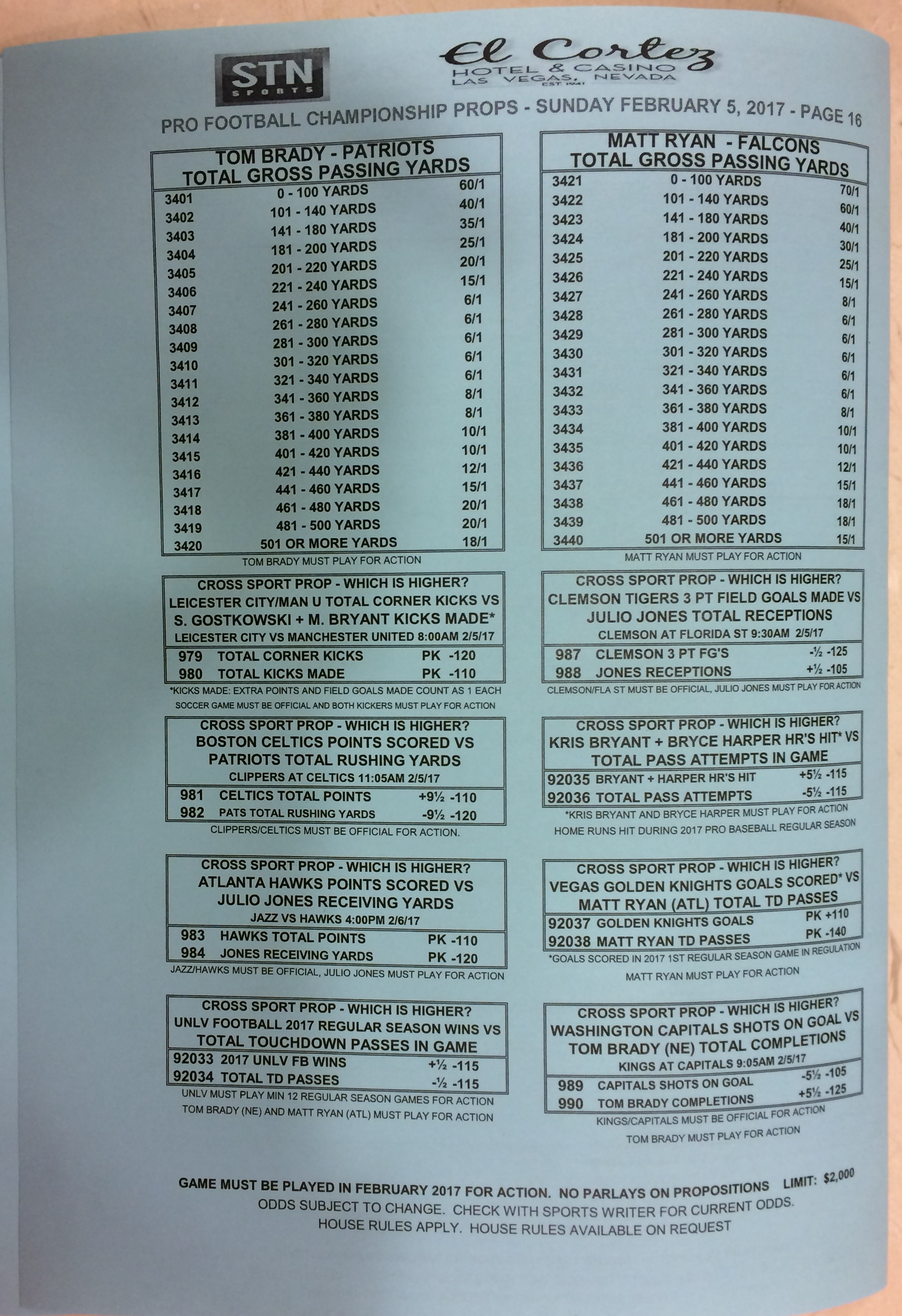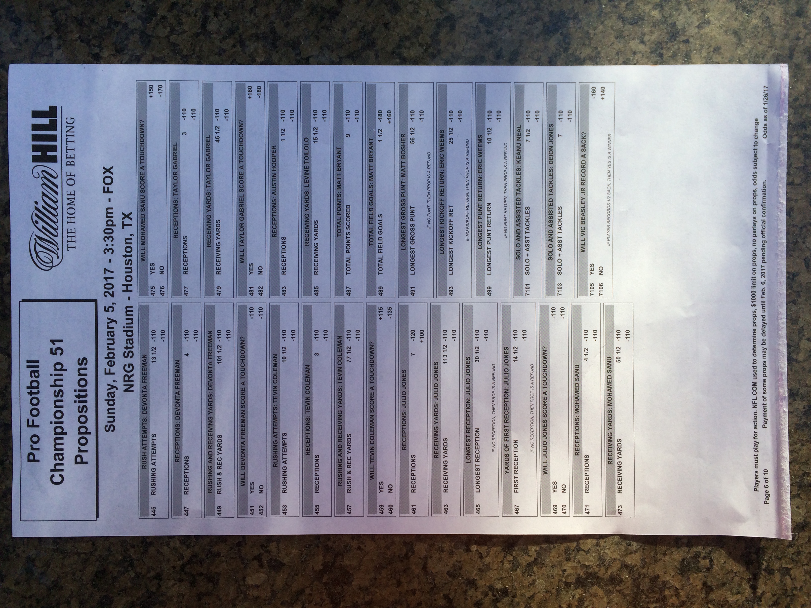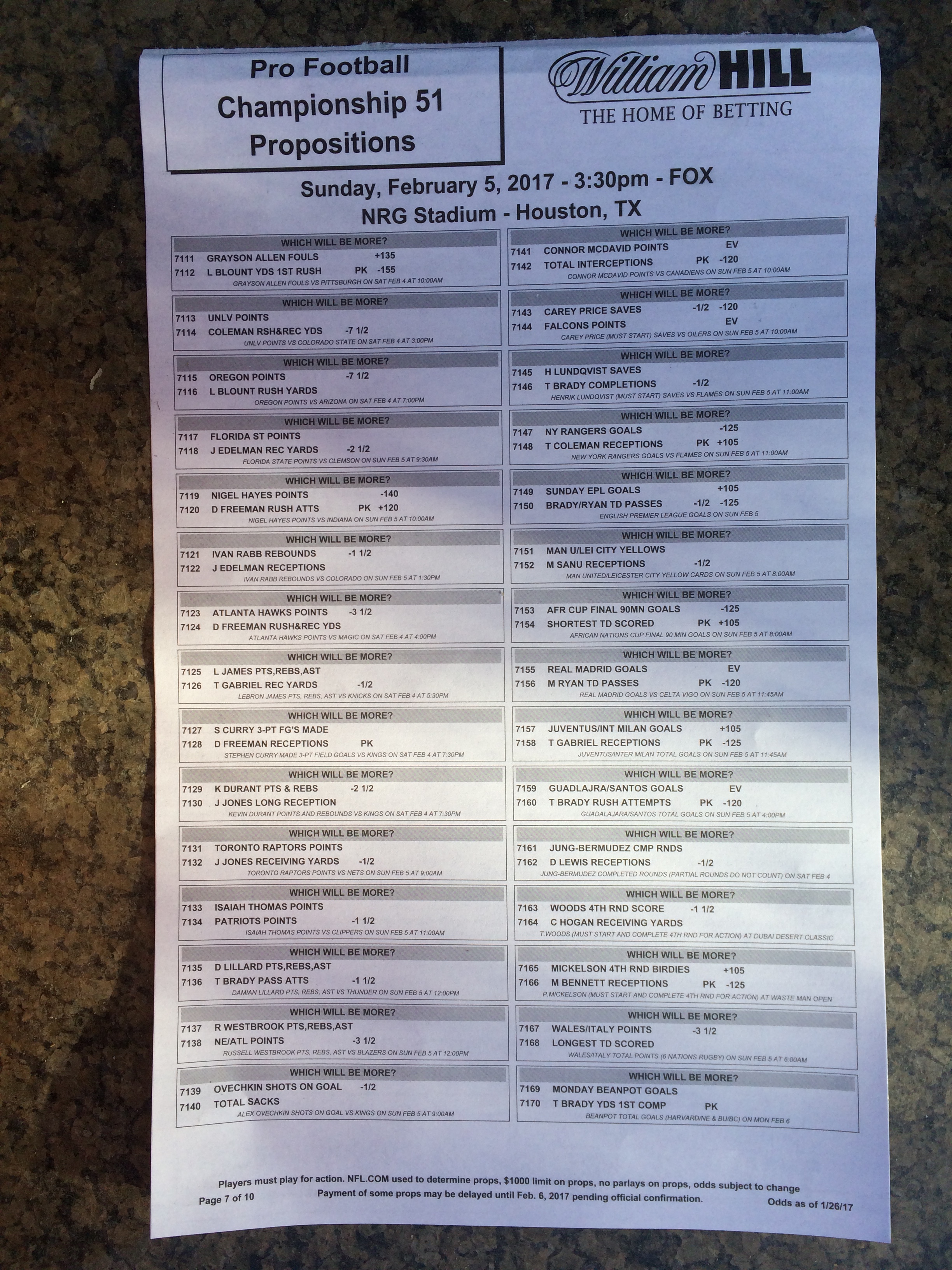 - a href="https://lasvegassun.com/blogs/talking-points/2017/jan/27/full-list-of-super-bowl-51-prop-bets-from-westgate/" target=_blank>القائمة الكاملة لرهانات Super Bowl 51 من Westgate Superbook مثل LasVegasSun.com.
