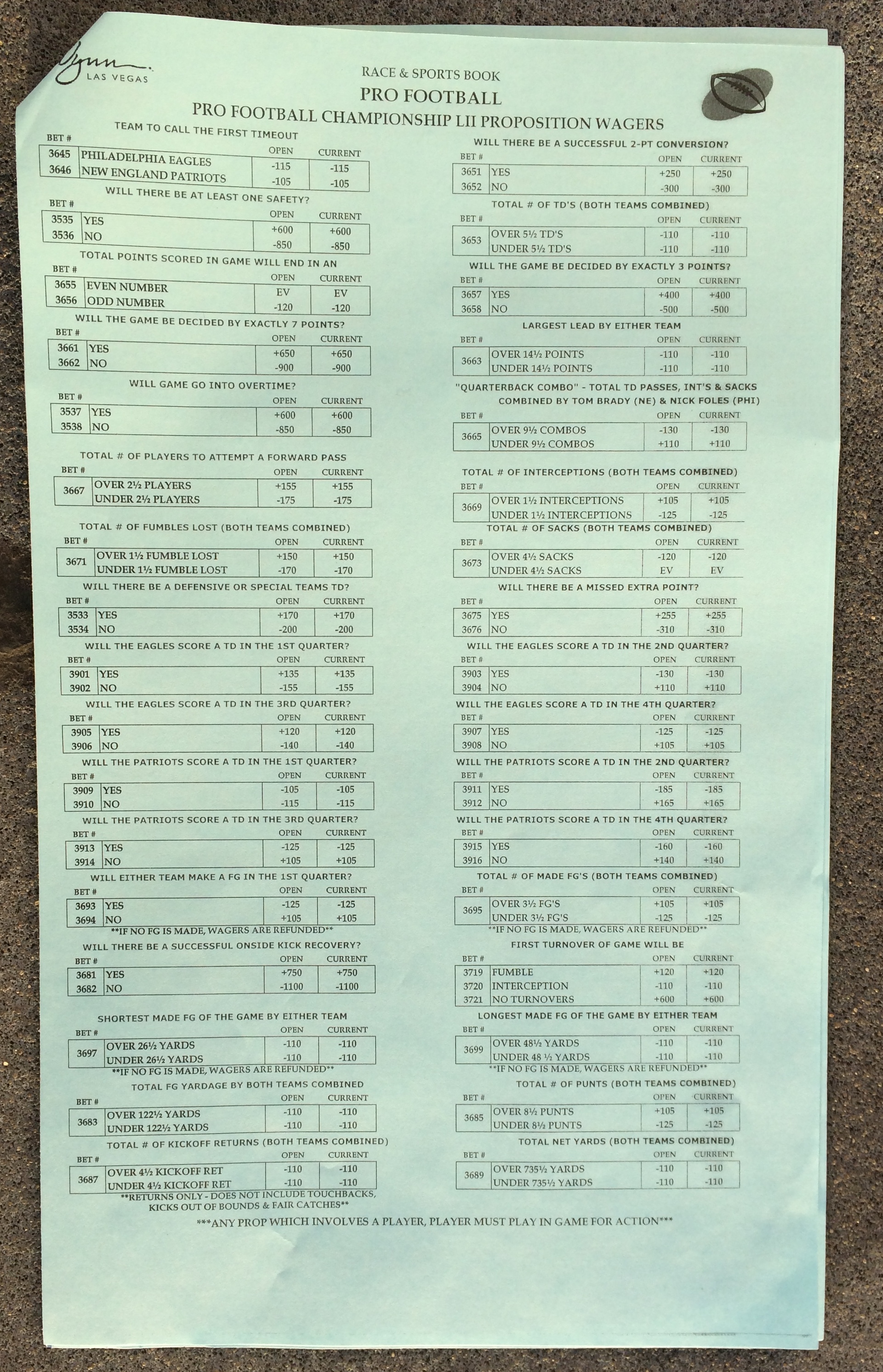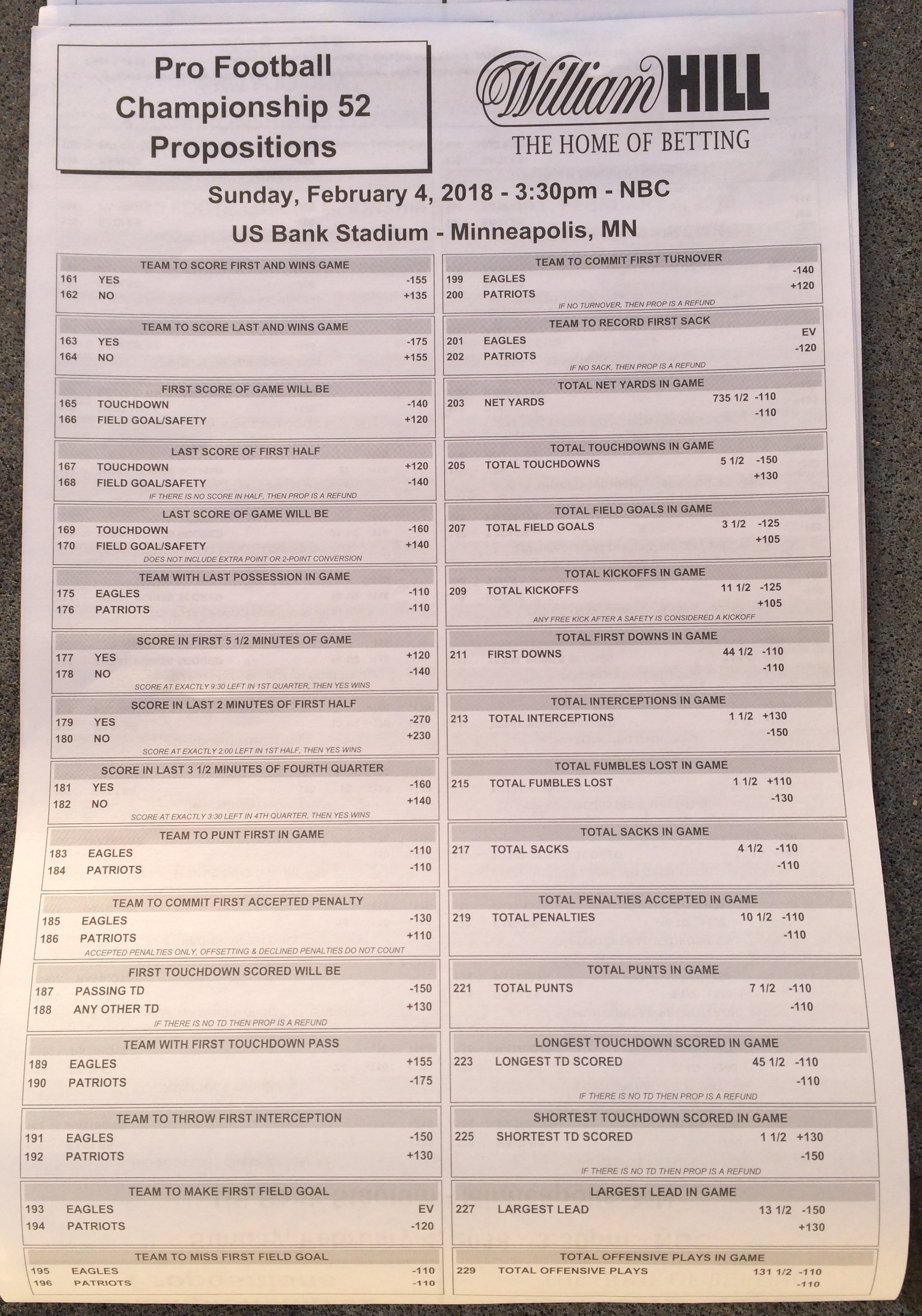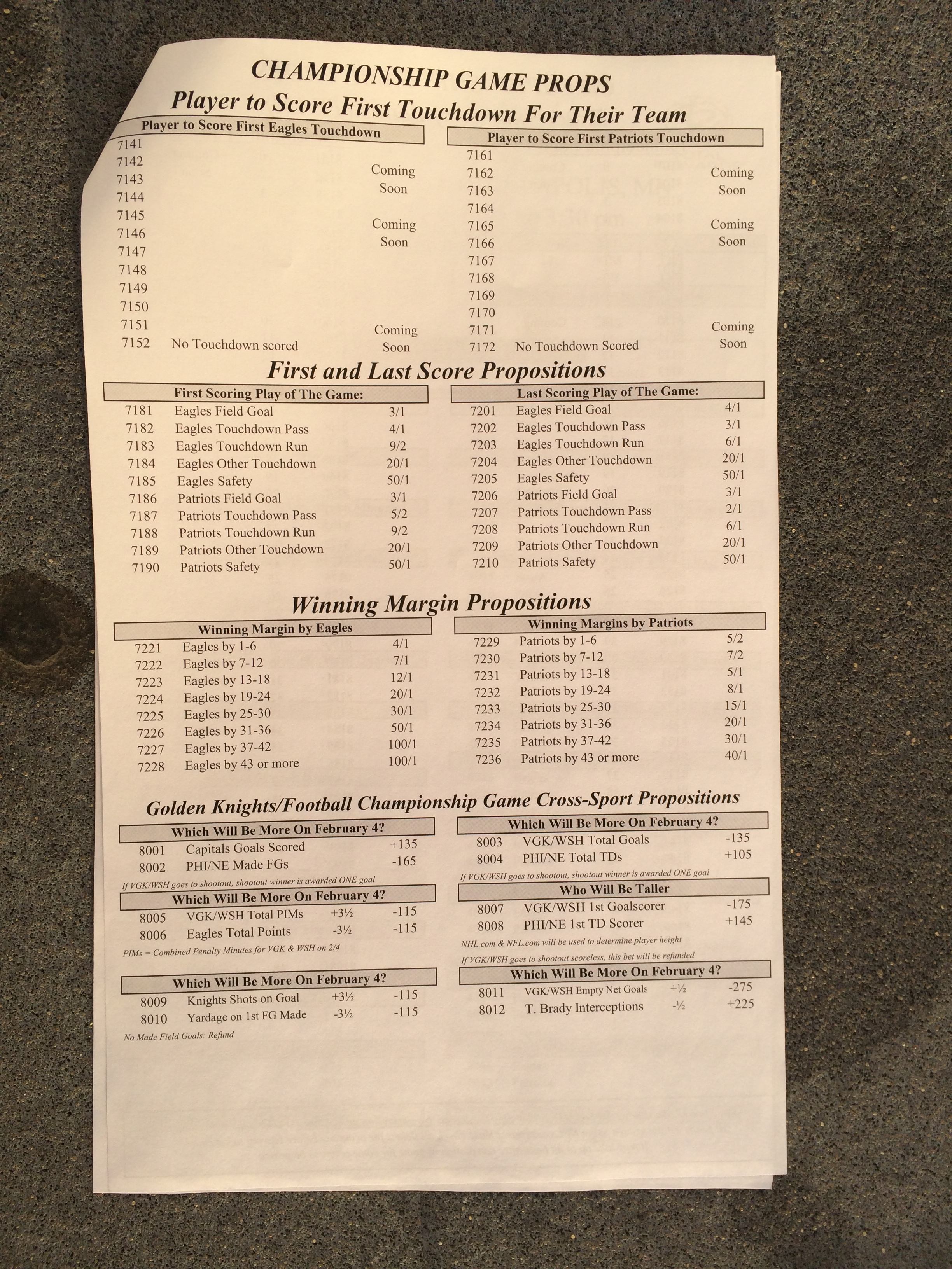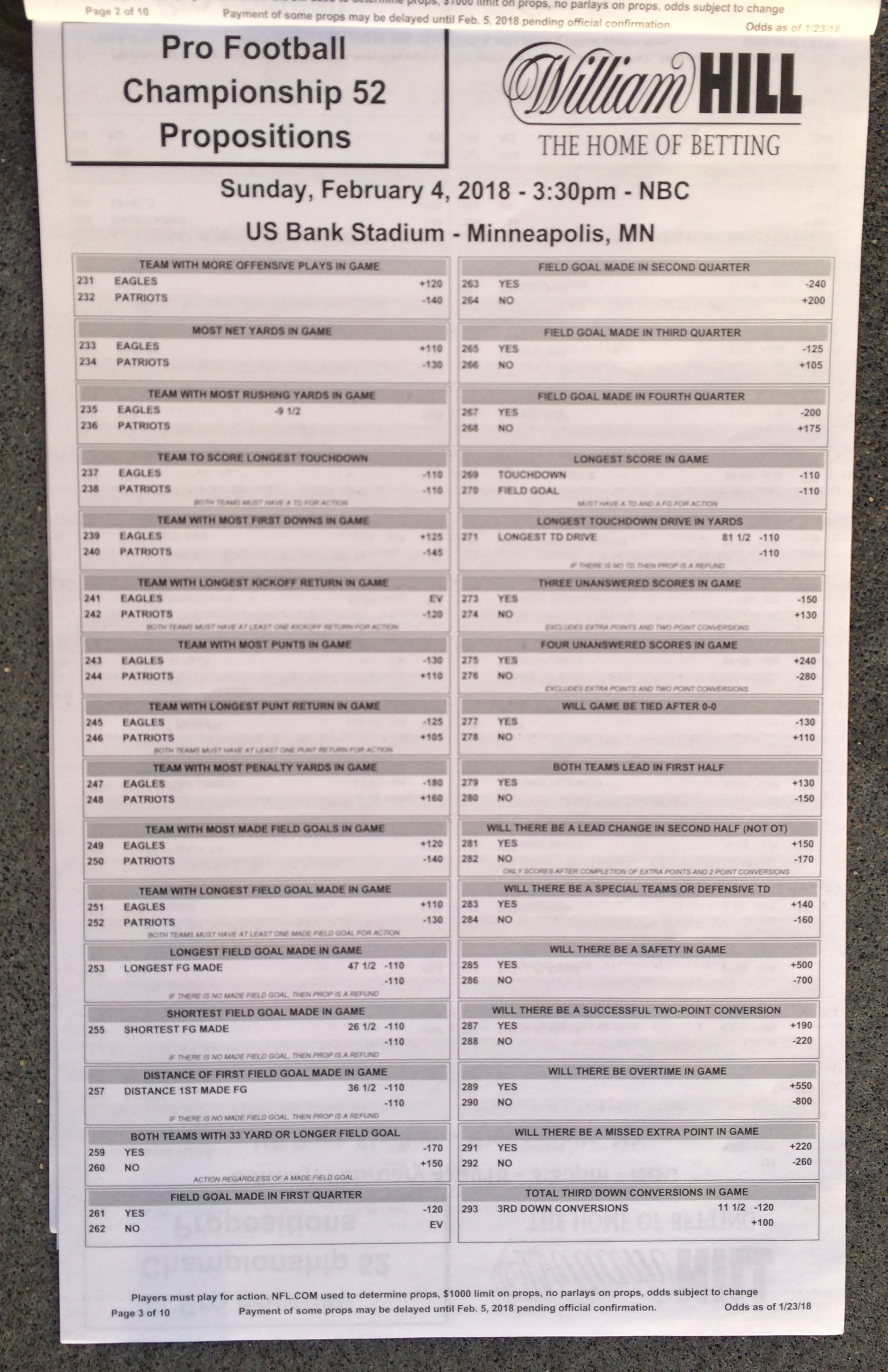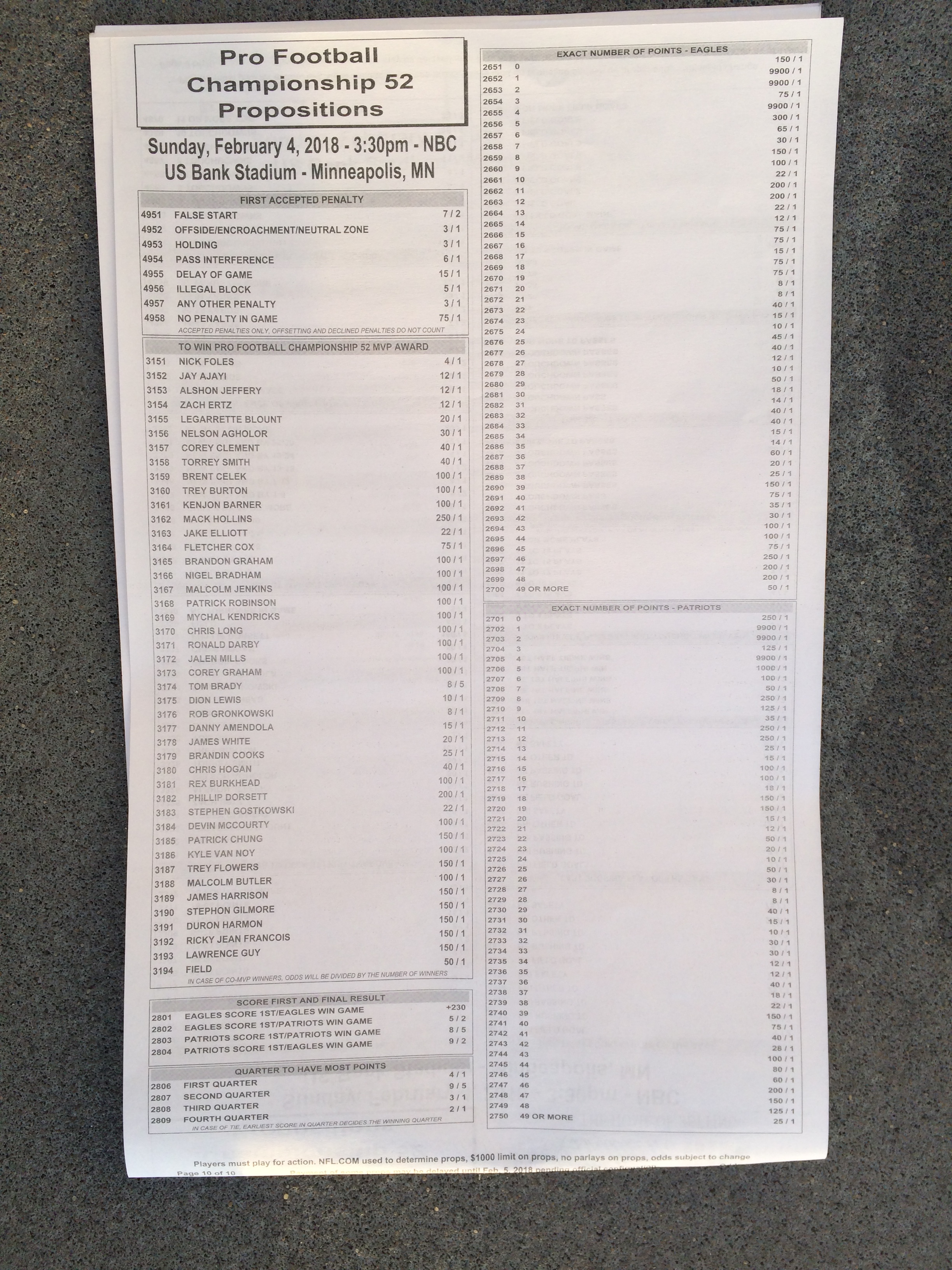 فيما يلي صور لكل صفحة من صفحات رهانات الاقتراحات لدى عدة مكاتب مراهنات رياضية في لاس فيغاس. جُمعت هذه الأوراق في ٢٧ يناير ٢٠١٨، أي قبل ثمانية أيام من المباراة.