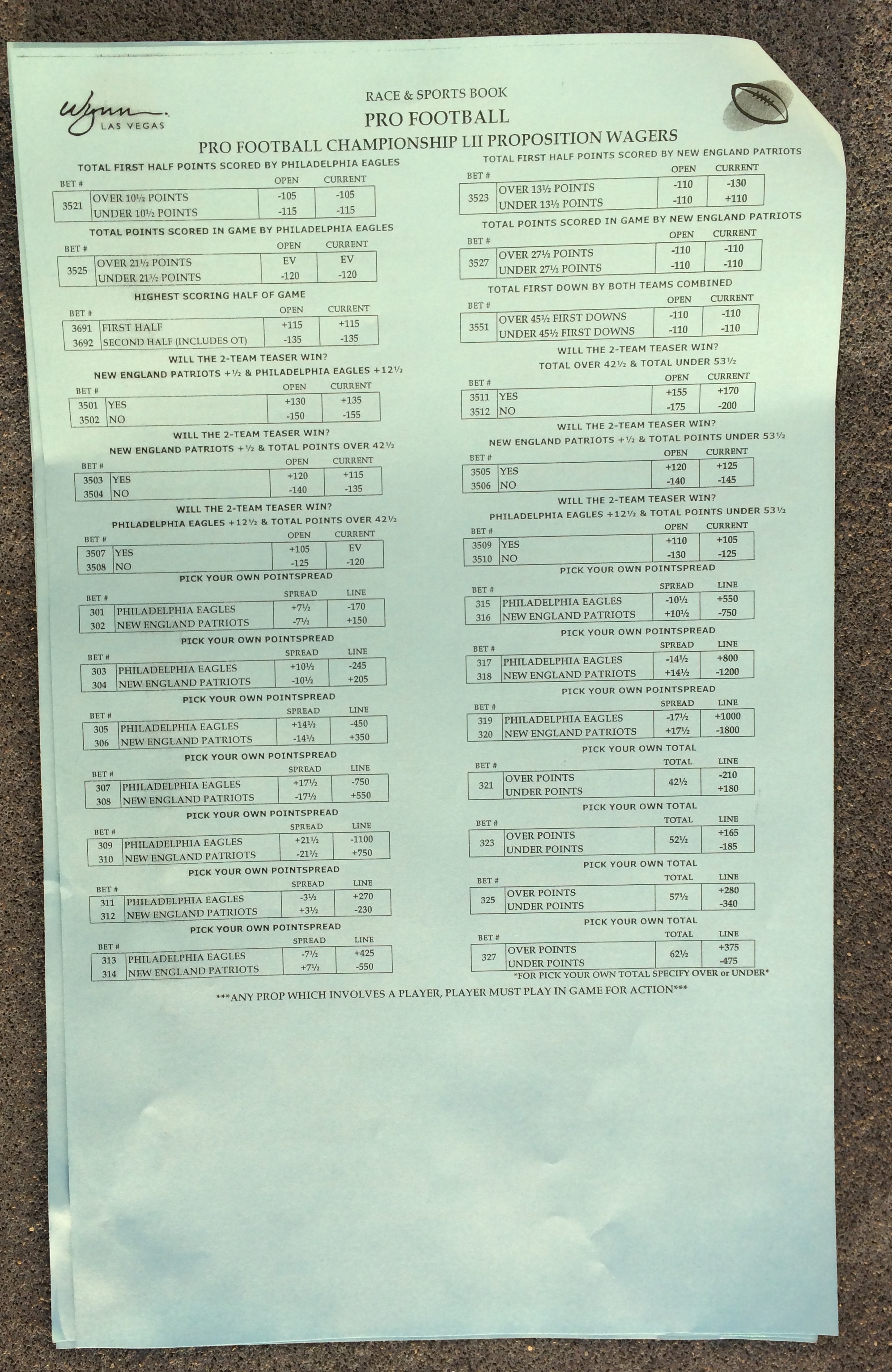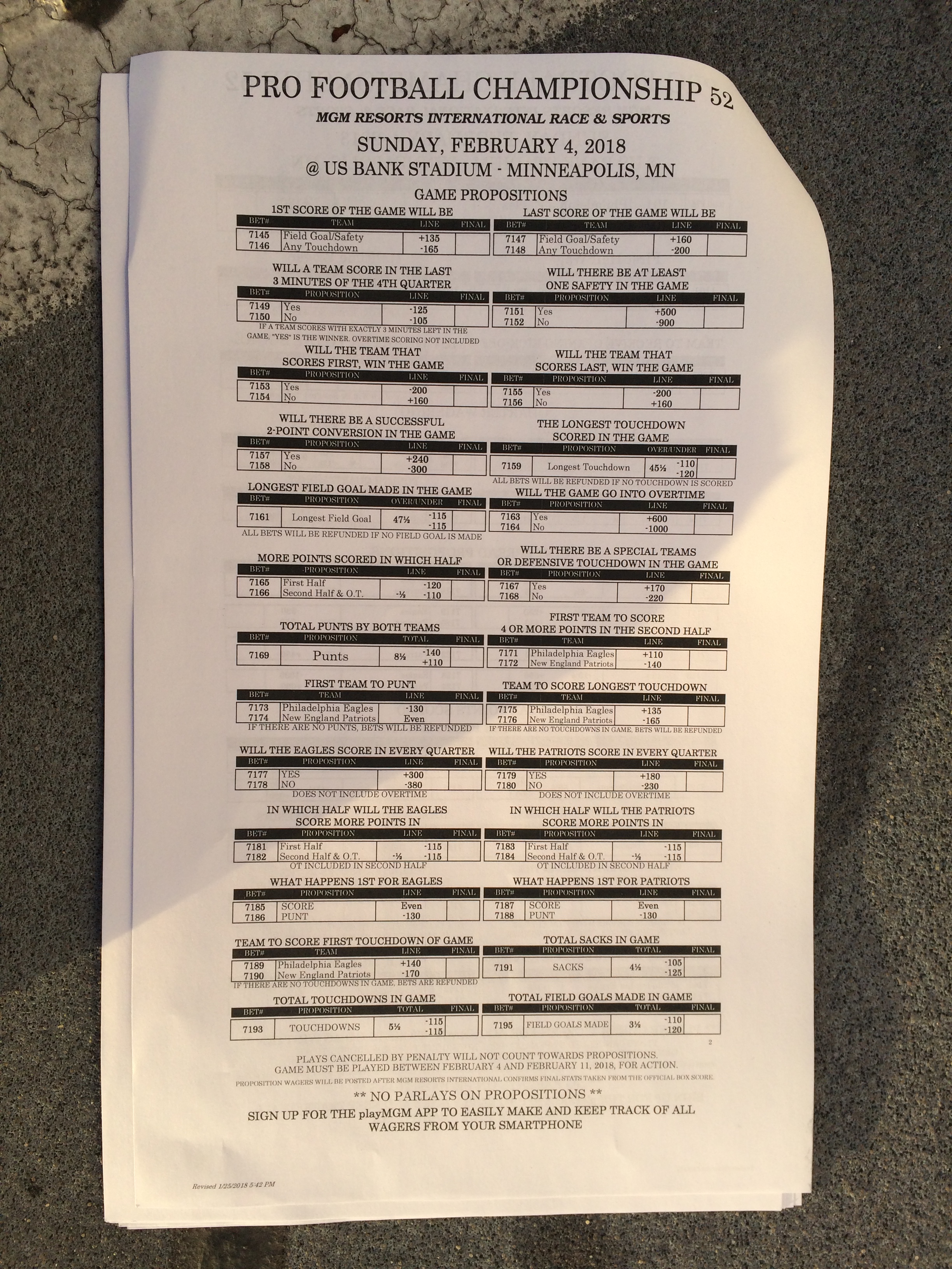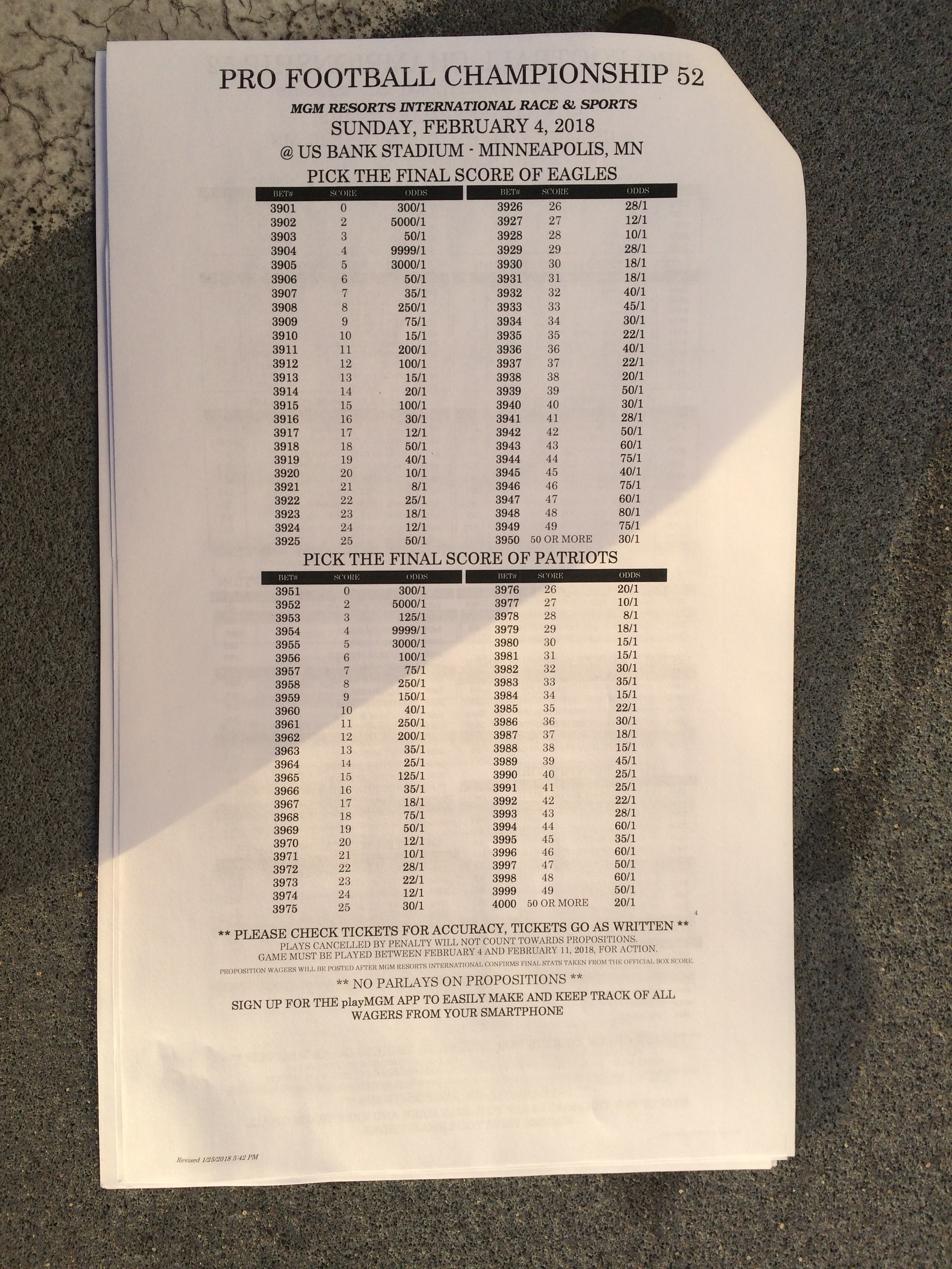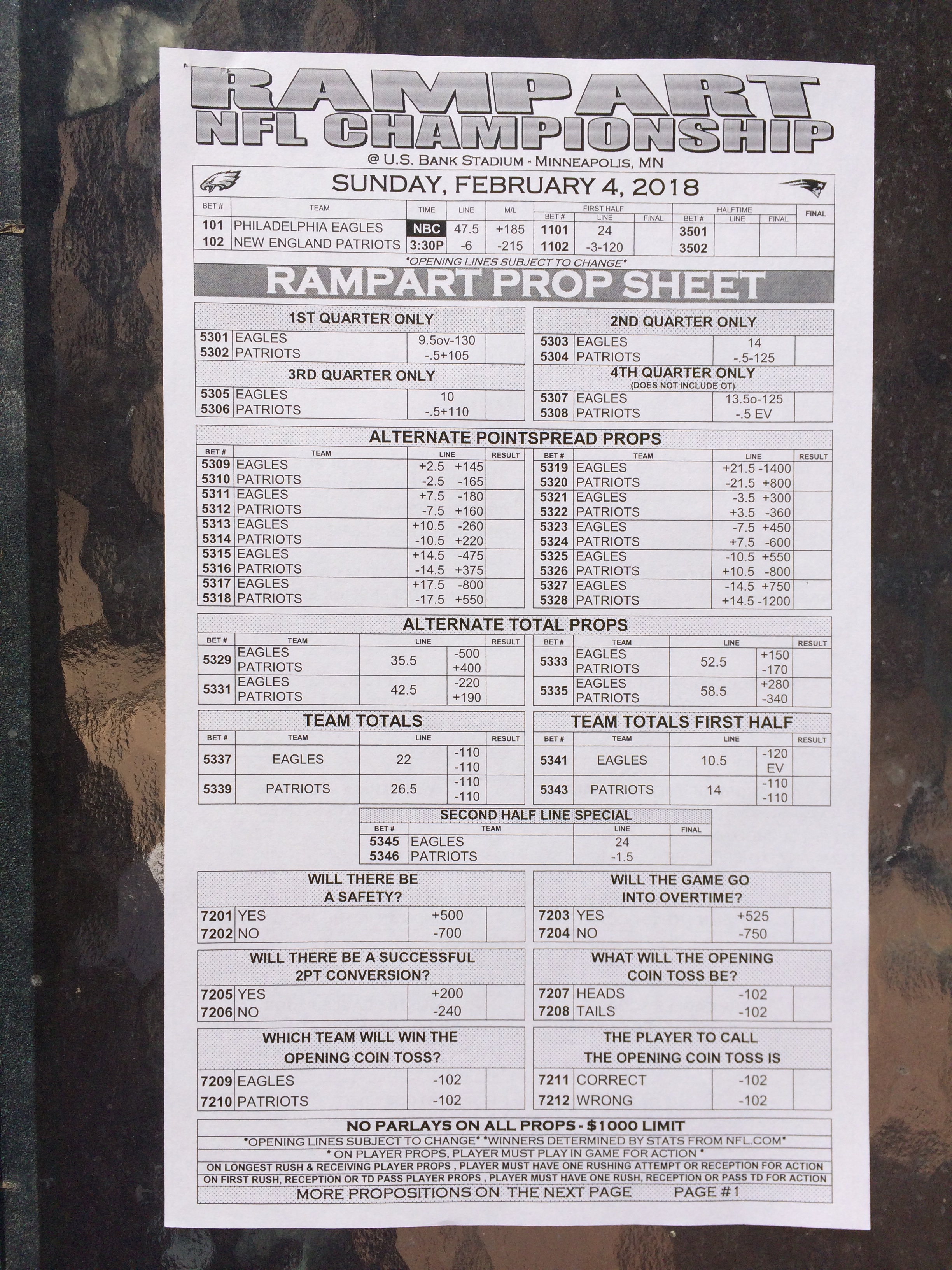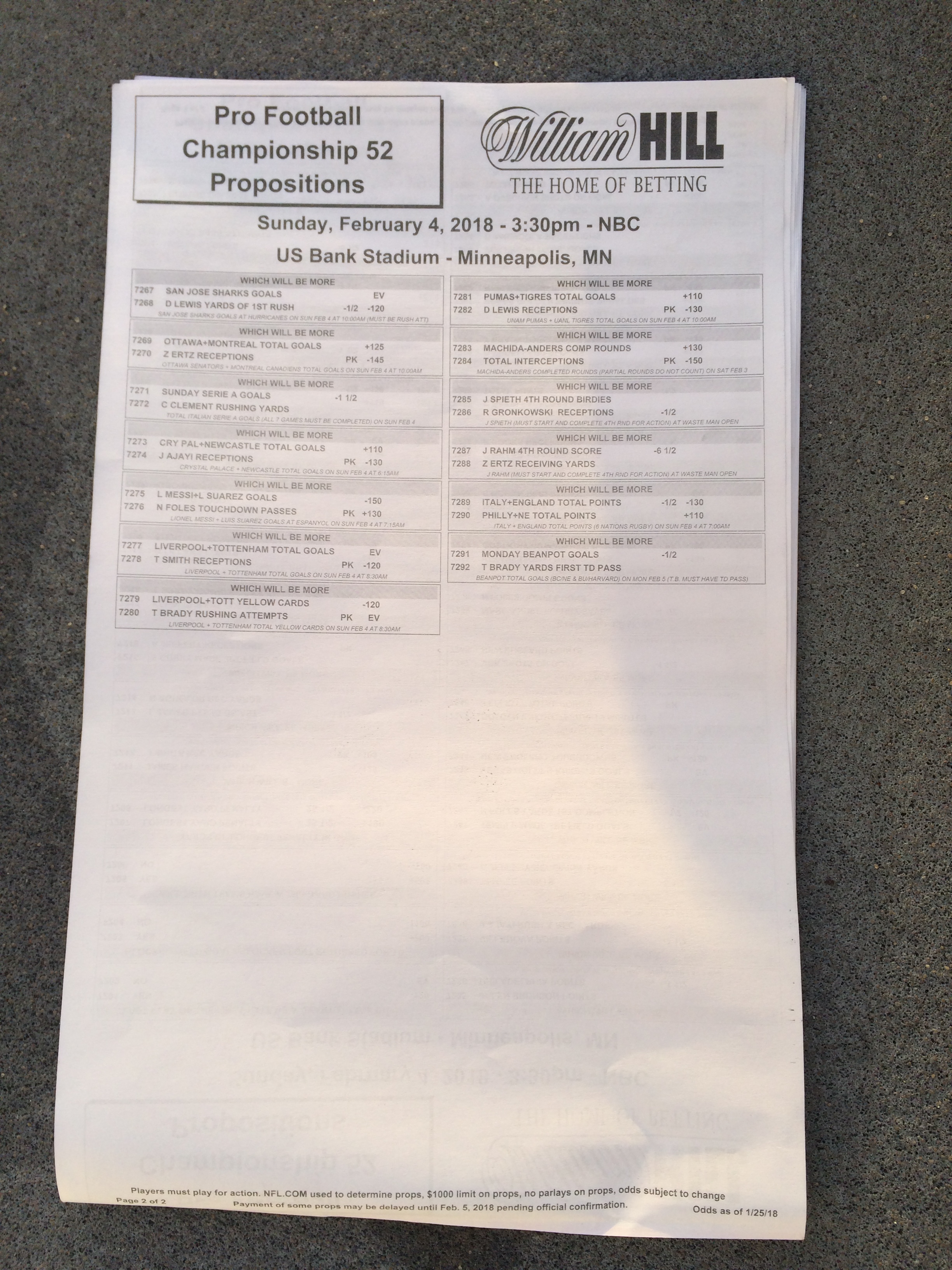 فيما يلي صور لكل صفحة من صفحات رهانات الاقتراحات لدى عدة مكاتب مراهنات رياضية في لاس فيغاس. جُمعت هذه الأوراق في ٢٧ يناير ٢٠١٨، أي قبل ثمانية أيام من المباراة.