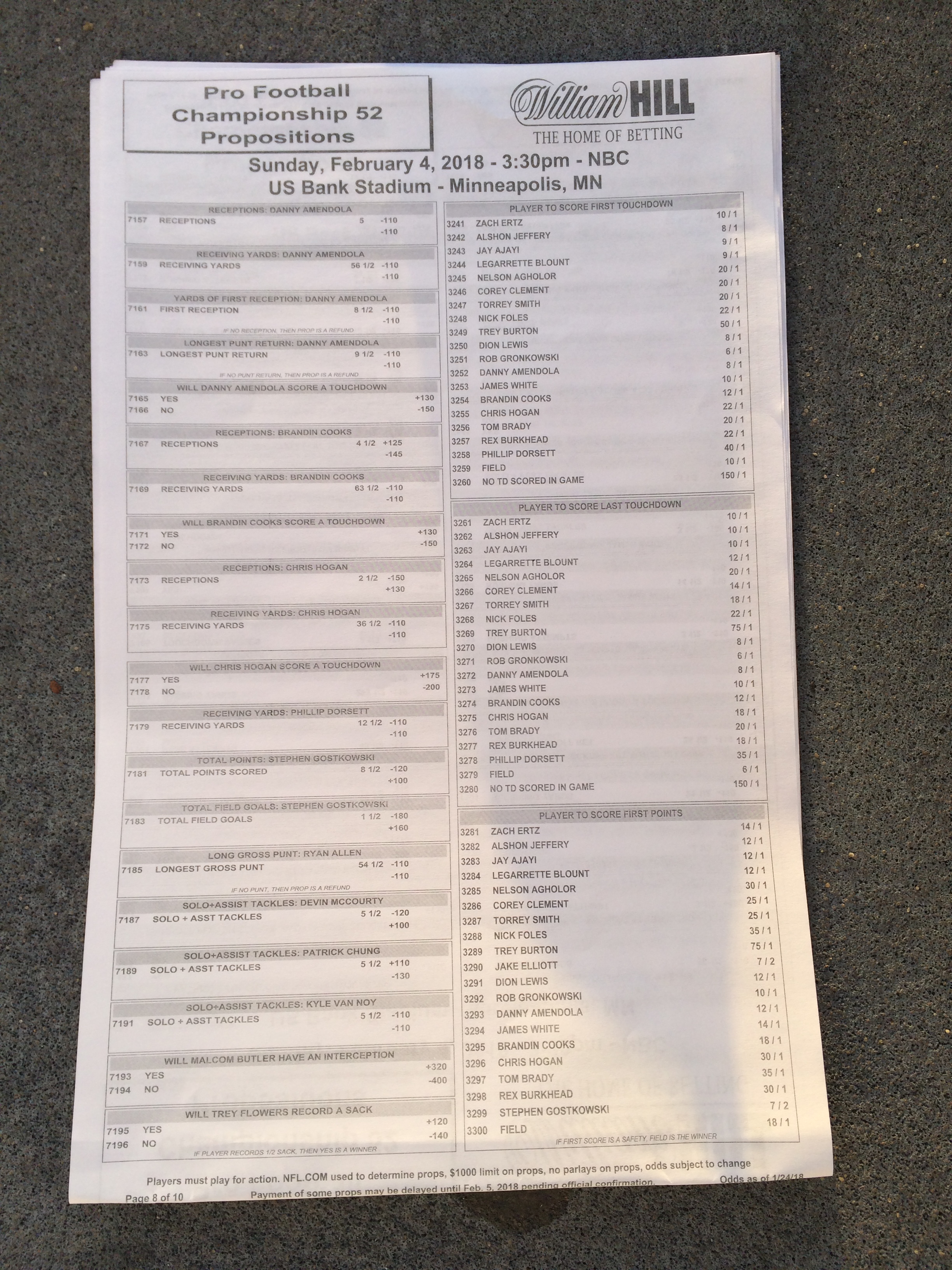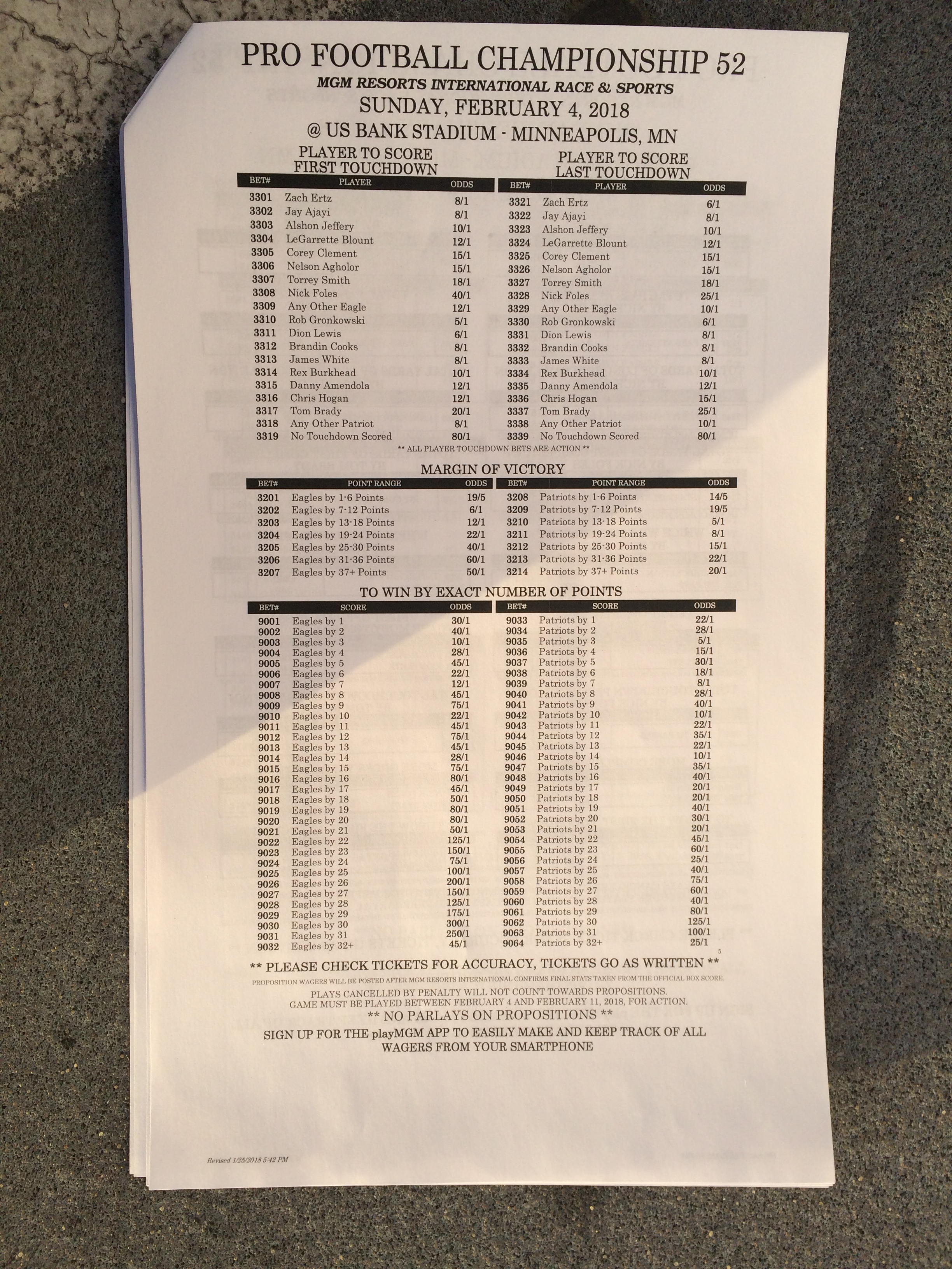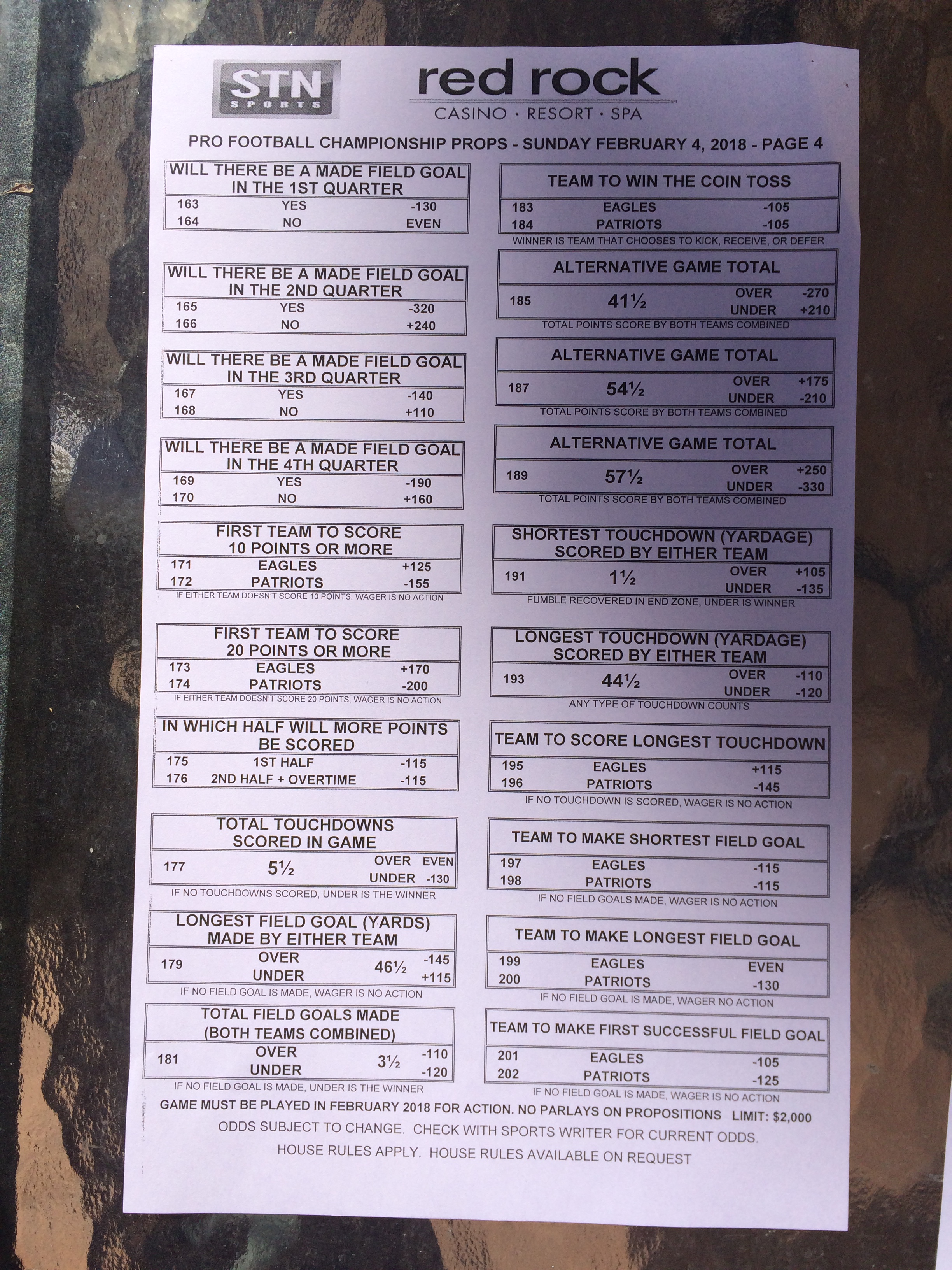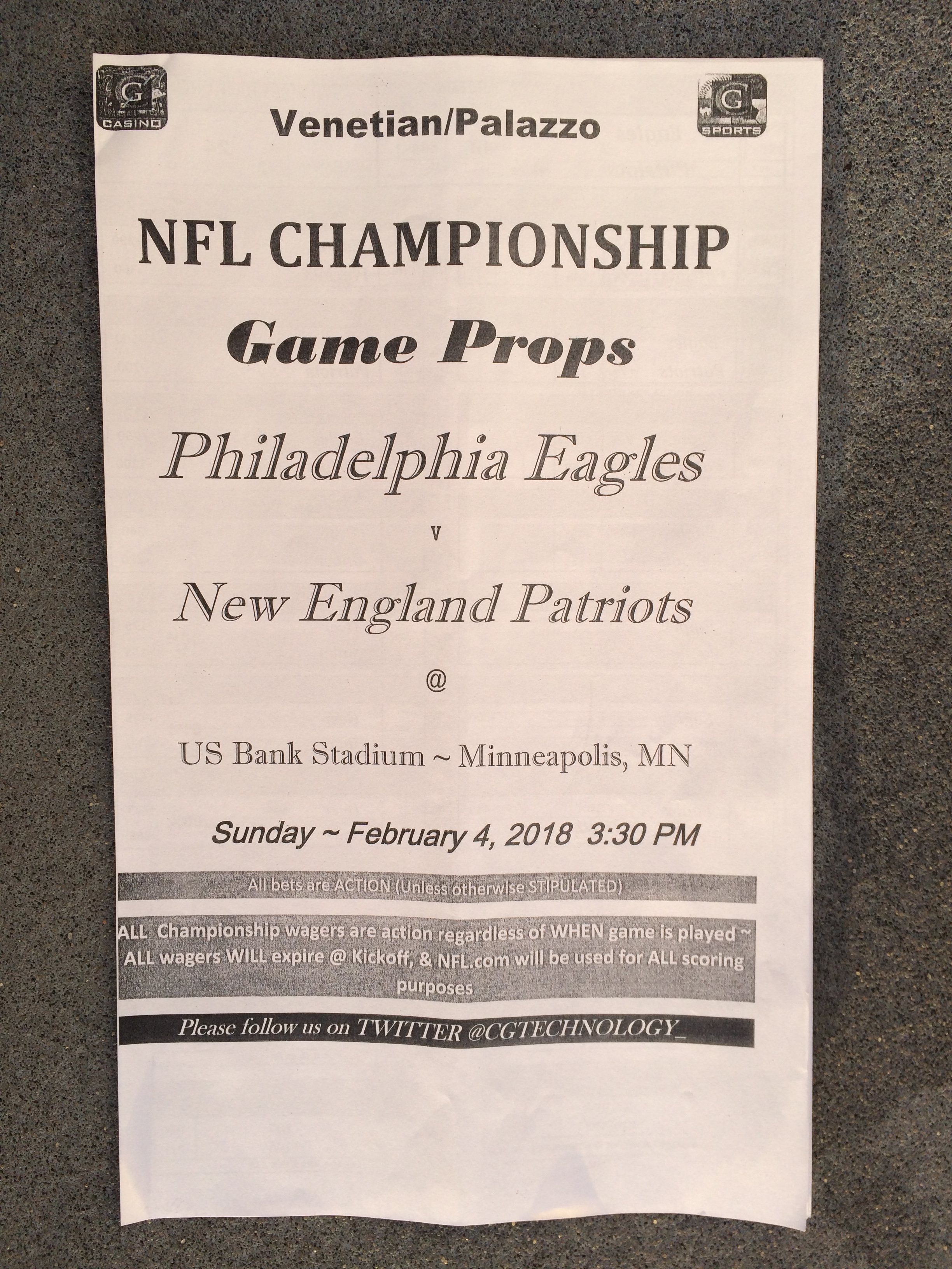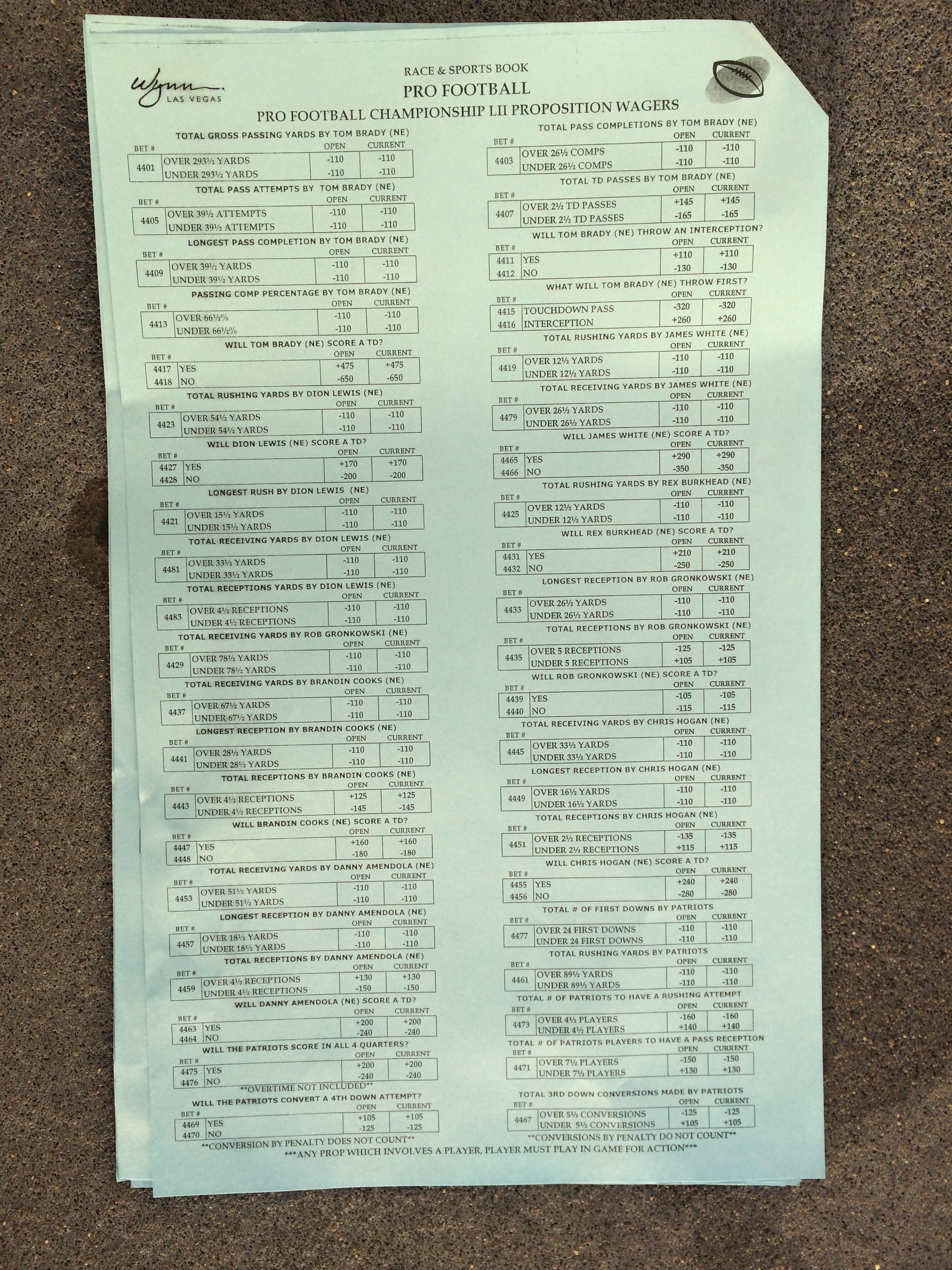 فيما يلي صور لكل صفحة من صفحات رهانات الاقتراحات لدى عدة مكاتب مراهنات رياضية في لاس فيغاس. جُمعت هذه الأوراق في ٢٧ يناير ٢٠١٨، أي قبل ثمانية أيام من المباراة.