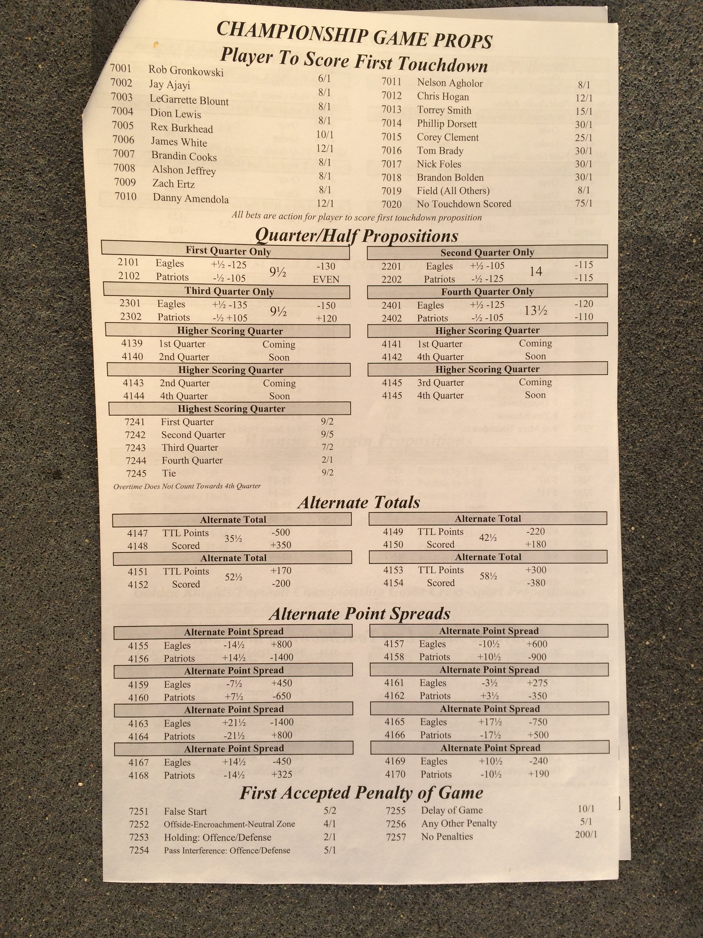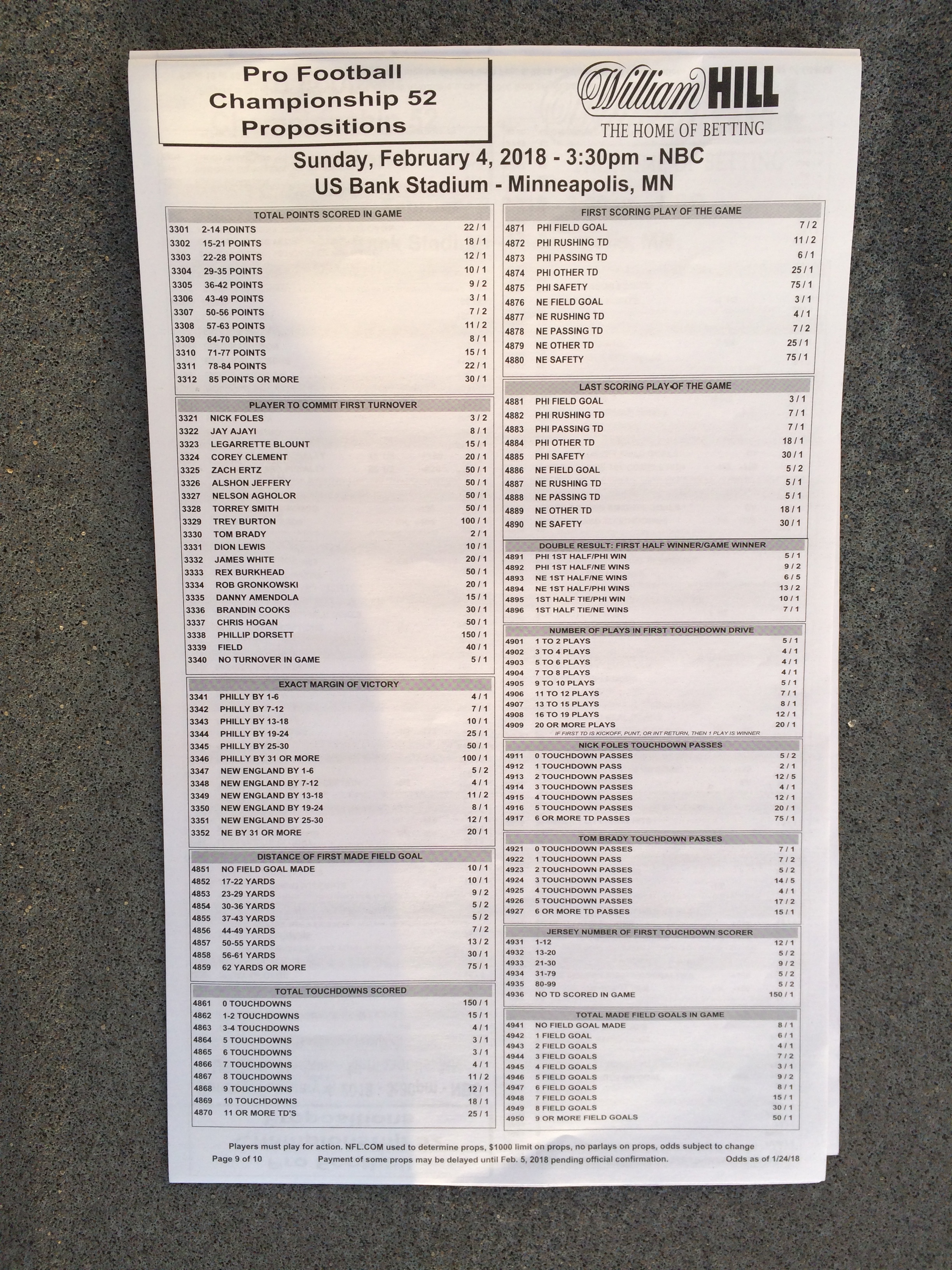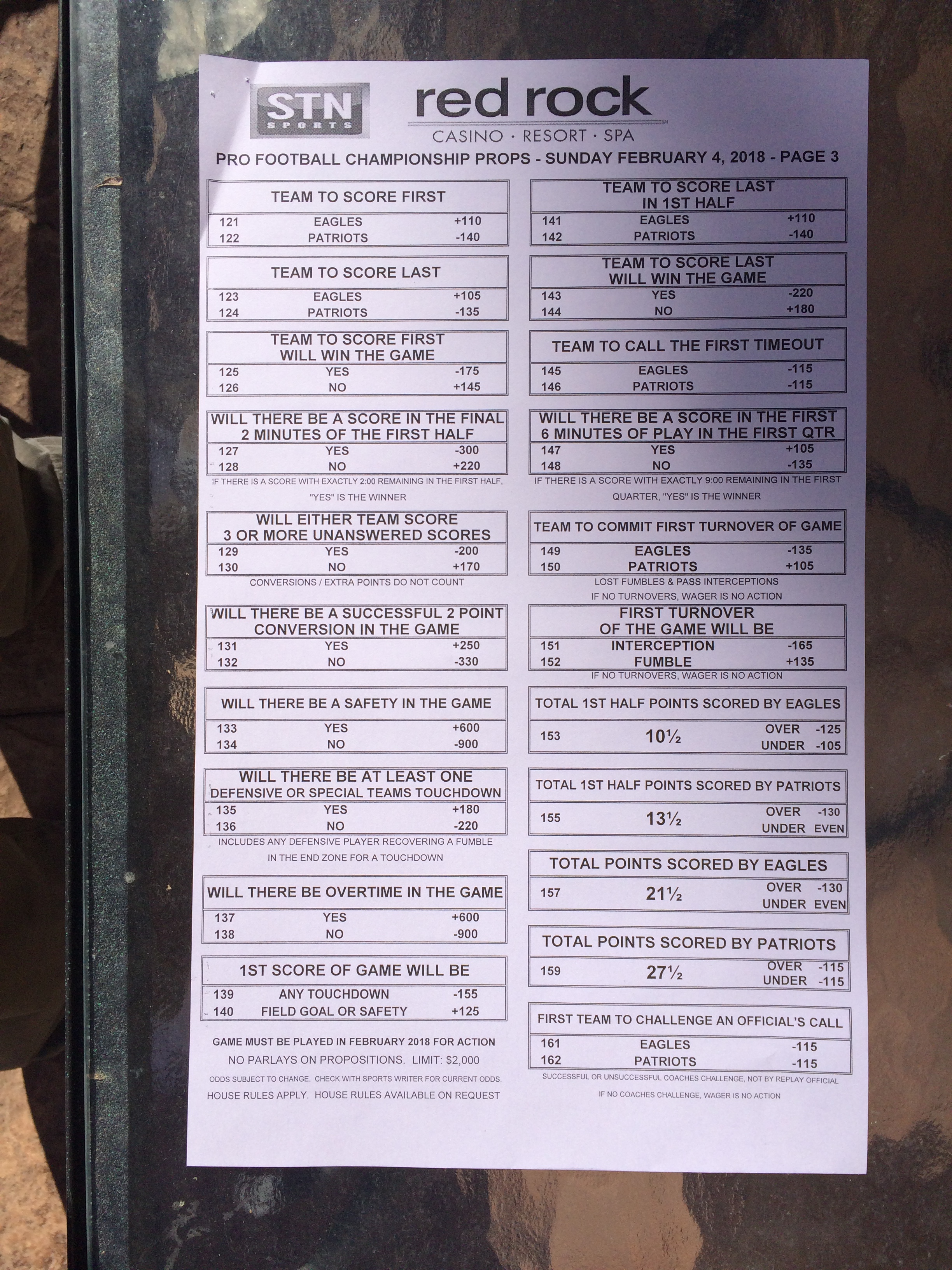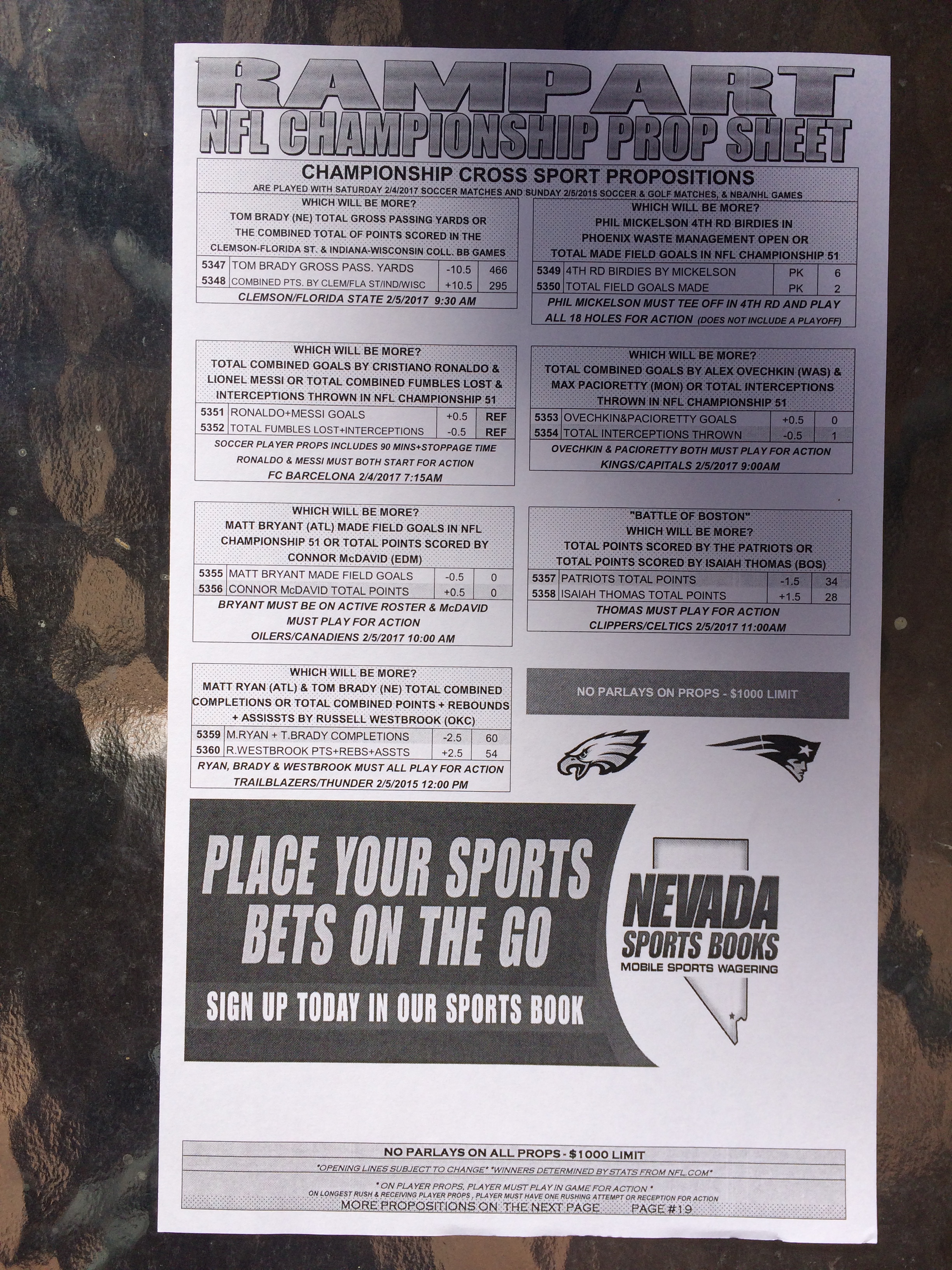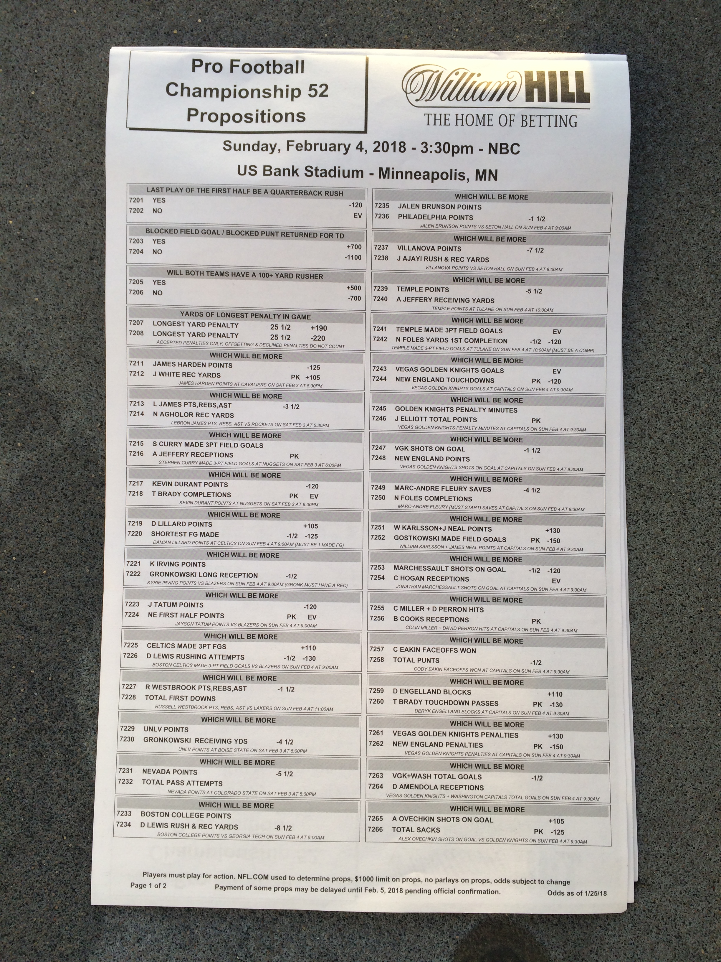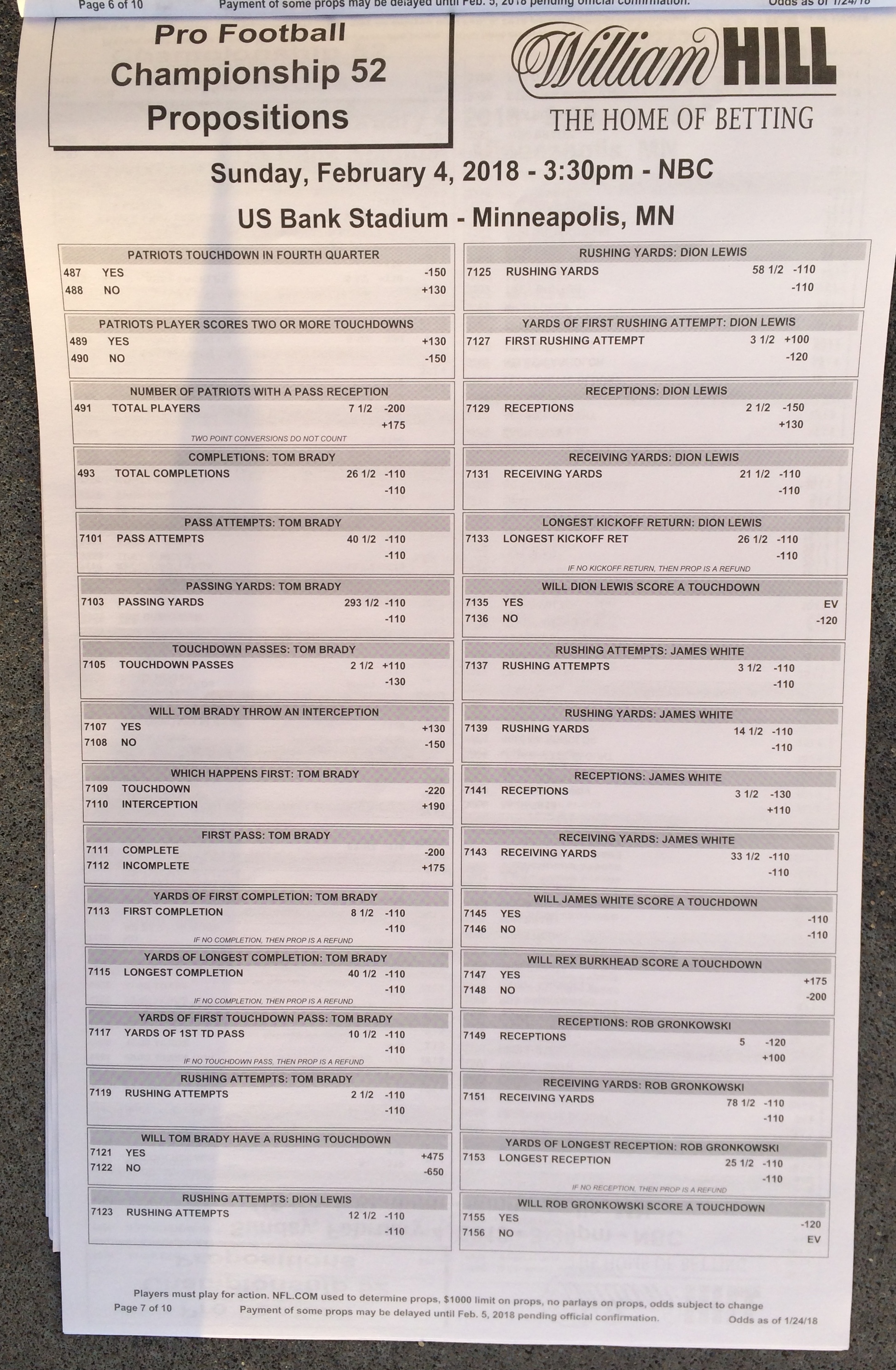 فيما يلي صور لكل صفحة من صفحات رهانات الاقتراحات لدى عدة مكاتب مراهنات رياضية في لاس فيغاس. جُمعت هذه الأوراق في ٢٧ يناير ٢٠١٨، أي قبل ثمانية أيام من المباراة.