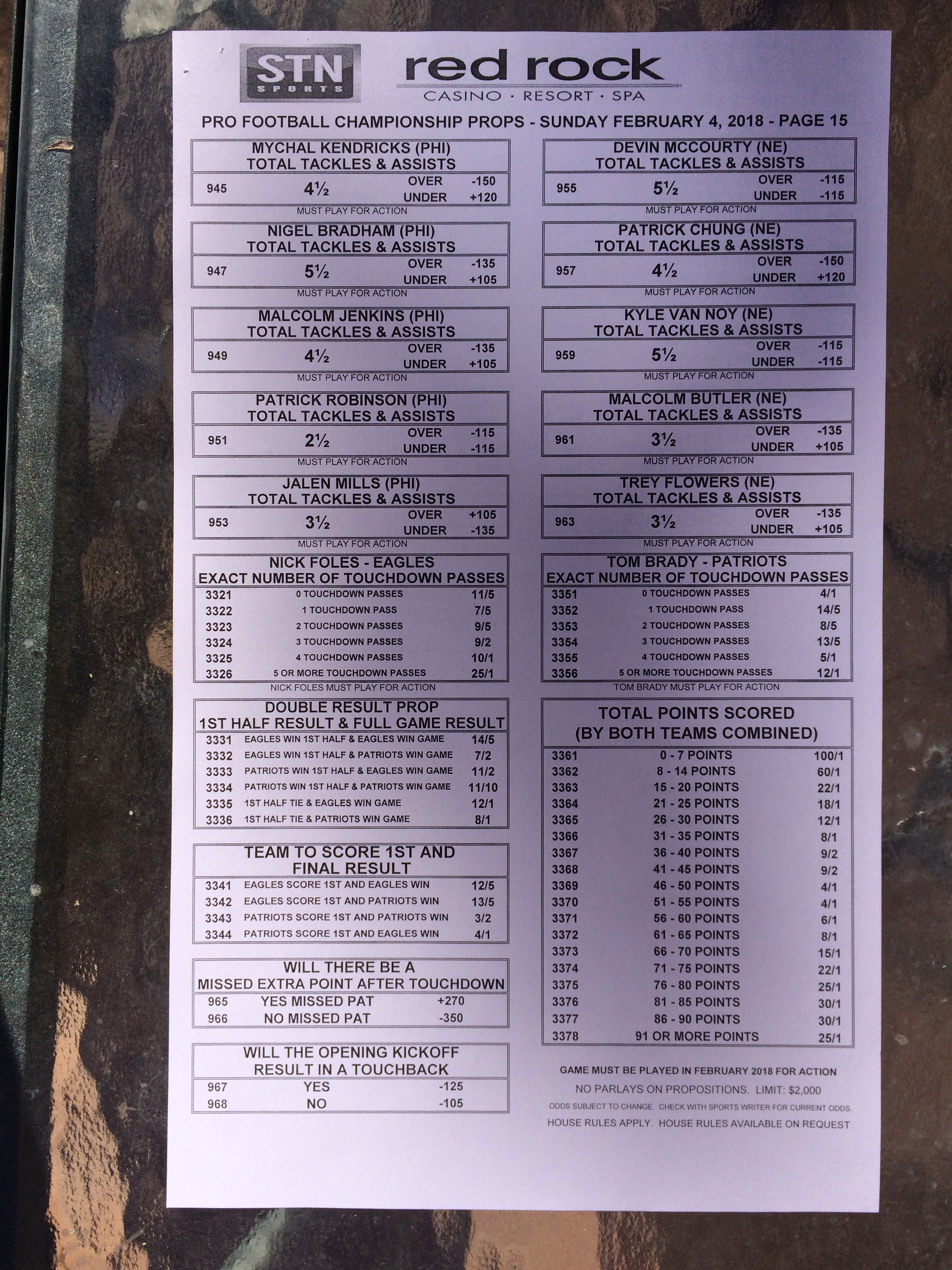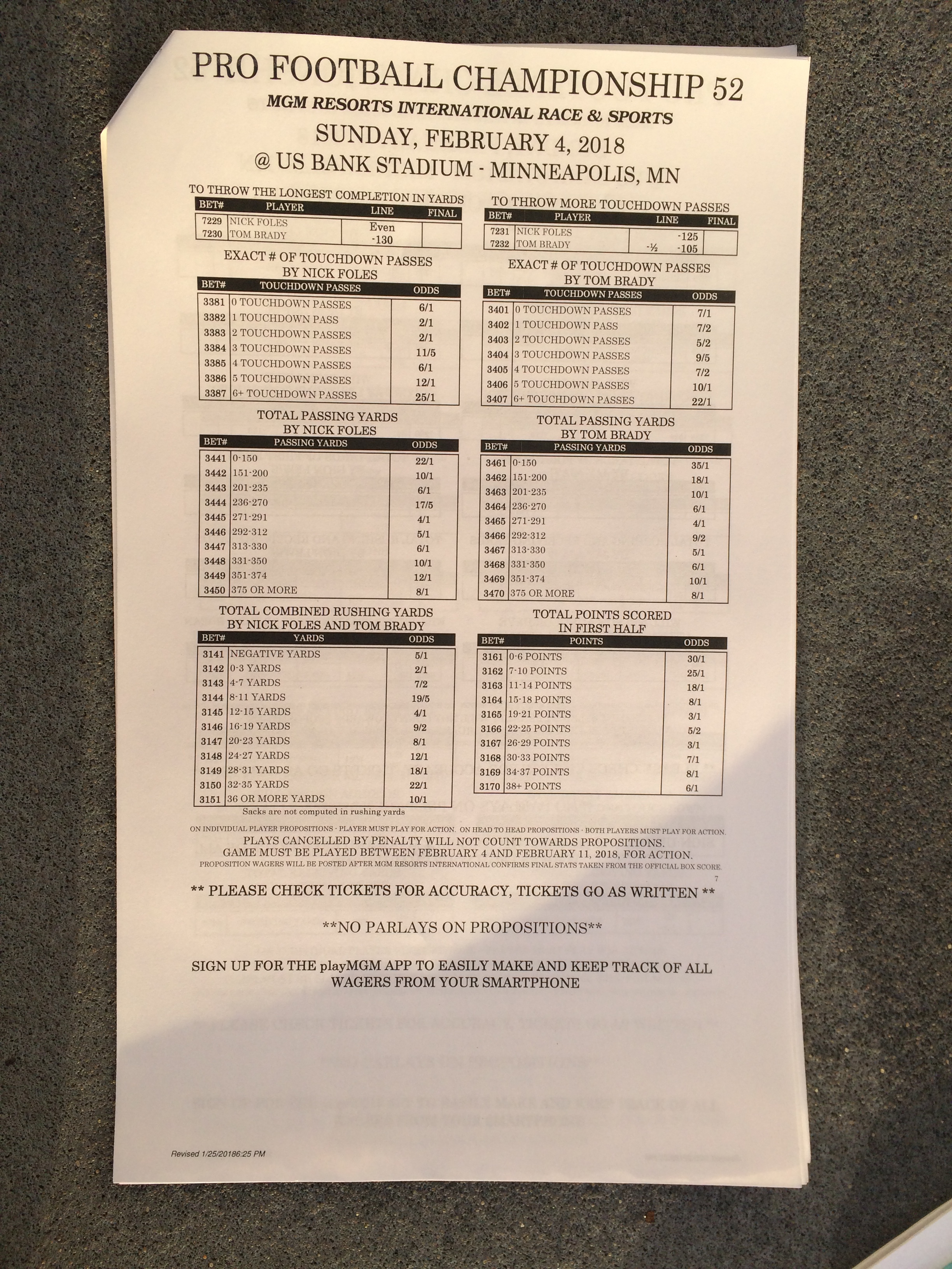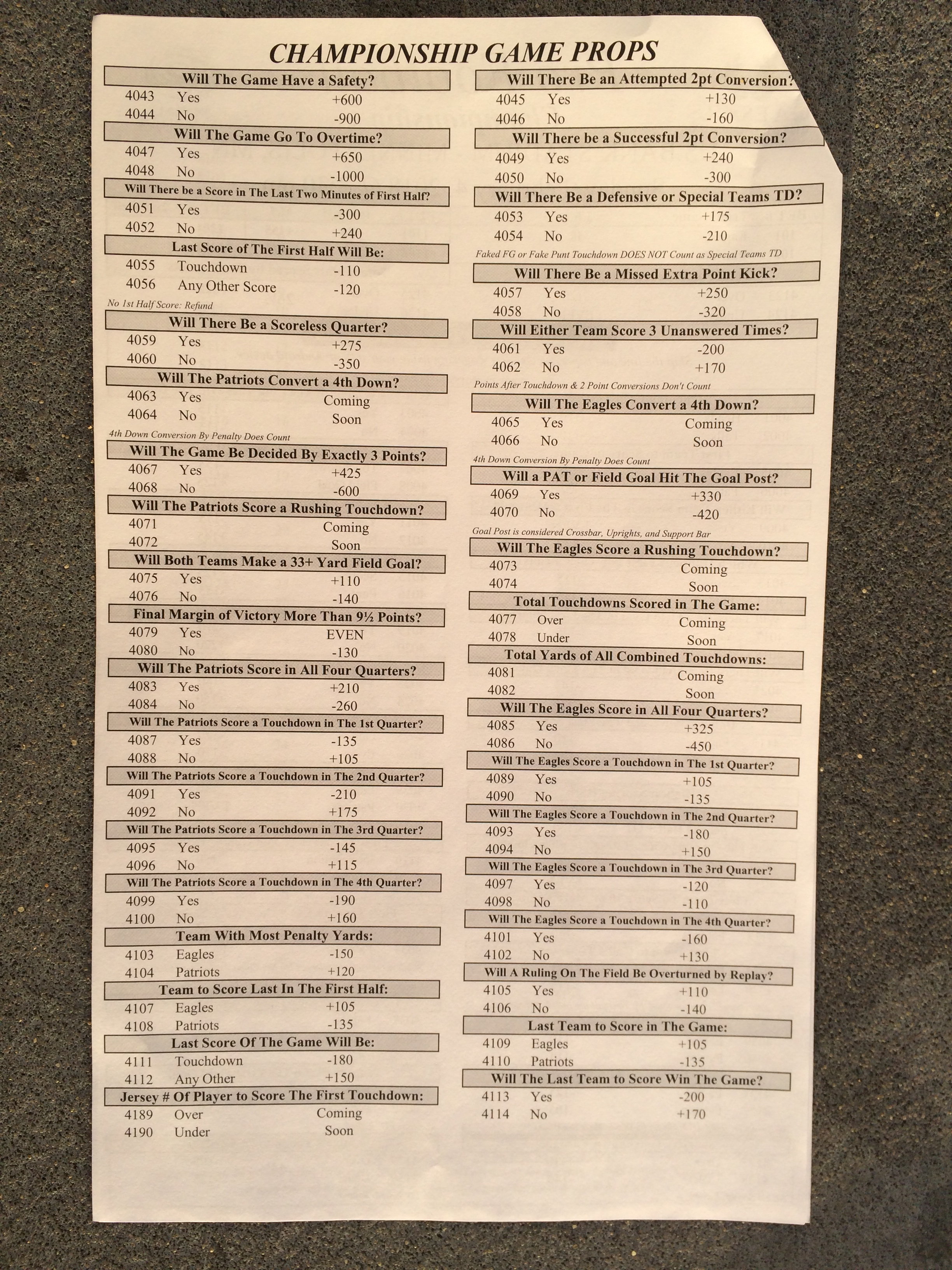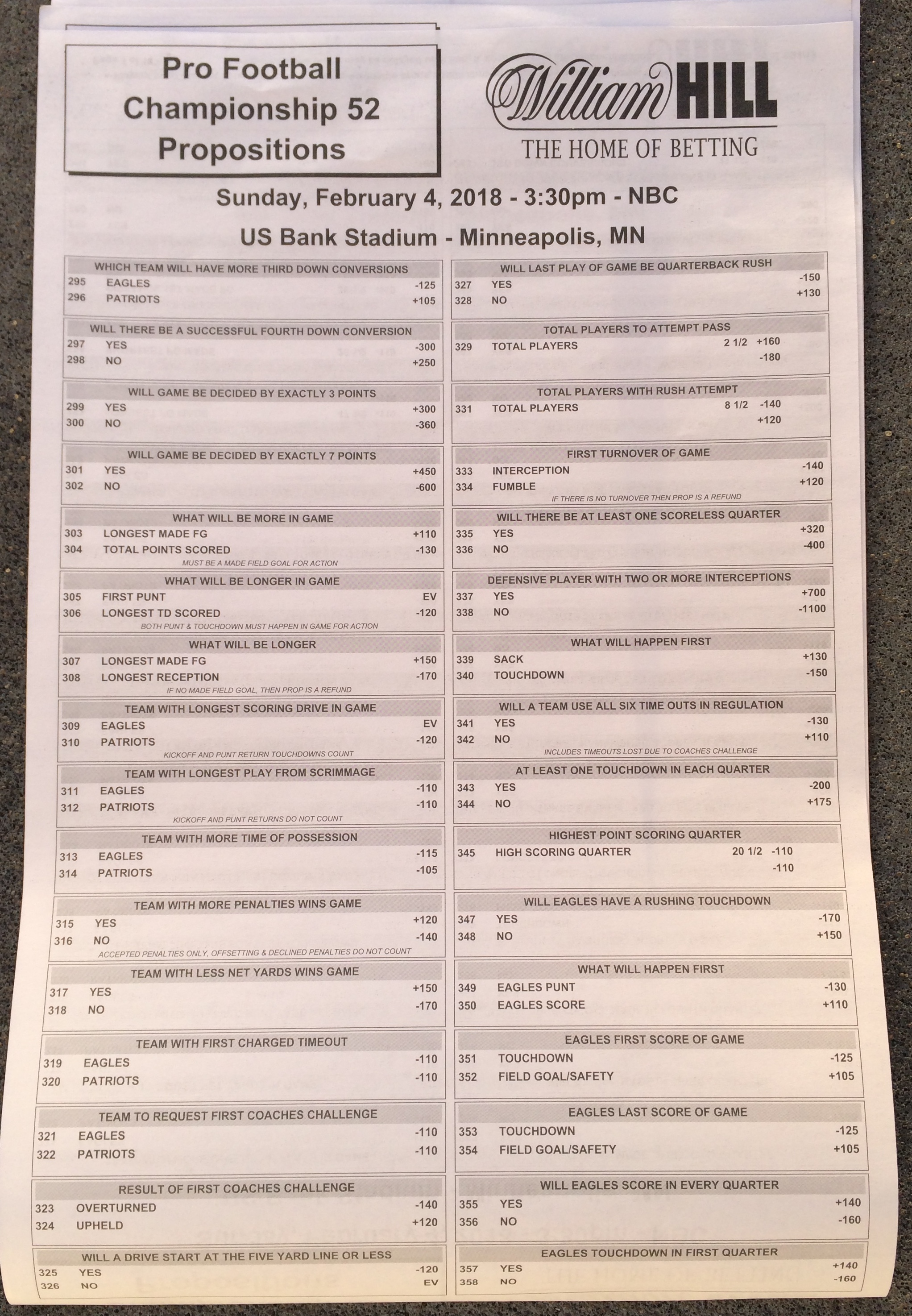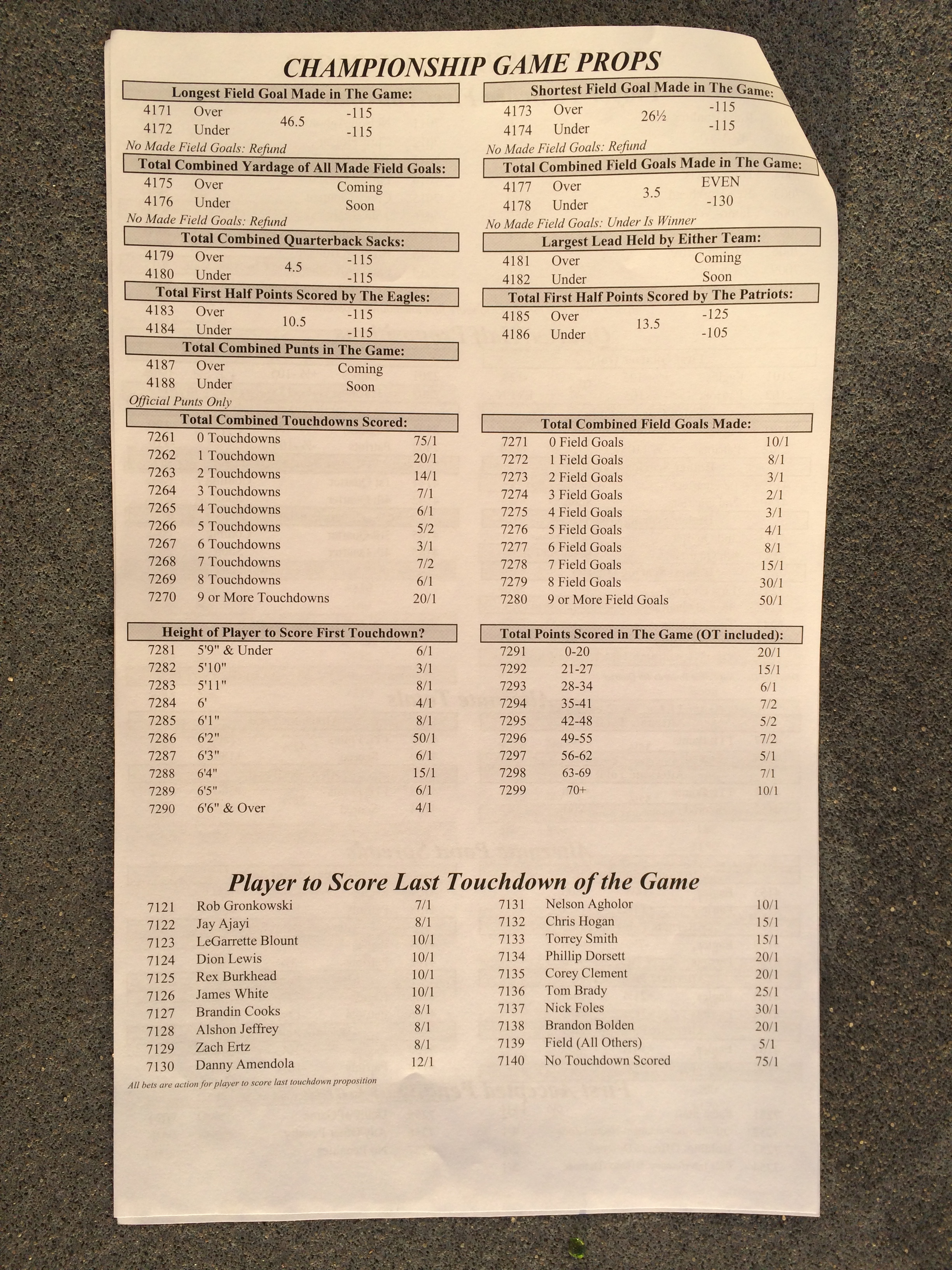 فيما يلي صور لكل صفحة من صفحات رهانات الاقتراحات لدى عدة مكاتب مراهنات رياضية في لاس فيغاس. جُمعت هذه الأوراق في ٢٧ يناير ٢٠١٨، أي قبل ثمانية أيام من المباراة.