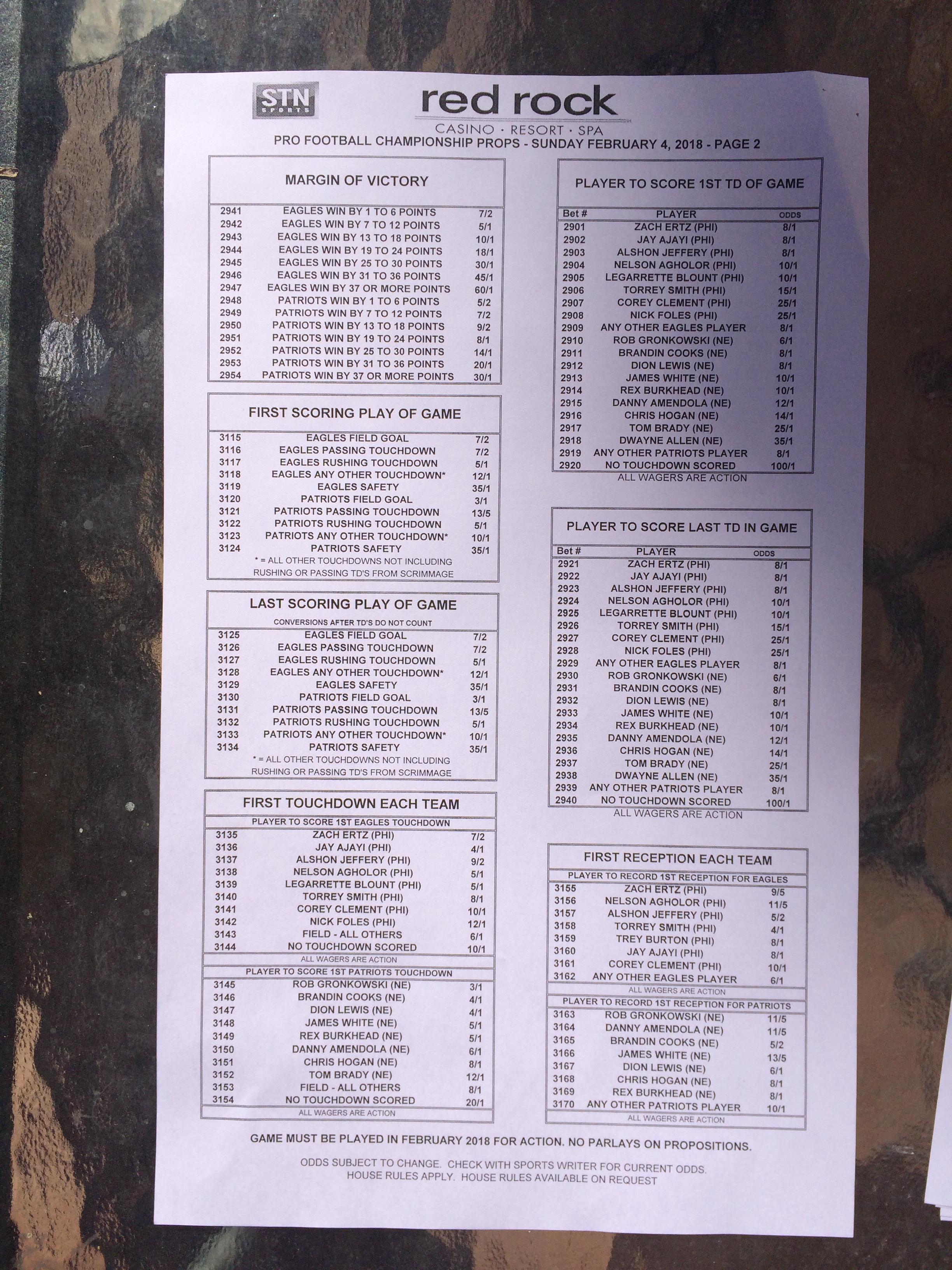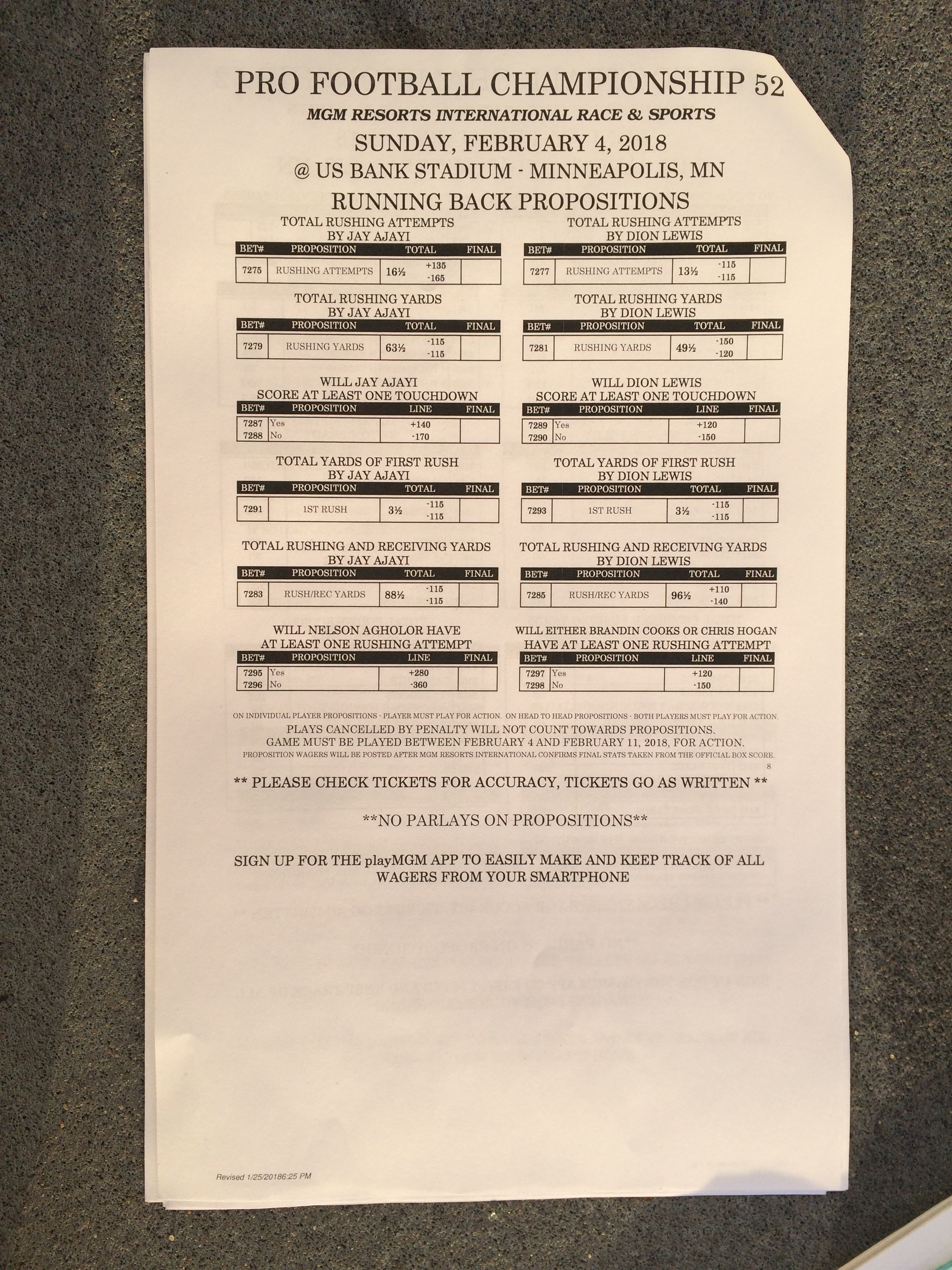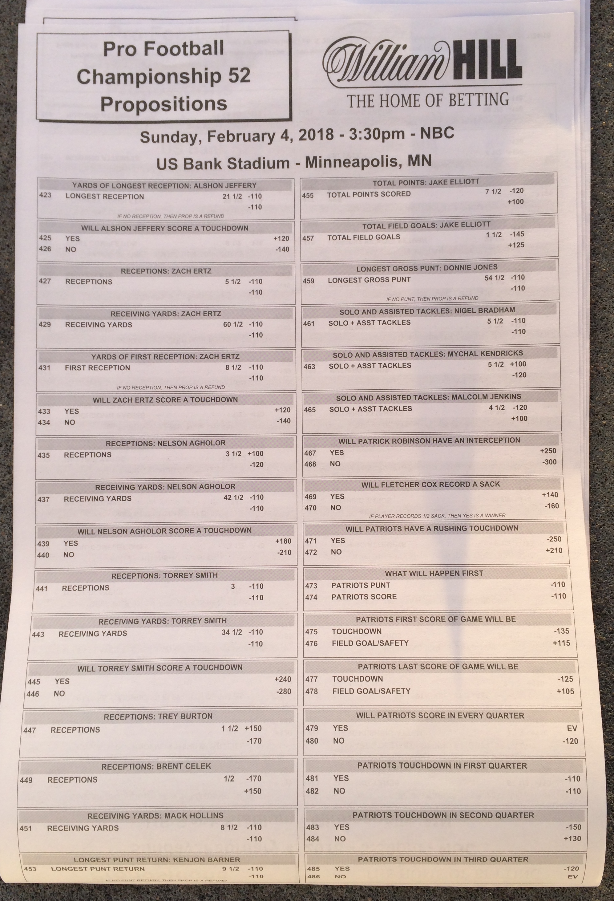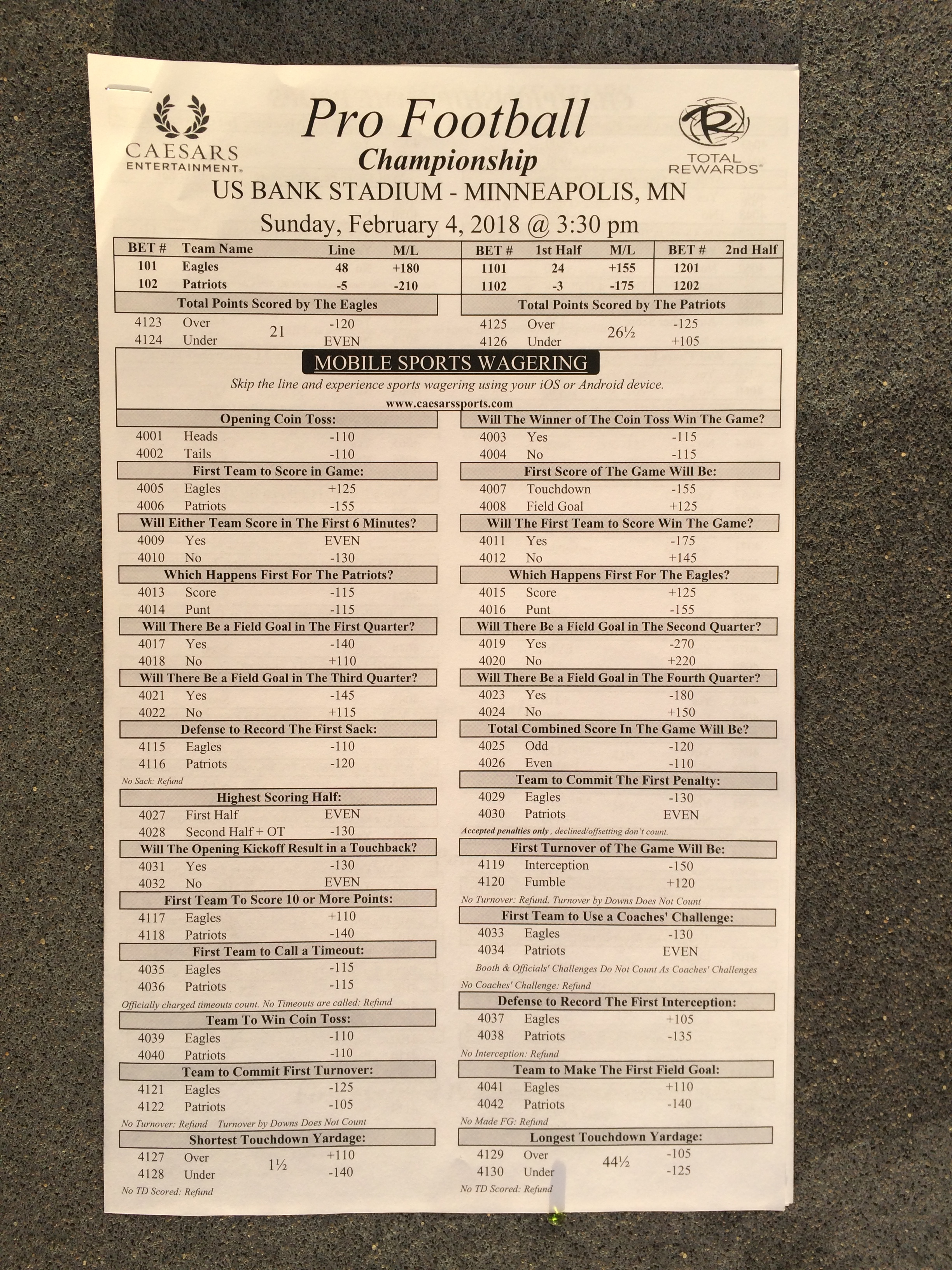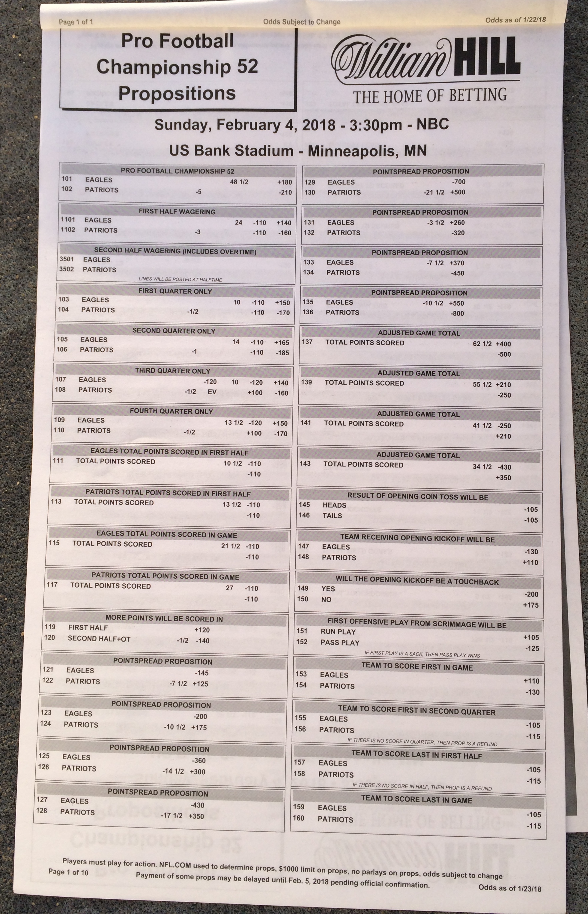 فيما يلي صور لكل صفحة من صفحات رهانات الاقتراحات لدى عدة مكاتب مراهنات رياضية في لاس فيغاس. جُمعت هذه الأوراق في ٢٧ يناير ٢٠١٨، أي قبل ثمانية أيام من المباراة.