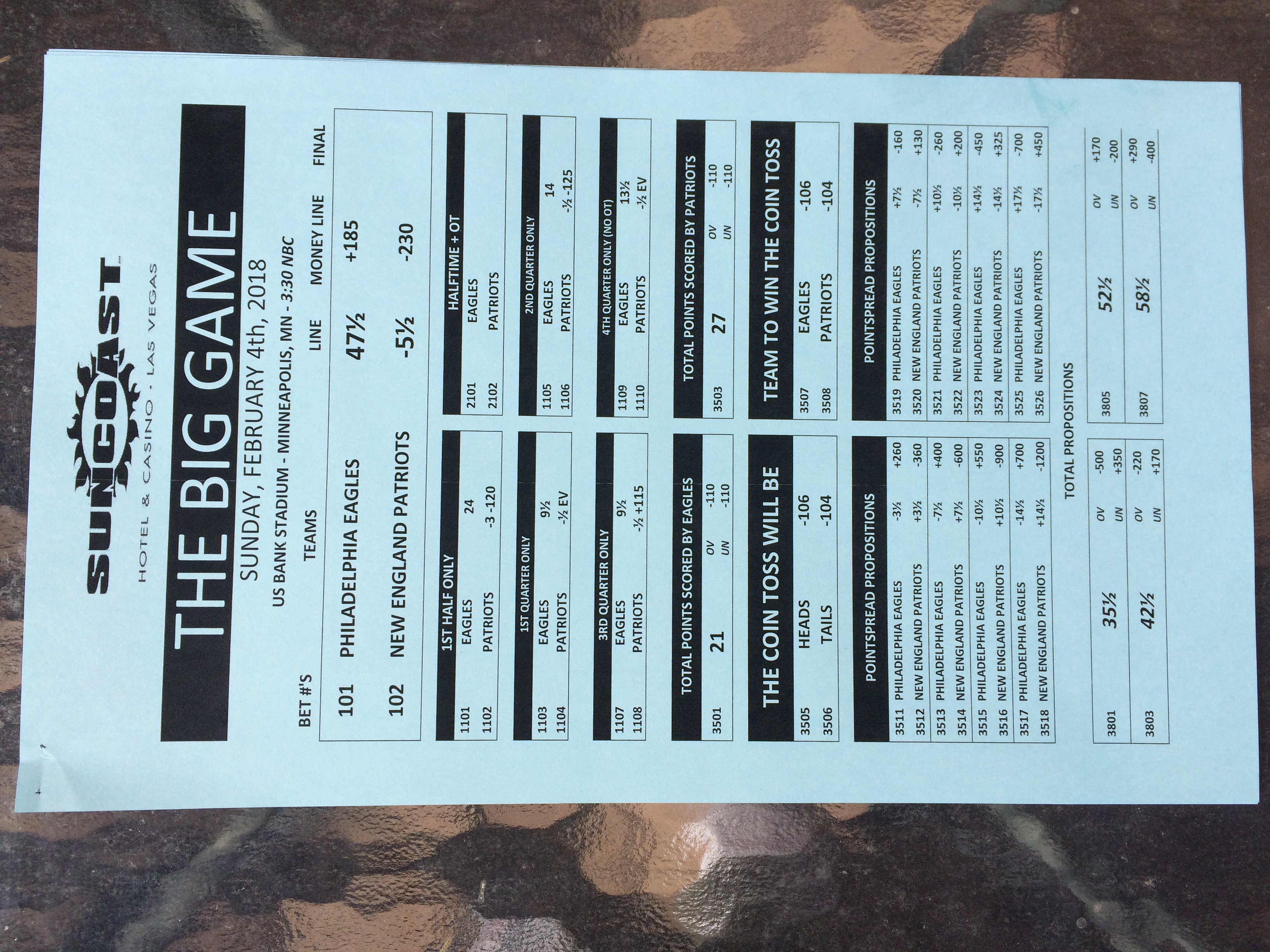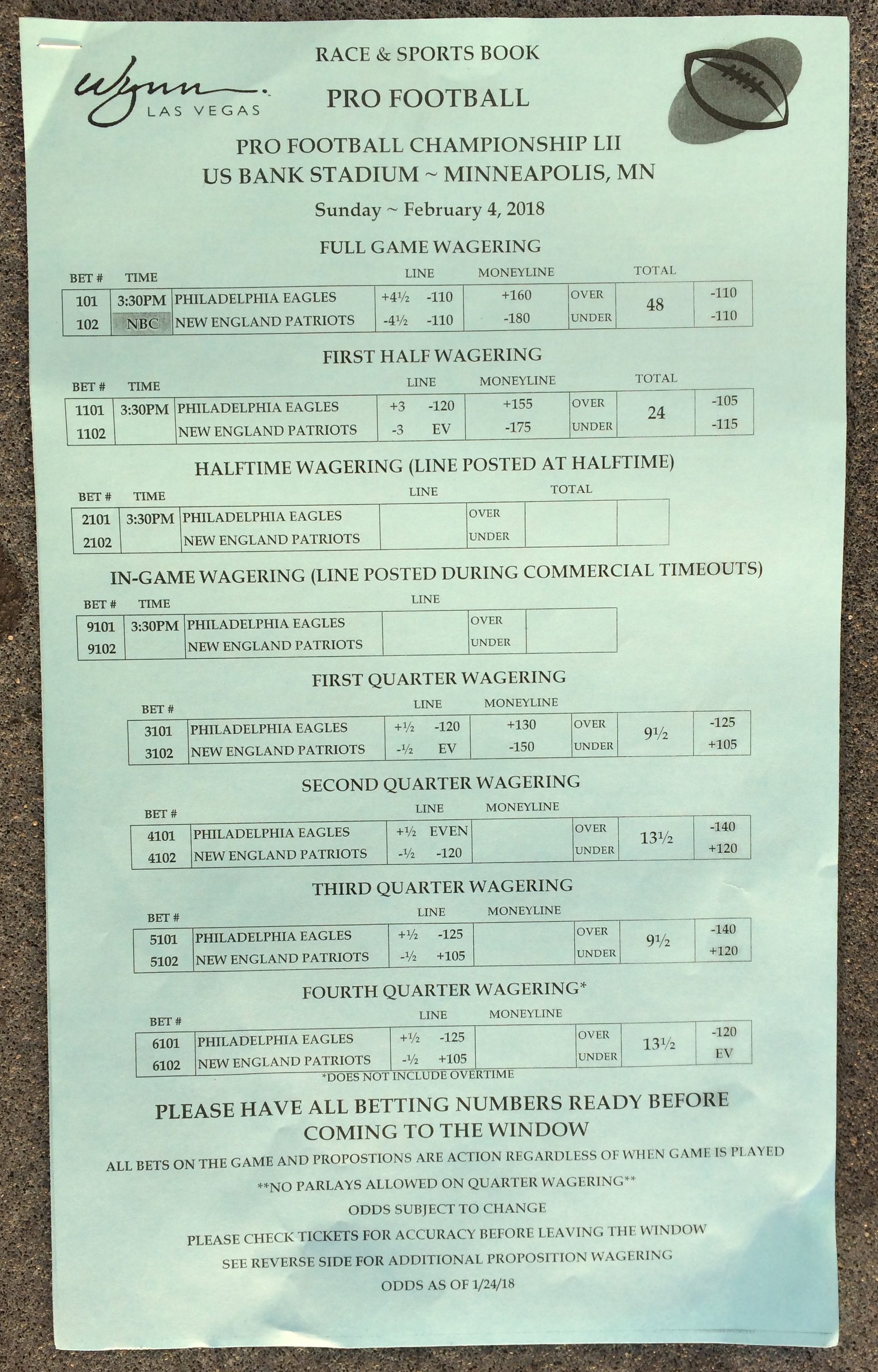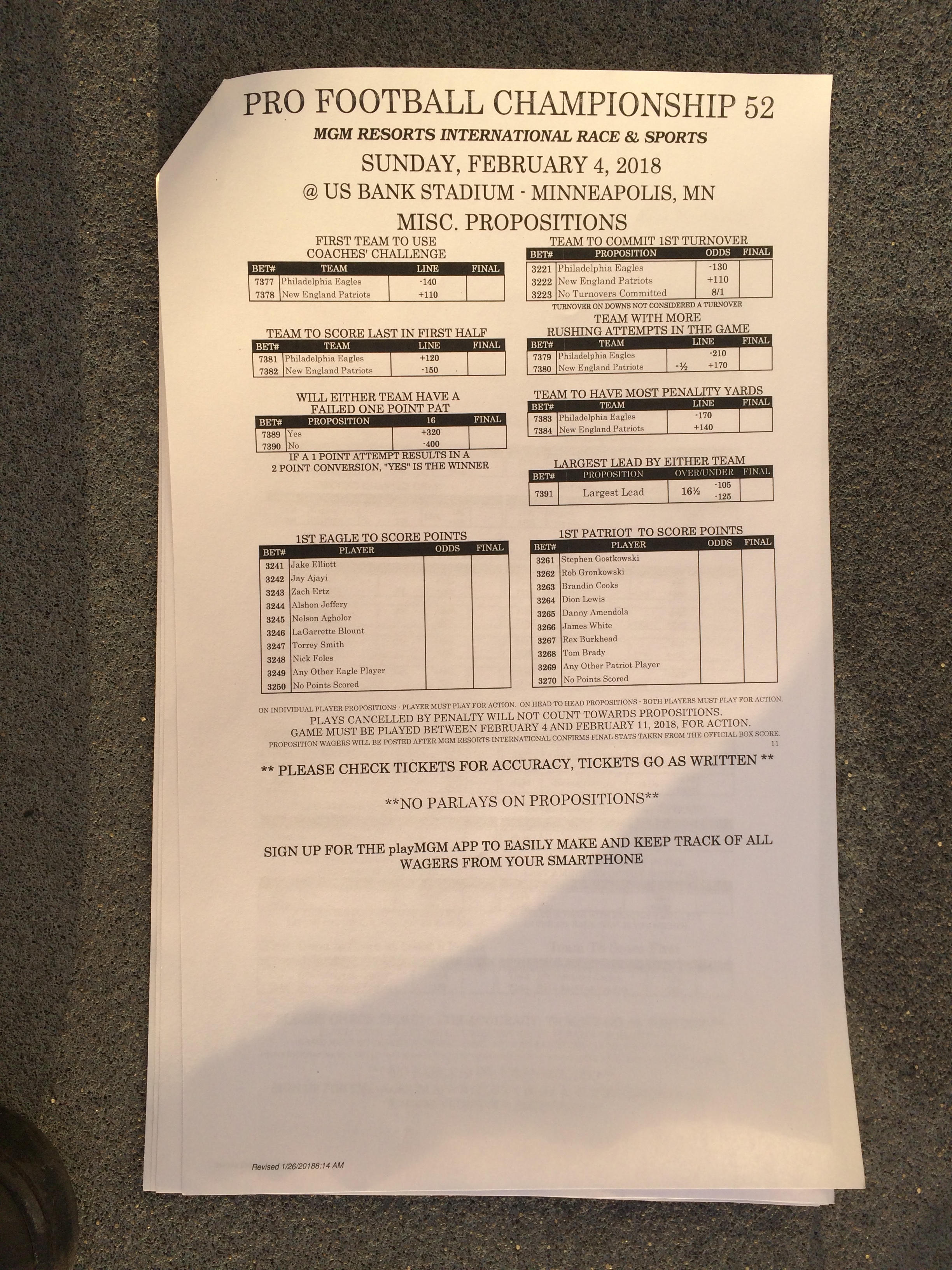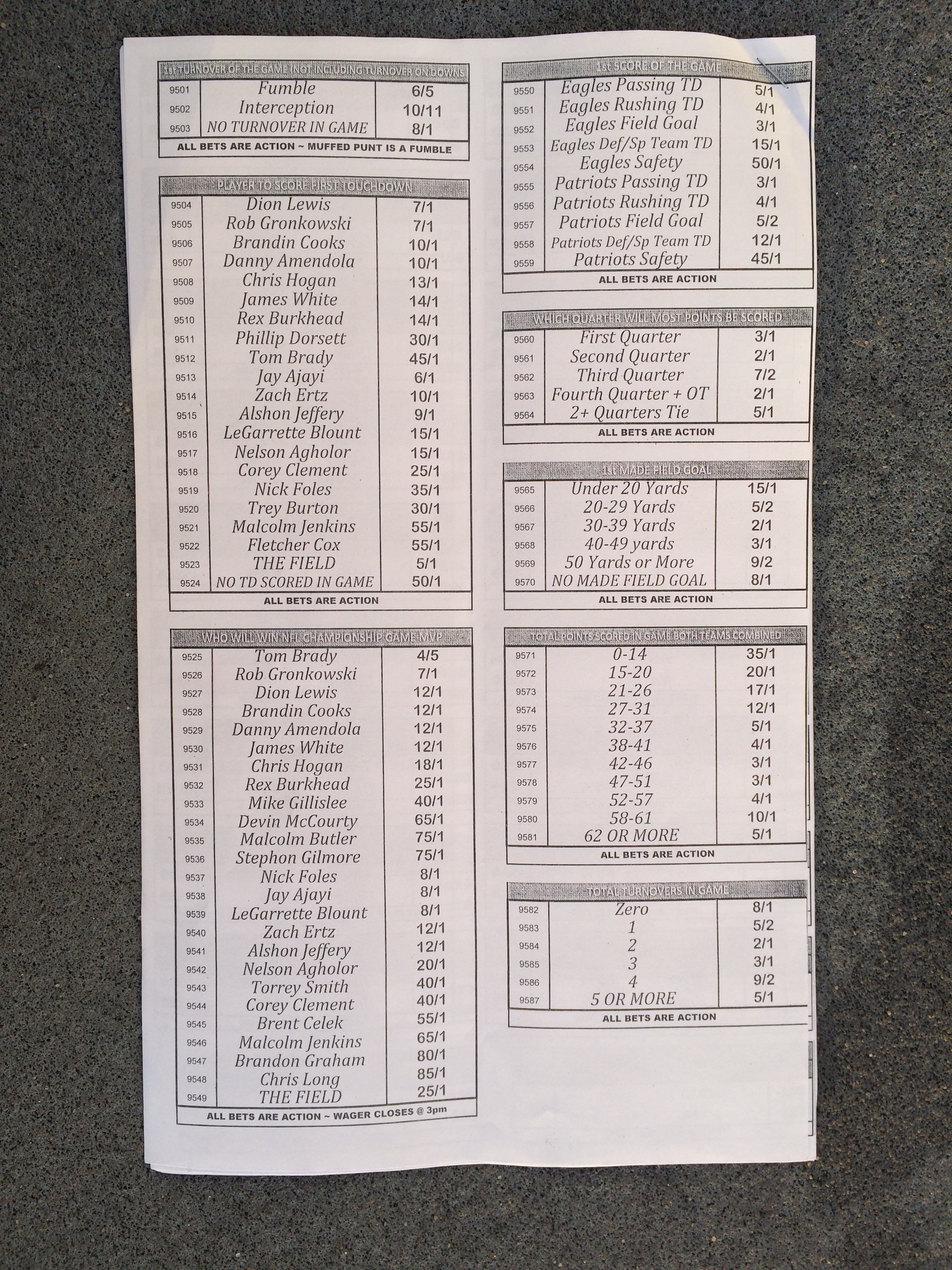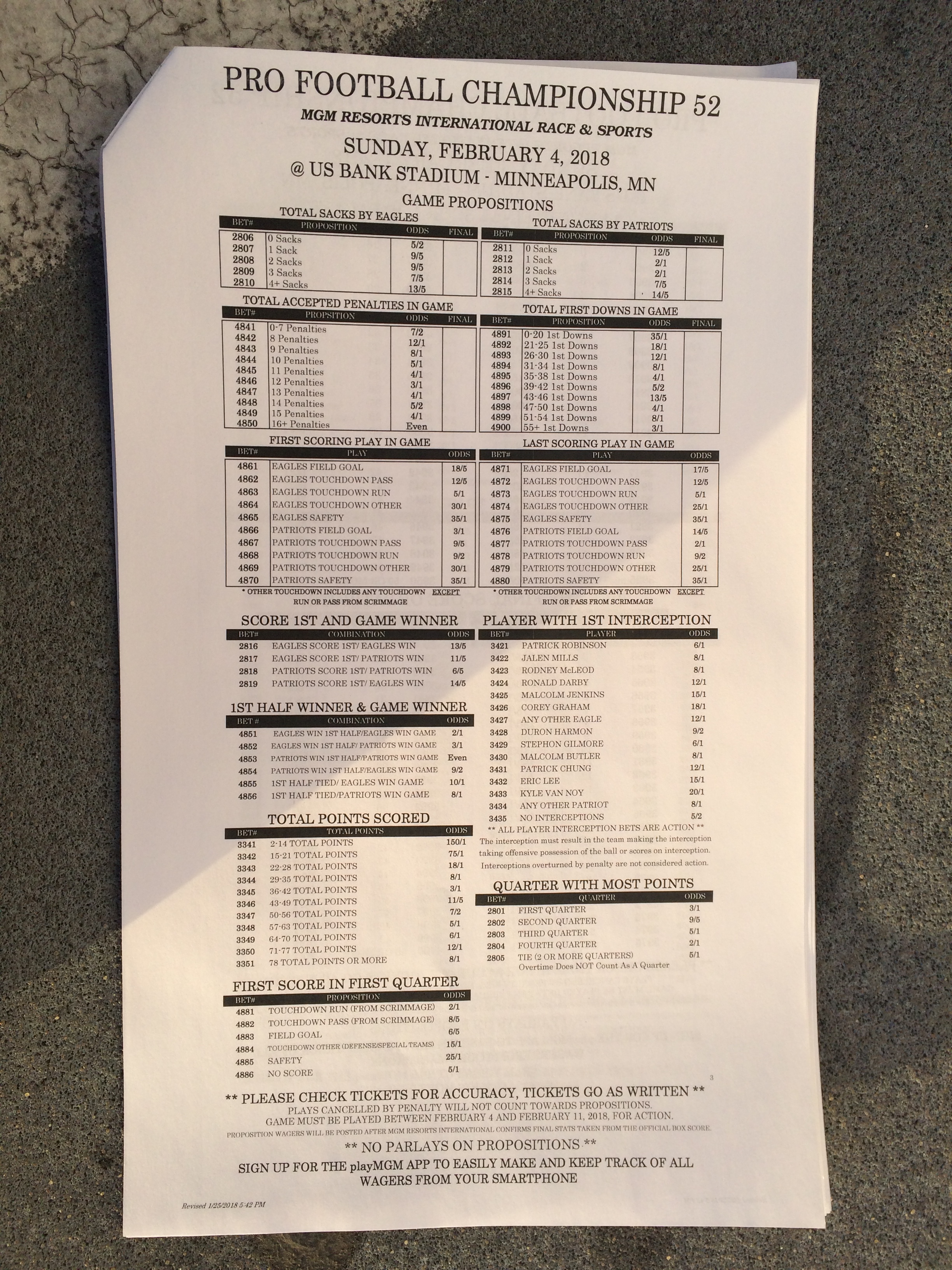 فيما يلي صور لكل صفحة من صفحات رهانات الاقتراحات لدى عدة مكاتب مراهنات رياضية في لاس فيغاس. جُمعت هذه الأوراق في ٢٧ يناير ٢٠١٨، أي قبل ثمانية أيام من المباراة.