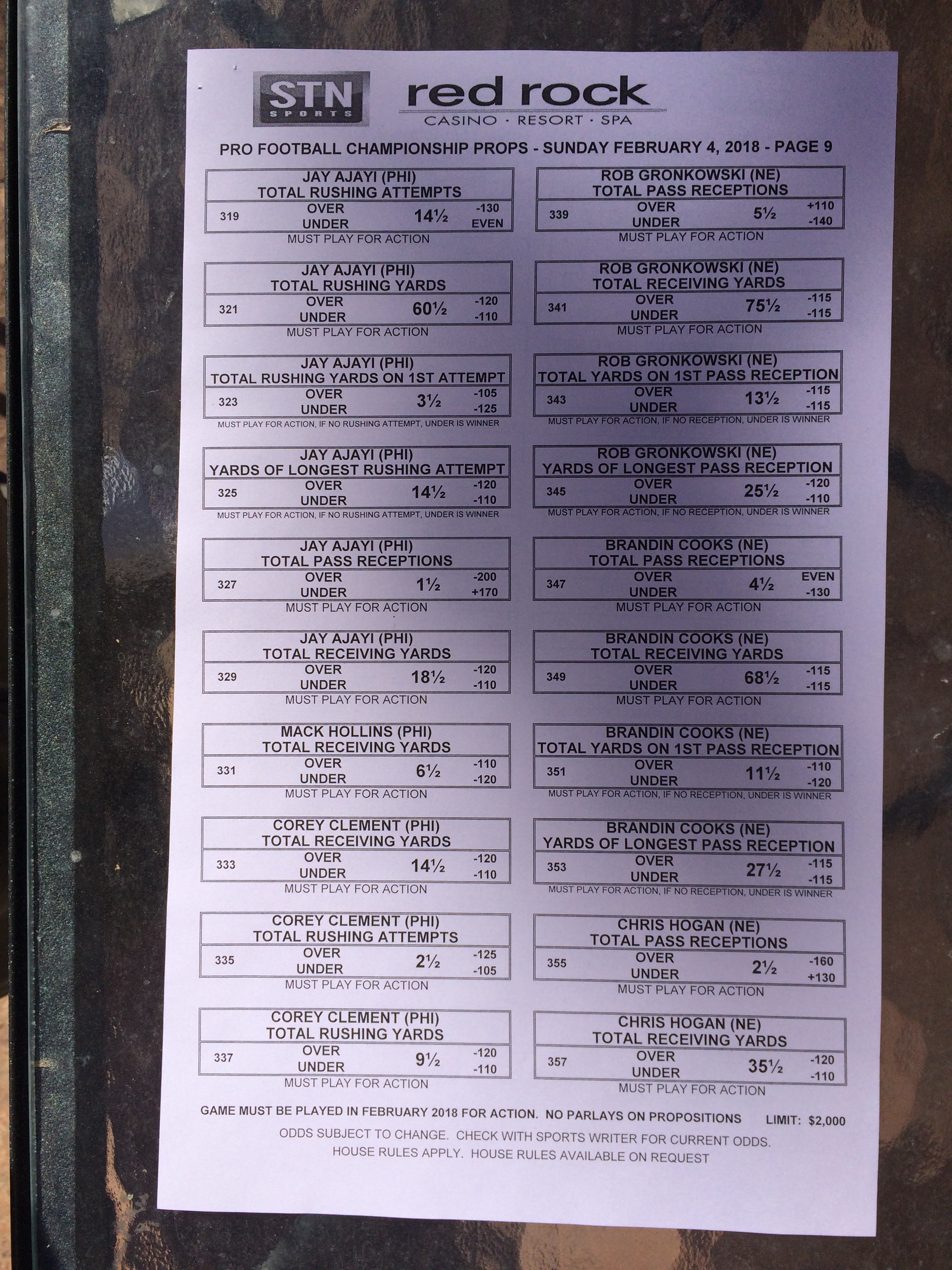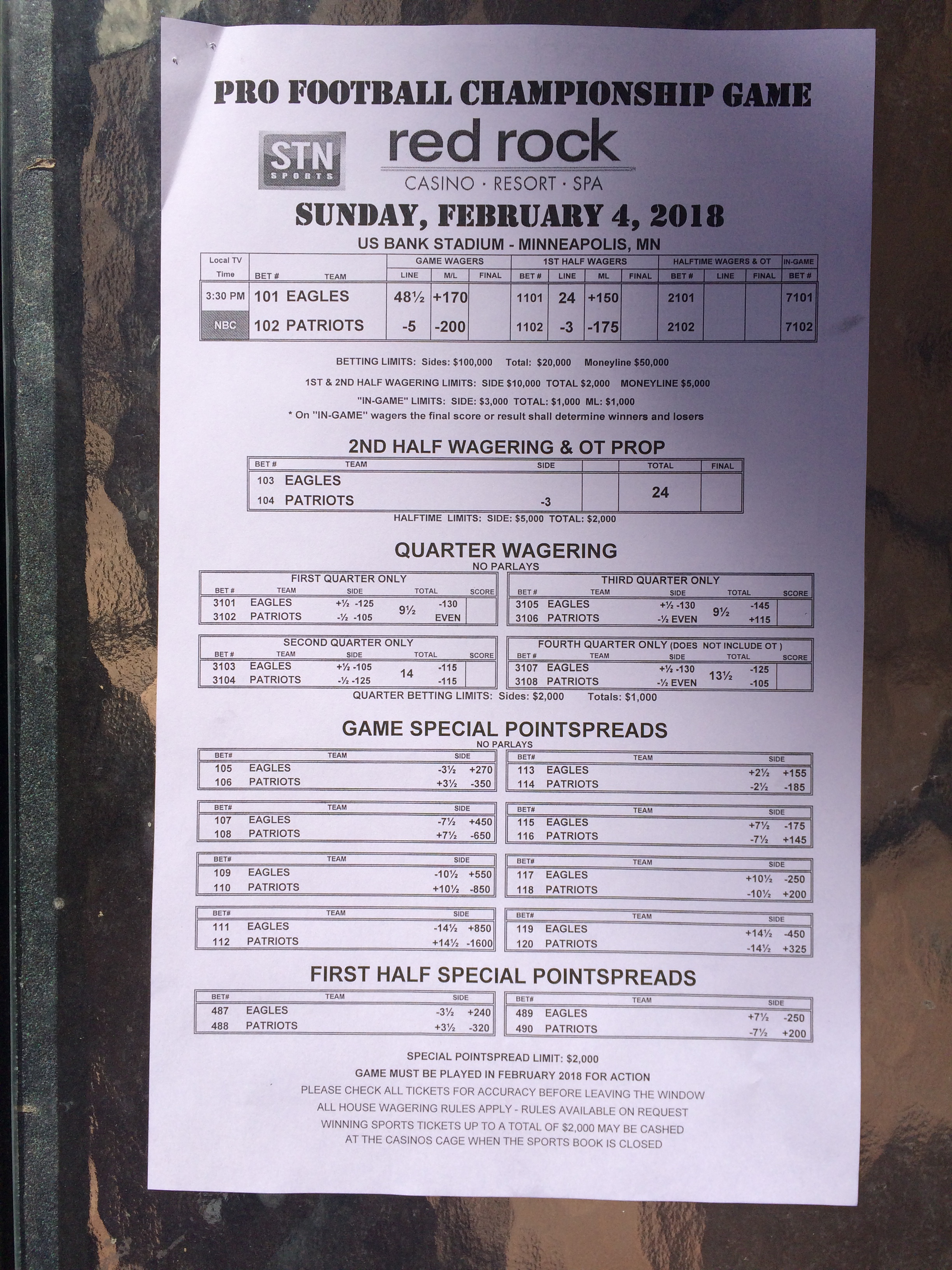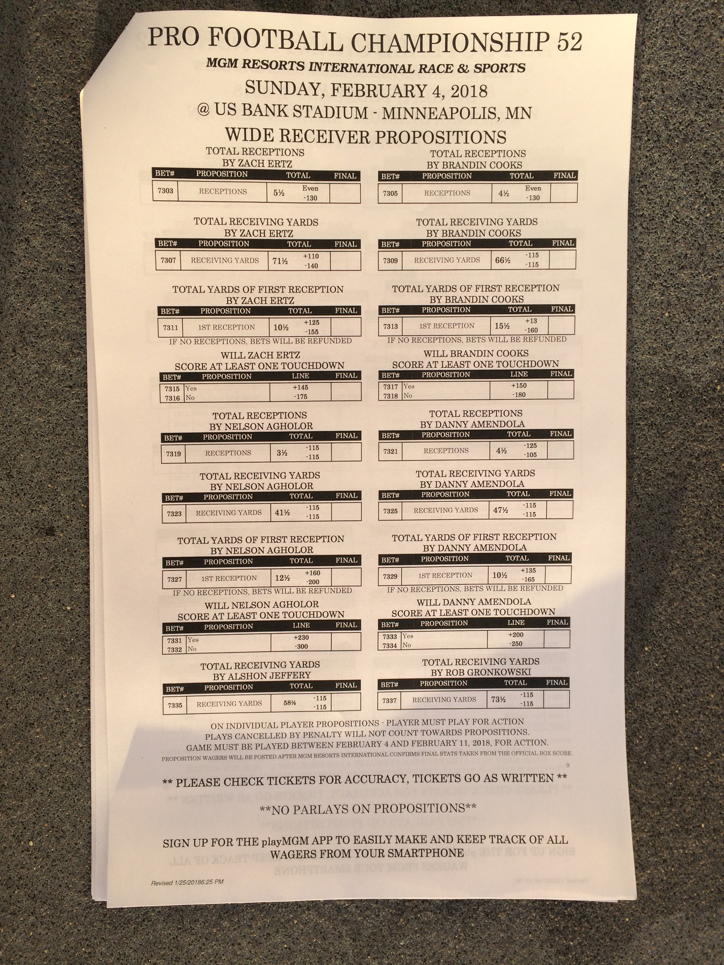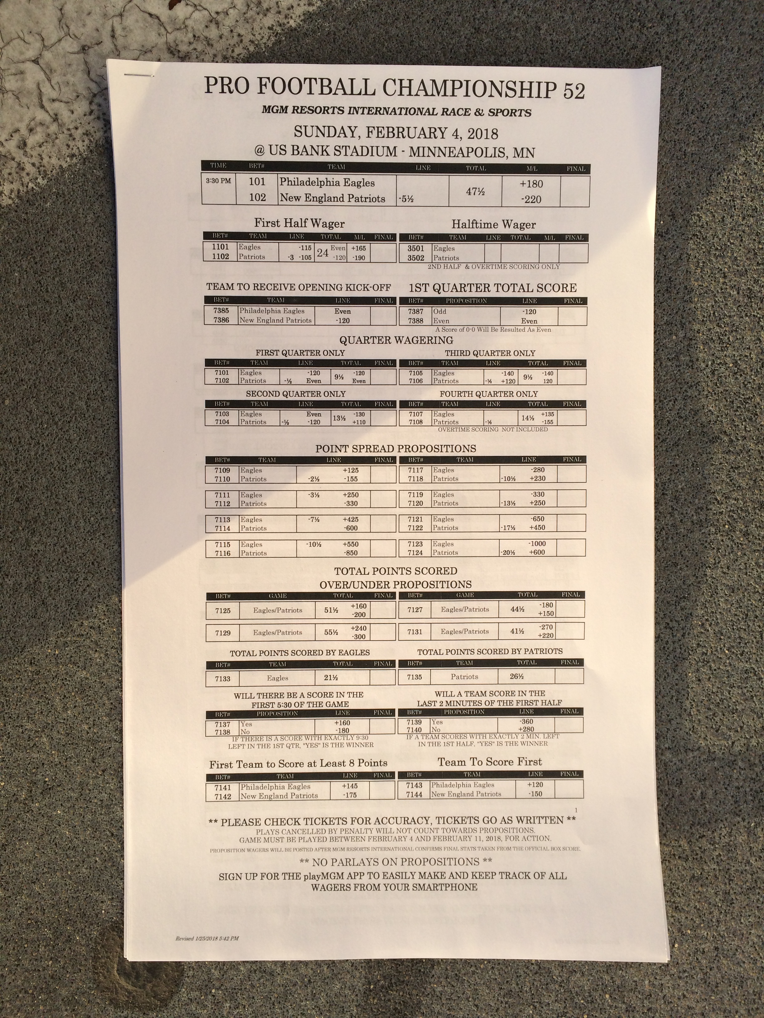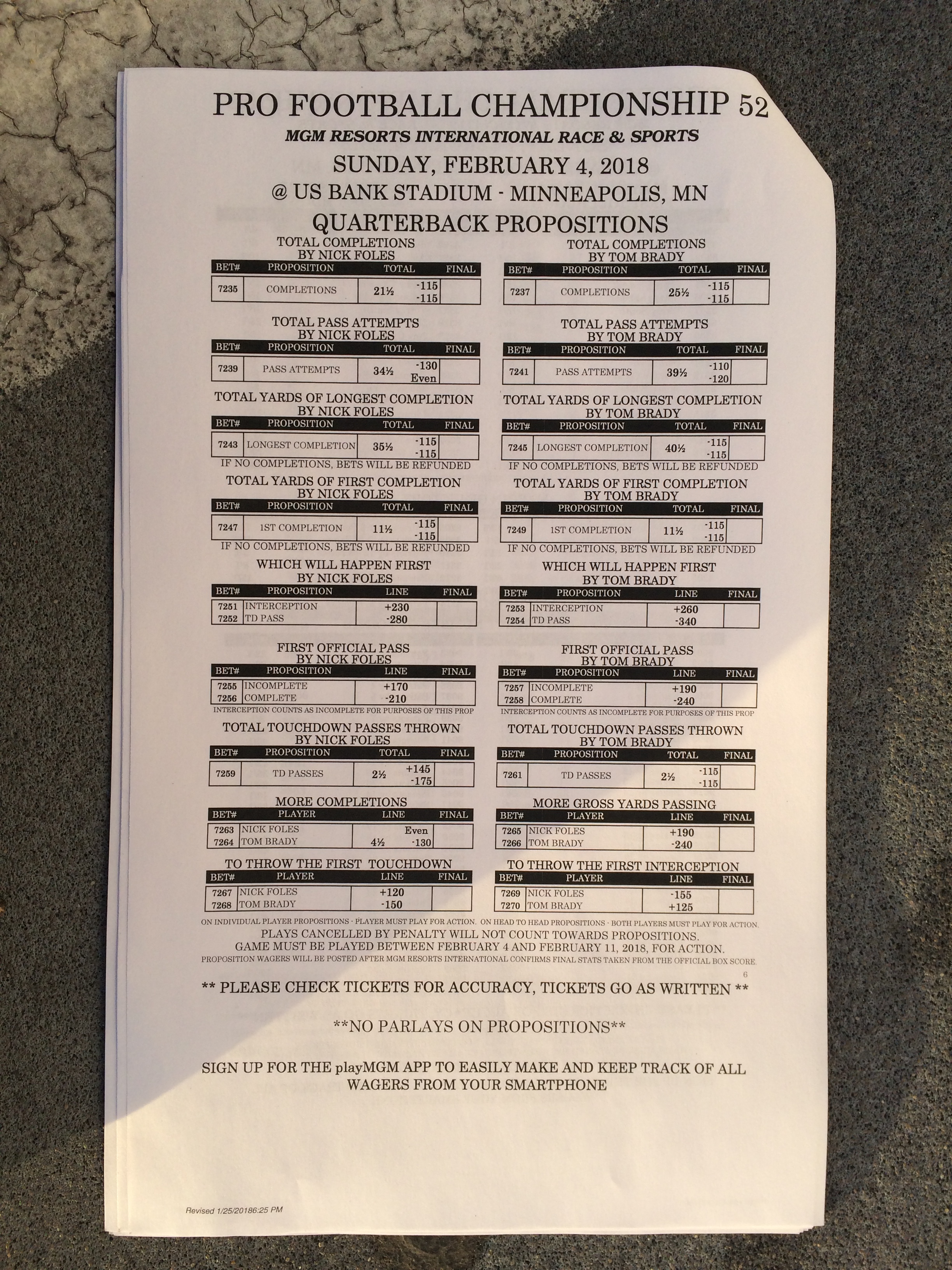 فيما يلي صور لكل صفحة من صفحات رهانات الاقتراحات لدى عدة مكاتب مراهنات رياضية في لاس فيغاس. جُمعت هذه الأوراق في ٢٧ يناير ٢٠١٨، أي قبل ثمانية أيام من المباراة.
