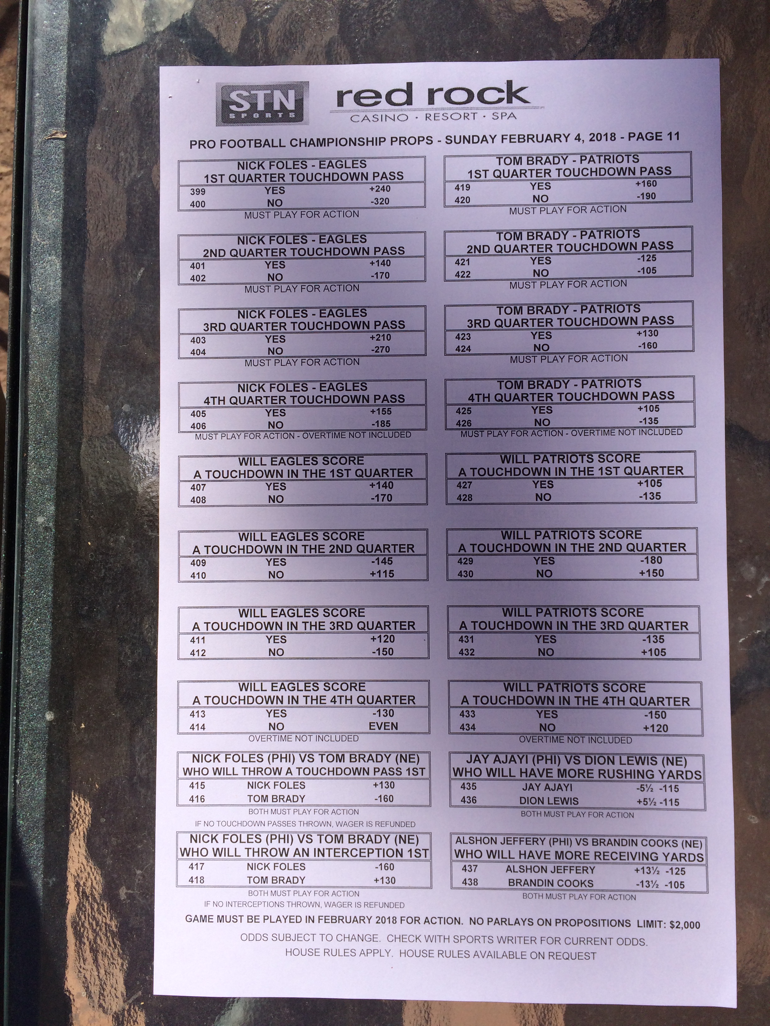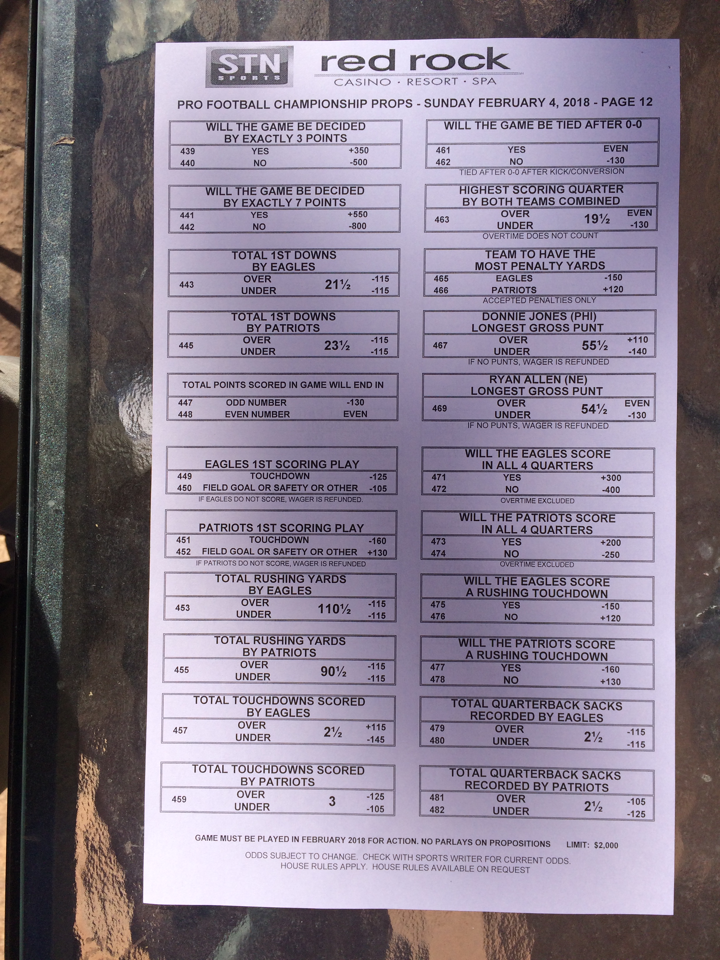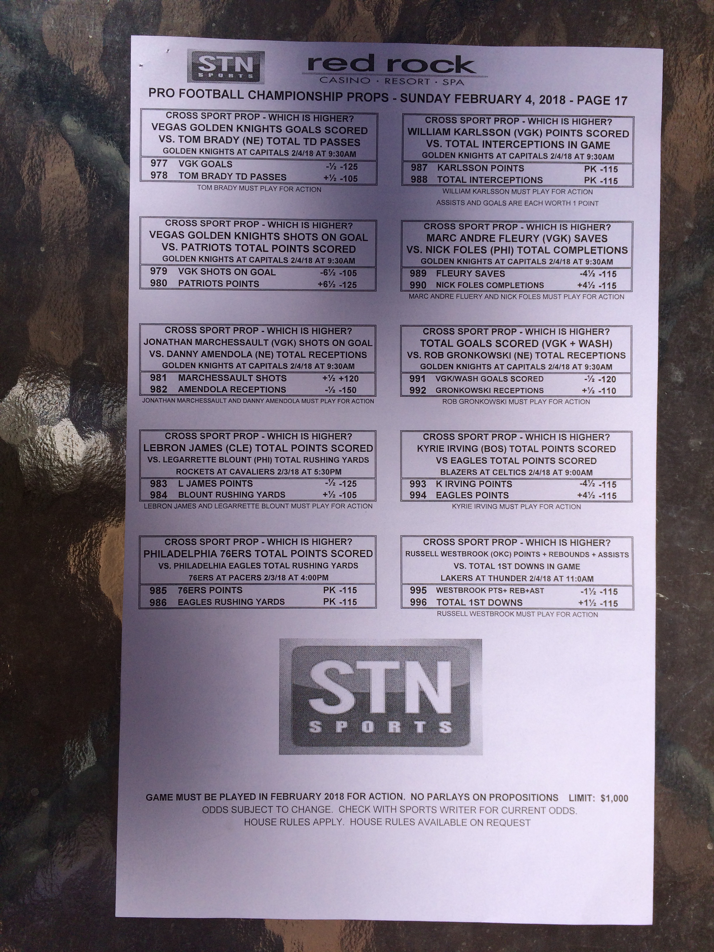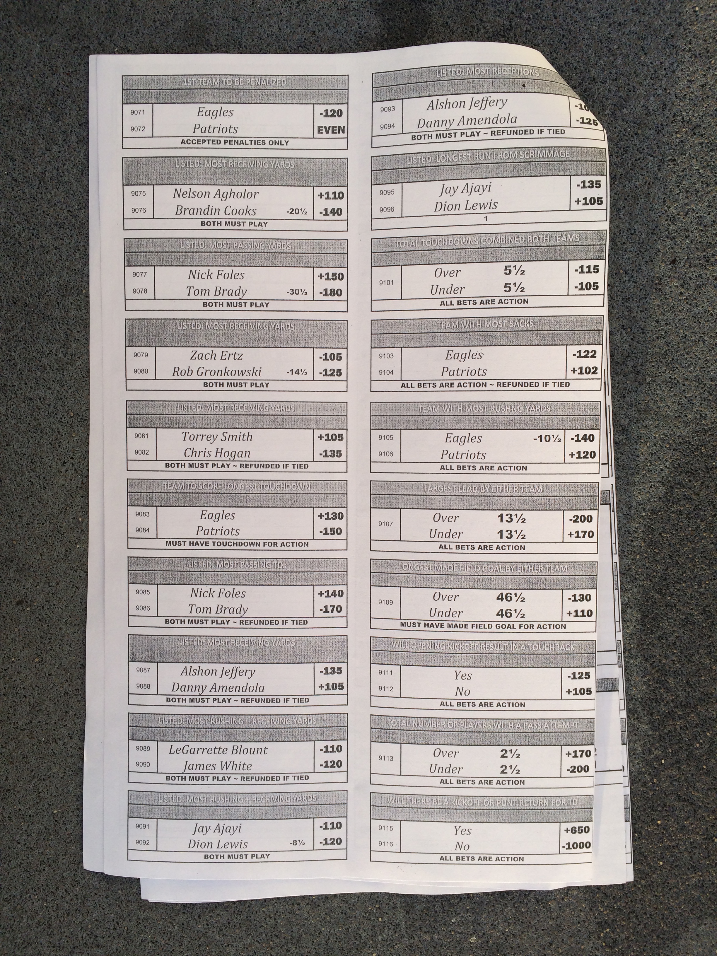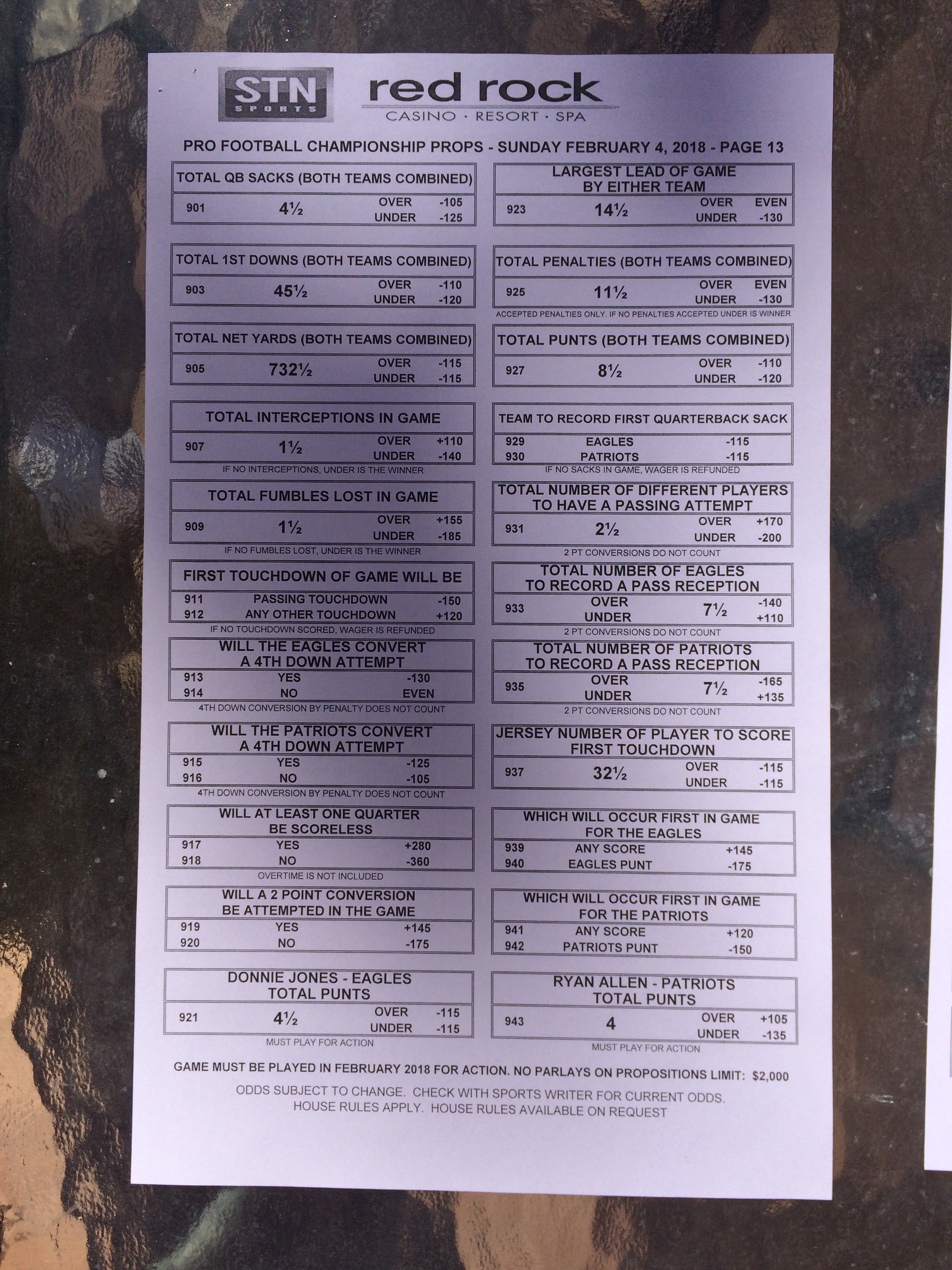 فيما يلي صور لكل صفحة من صفحات رهانات الاقتراحات لدى عدة مكاتب مراهنات رياضية في لاس فيغاس. جُمعت هذه الأوراق في ٢٧ يناير ٢٠١٨، أي قبل ثمانية أيام من المباراة.